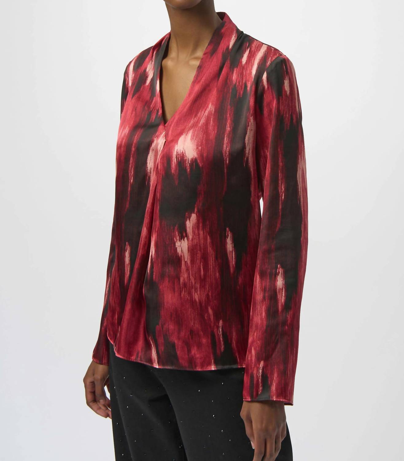 A versatile blouse that works from desk to dinner! Experience artistic elegance with the Joseph Ribkoff Satin Abstract Print Straight Top, a standout piece in black and red that brings flair to any dinner party occasion. With long straight sleeves and a refined V-neckline complemented by a subtle front pleat, this top offers a chic silhouette. Made from 100% Polyester satin knit fabric, it ensures both comfort and style. Closure: Pull-on. Care: Hand wash cold inside out with like colors, hang to dry in the shade, do not tumble dry, iron, bleach, or dry clean. Body length from high point of shoulder: 25 inches.