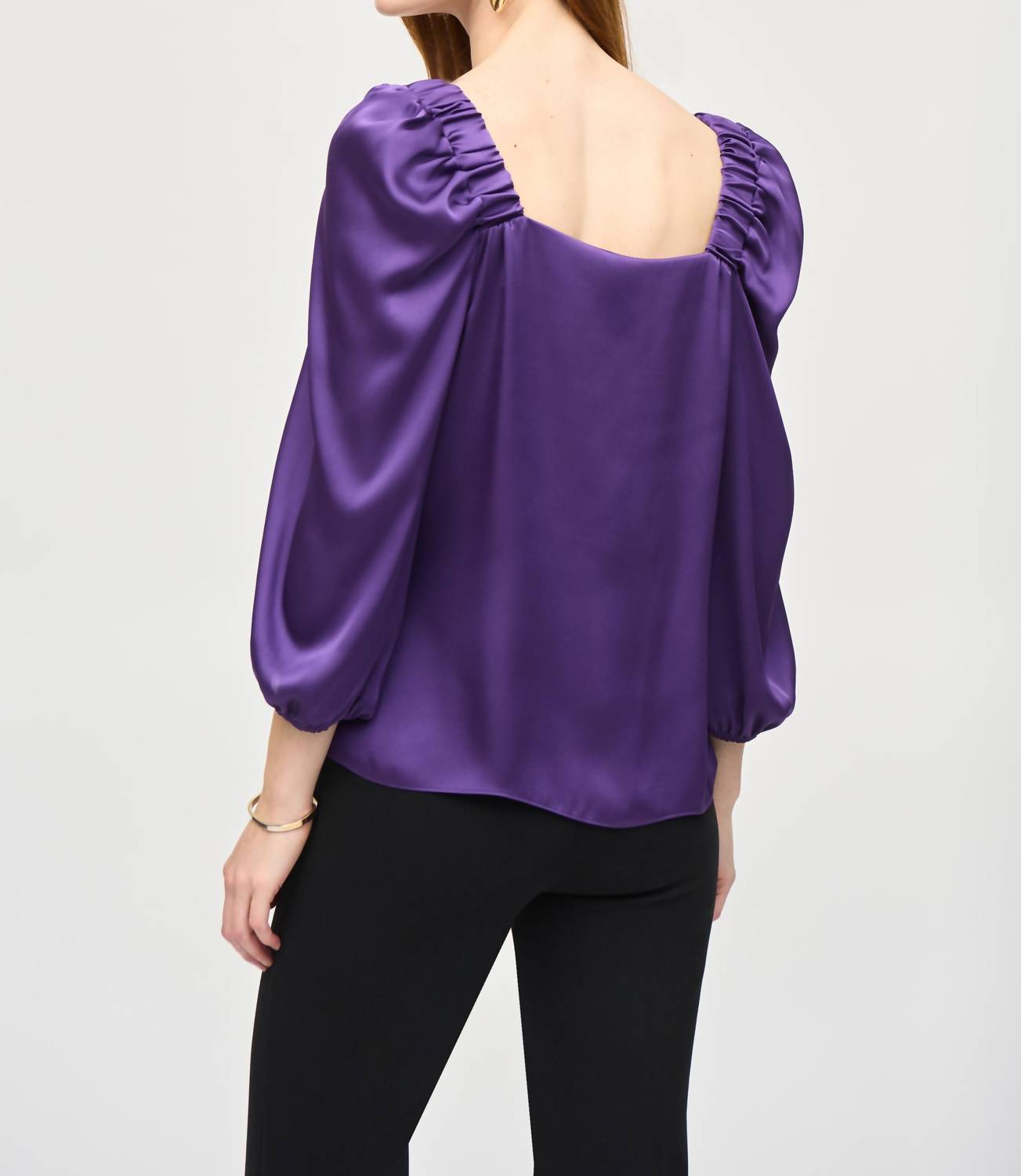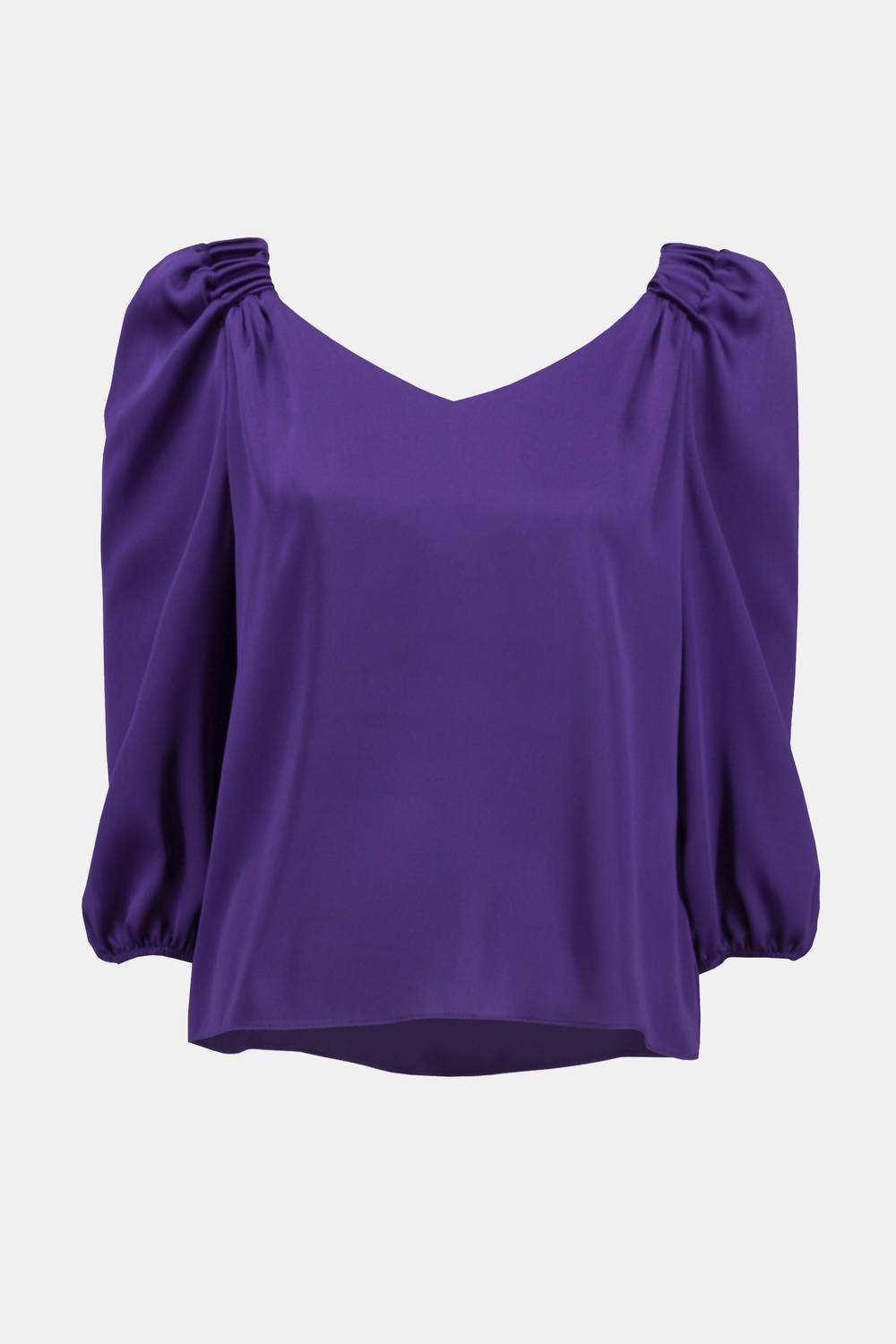 Pair this with your favorite jeans and slides for your next girls night out. Discover the Joseph Ribkoff Scoop V-neck Blouse in an elegant purple hue, perfect for travel and workwear. This stylish blouse features three-quarter puff sleeves and a regular fit, with a short length of approximately 24 inches (61 cm). Crafted from 100% polyester, the garment embodies both luxury and simplicity with its minimalist and ruched design. Made in Canada, it's easy to care for with a pull-on closure and should be hand washed and line dried for best results.