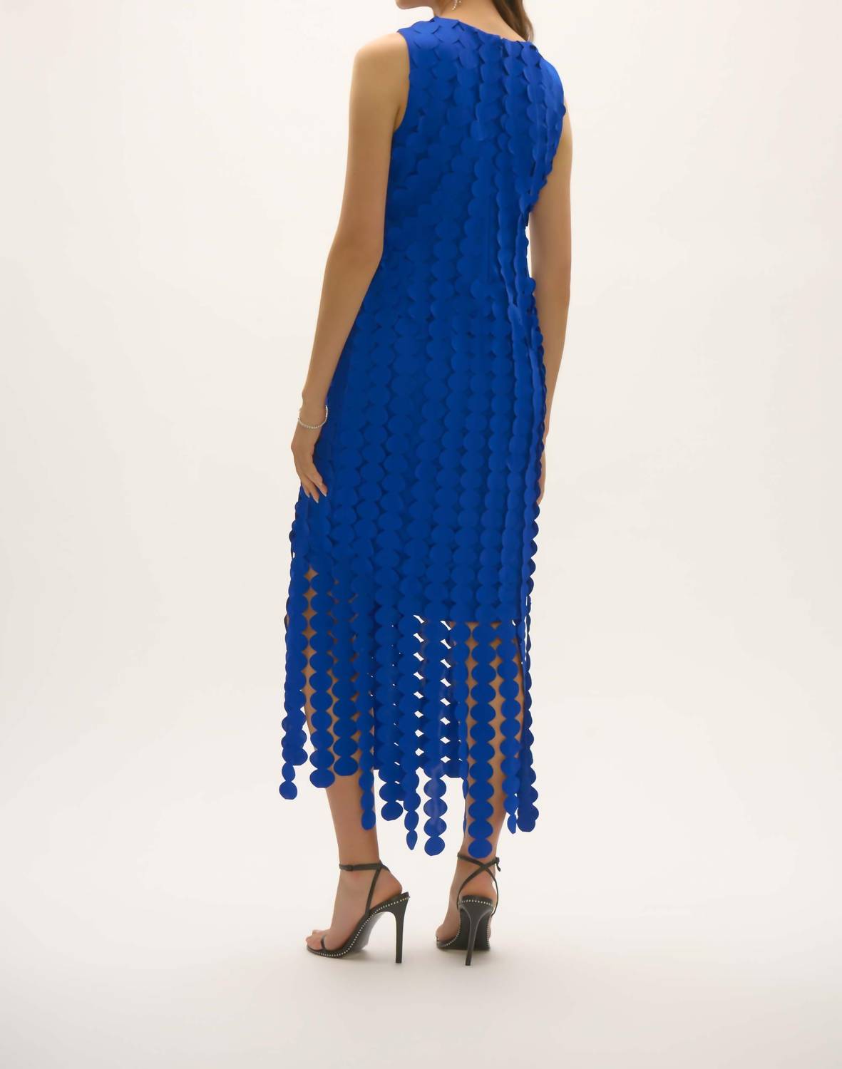 A midi dress so versatile, your options for wearing it are endless. Discover the exquisite Scuba Knit Dress With Circle Fringes by Joseph Ribkoff, a chic addition to your wardrobe. This sleeveless dress is crafted from 95% Polyester and 5% Spandex, offering comfort while maintaining its elegant sheath silhouette in stunning blue. Made for women who appreciate minimalist style, it features a crewneck and jeweled embellishments, perfect for cocktail parties or summer occasions. Closure: Back zip closure. Care: Dry Clean. Model is 5'9"/175 cm, wearing size 6; approximate length for size 12 is 48" (122 cm).