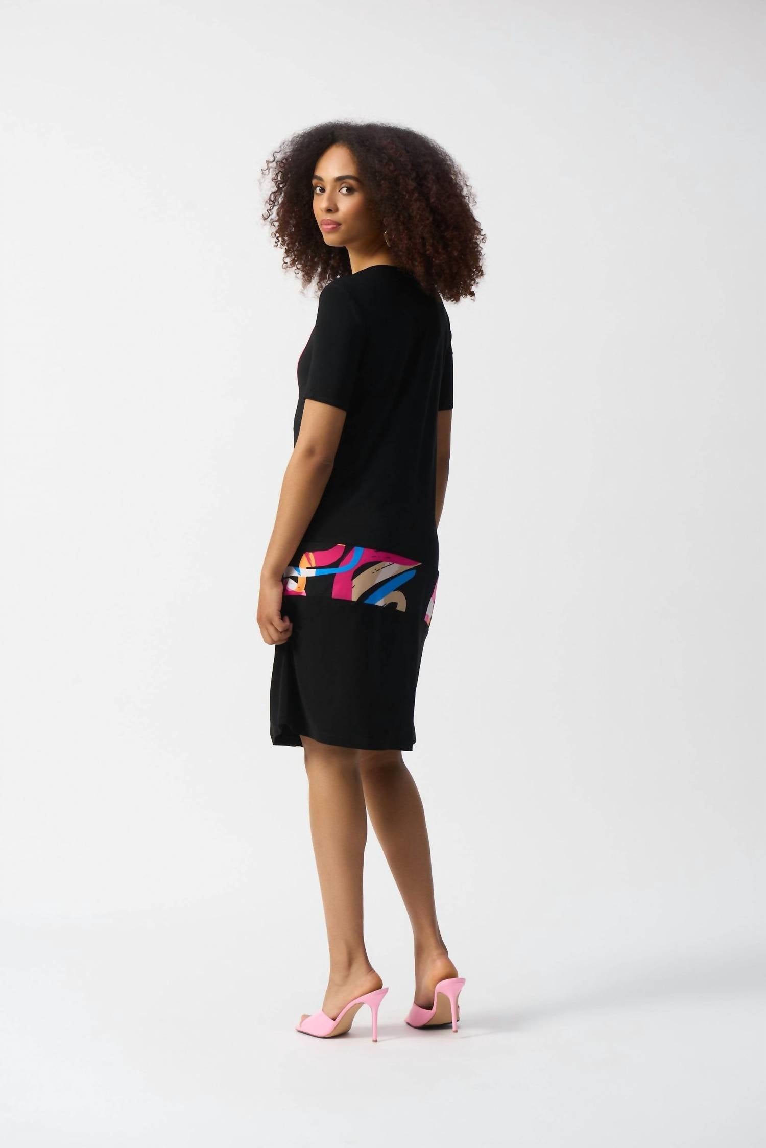 Comfortable and cute, this casual day dress has it all. Embrace style and comfort with the Joseph Ribkoff Silky Knit Abstract Print Trapeze Dress in Black/Multi. This dress features a playful graphic pattern and an A-line silhouette with a scoopneck, making it an elegant choice for holiday parties or spring events. The short sleeves, 96% Polyester, 4% Spandex composition, and pull-on closure offer an easy, polished look. Care for this dress easily by hand washing and line drying.