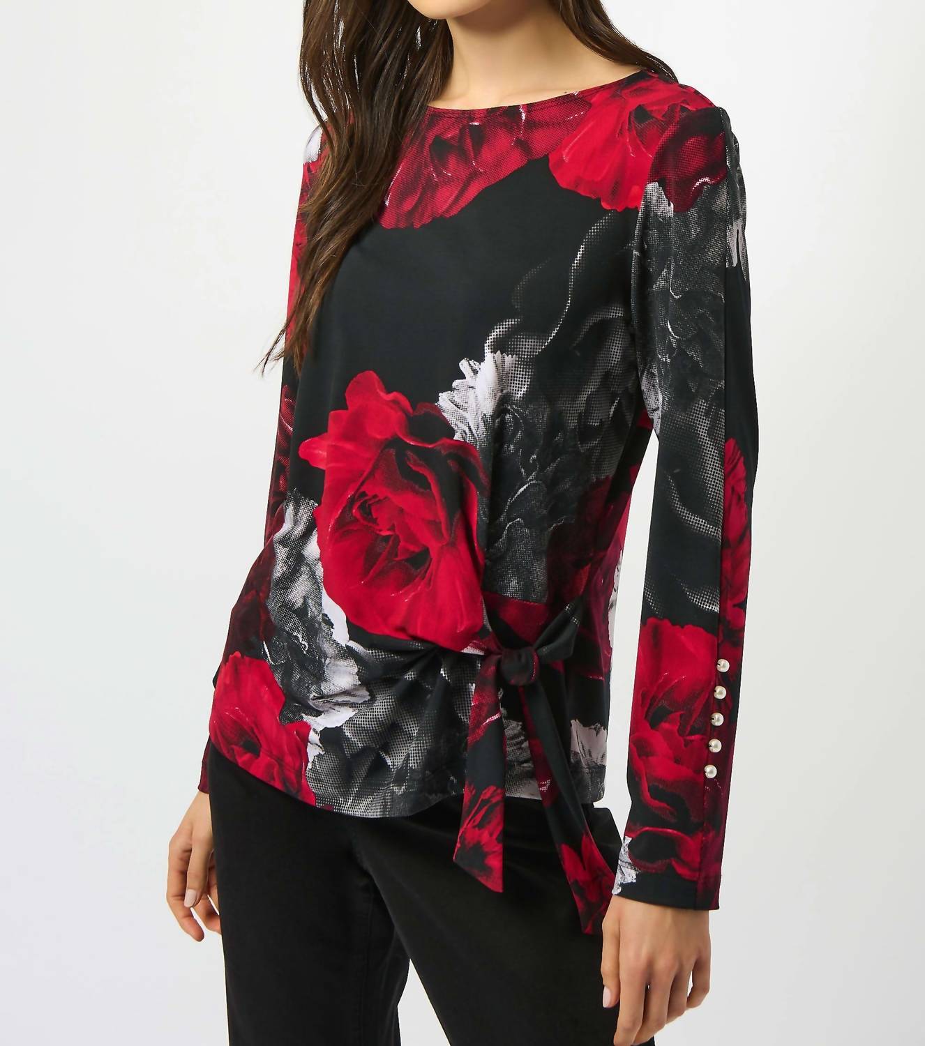 Great fit, cute design, soft fabric. You'll love everything about this long sleeve tee. Discover the Joseph Ribkoff Silky Knit Floral Printed Top, an elegant addition to your spring wardrobe in a chic black/red floral pattern. Featuring a stylish boatneck and long sleeves adorned with pearl buttons, this top is made from a luxurious blend of 95% Polyester and 5% Spandex, providing a comfortable and flattering fit. The pull-on style includes a waist tie for added shape, making it perfect for vacation or Easter gatherings. Care is simple: hand wash in cold water with like colors, avoid bleach, and line dry in the shade.