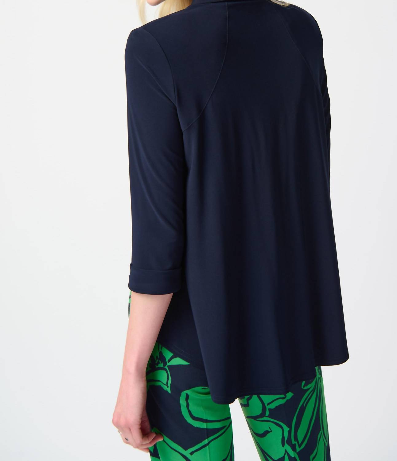 Throw this adorable cardigan over any cami or tank top. The Silky Knit Shawl Collar Cover-up Cardigan by Joseph Ribkoff offers a modern take on the classic cardigan with its high-low hem and structured profile. Crafted from a silky knit fabric composed of 96% Polyester and 4% Spandex, it features three-quarter cuff sleeves and back shoulder yokes. The shawl collar adds an elegant touch, making it a versatile addition to any ensemble. Care is simple: hand wash in cold water, hang to dry, and iron on low if necessary. Model is 5'11" and is wearing a size 6.