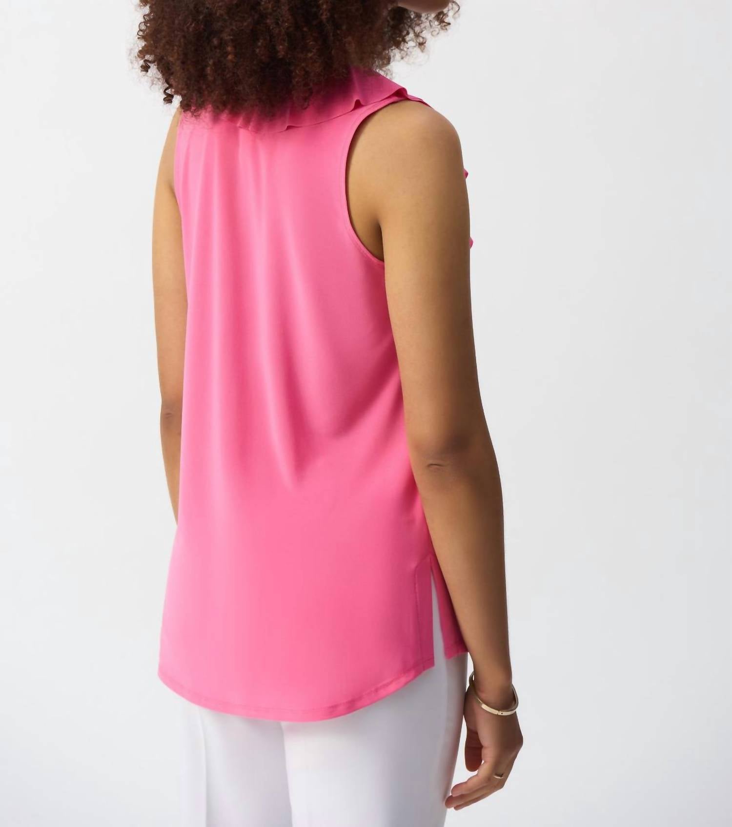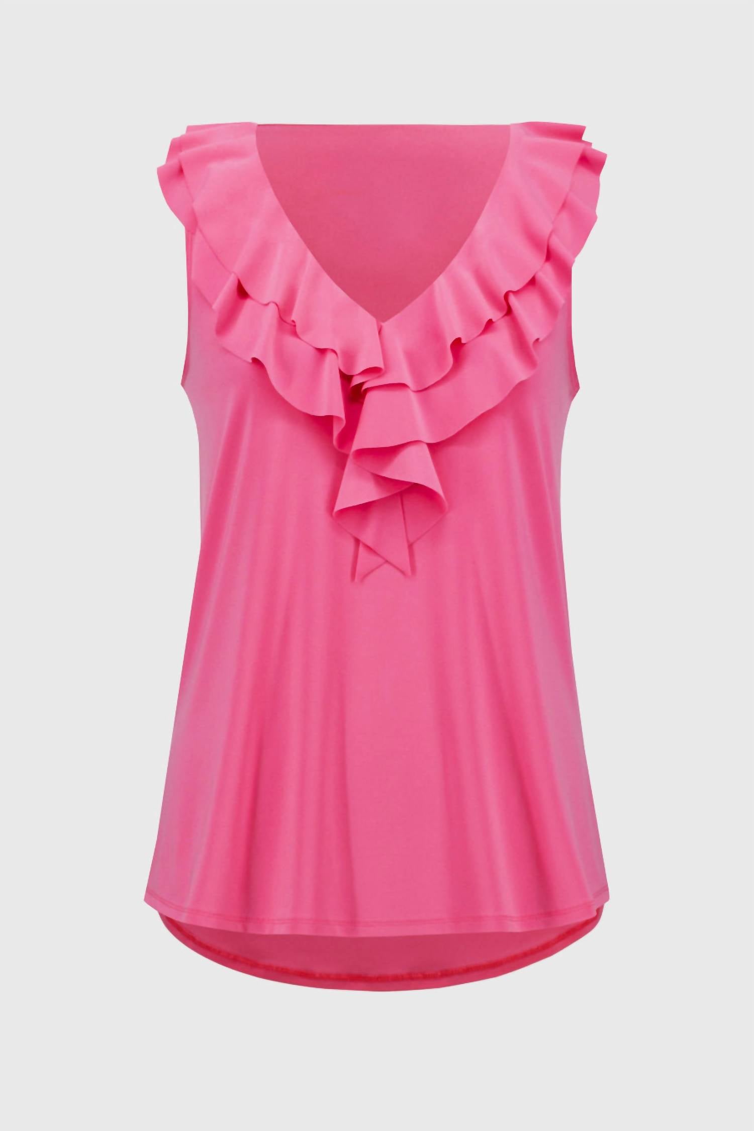 A perfect addition to any wardrobe, this classic tunic style blouse is flattering and effortless. You can easily transition from desk to dinner in this chic top. Elevate your holiday party look with the Silky Knit Sleeveless Tunic With Ruffles by Joseph Ribkoff, crafted in a vibrant Bubble Gum hue. This tunic showcases a sleeveless design complemented by a flattering V-neckline and elegant ruffles, perfect for minimalist styling. Made from smooth 96% Polyester, 4% Spandex, it features a convenient pull-on closure. Care for this tunic with ease by hand washing and line drying for best results.