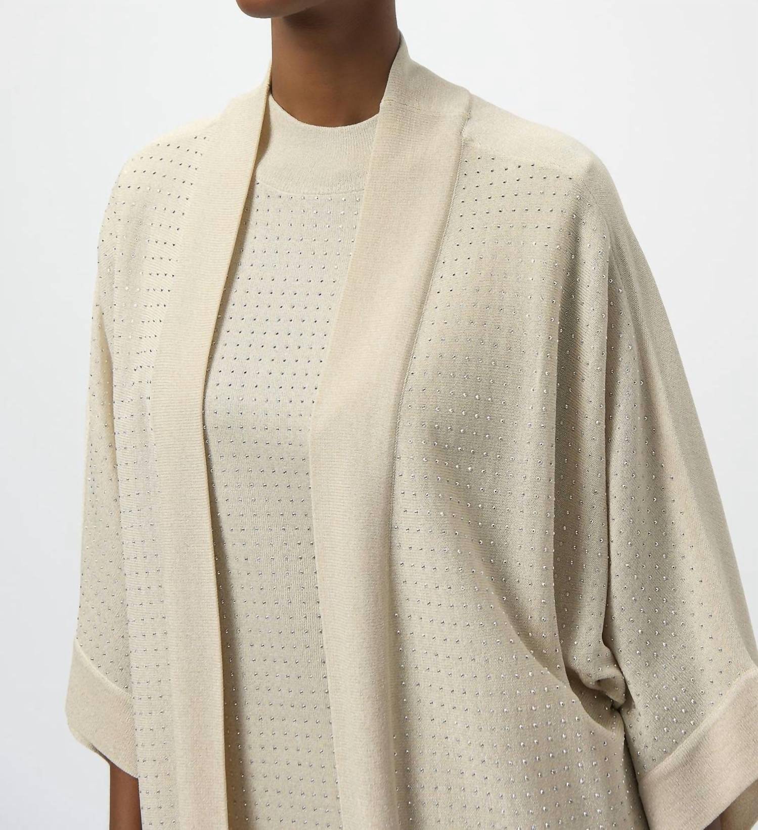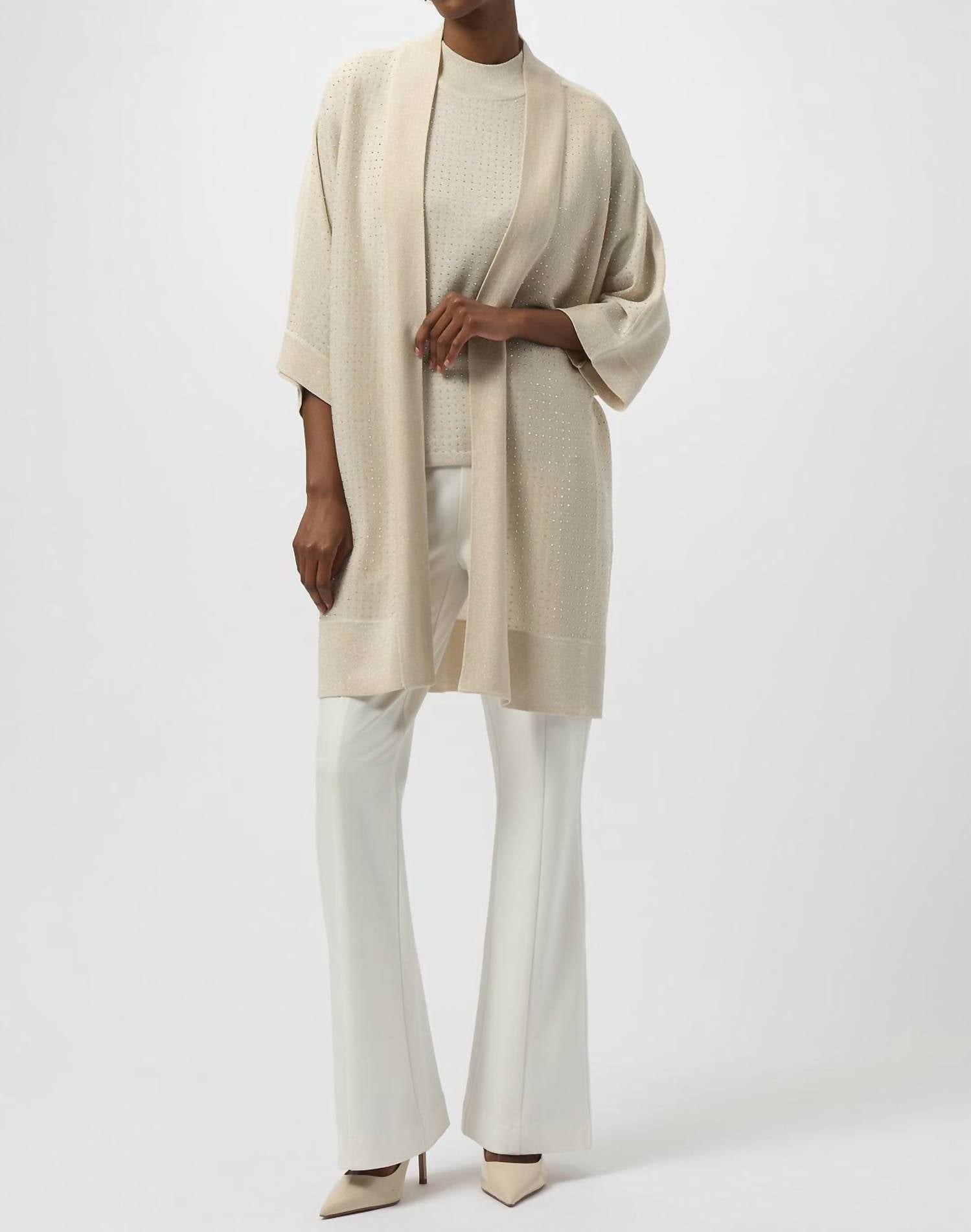 A classic fit that works just as good buttoned as it does left open. Wrap yourself in style with the Joseph Ribkoff Sweater Knit Cover-Up, featuring long sleeves and an elegant open front design. Crafted from a luxurious blend of 67% Viscose rayon, 12% Nylon, and 21% Metal fibre, this beige cover-up falls gracefully to a flattering 33" length from shoulder. The shimmering iron-on detailing adds a playful touch to this textured cardigan, perfect for fall occasions. With a versatile V-neck and minimalist trend appeal, care for this piece by hand washing in cold water and laying flat to dry. Model is 5'9.5" and wearing a size 4/Small.