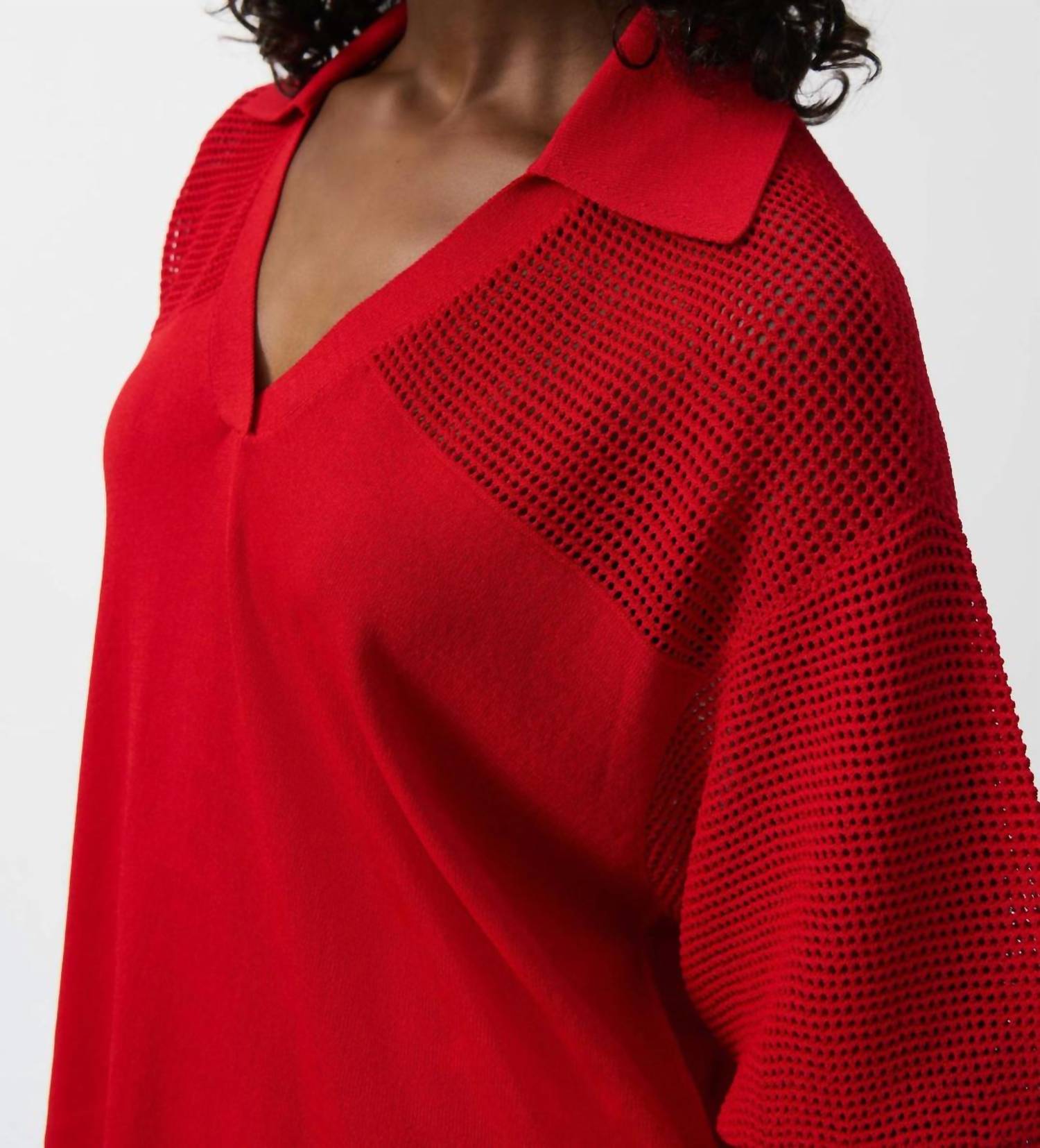 A timeless v-neck sweater that works season after season. Introducing the Joseph Ribkoff Sweater Knit Pullover in Radiant Red, a chic addition to your holiday wardrobe. Highlighting short puff sleeves and a V-neckline, this hip-length top is crafted for both comfort and effortless style. Composition: 65% Viscose Rayon, 35% Nylon. Closure: Pull on style, with an approximate length of 25" (64 cm) for size 12. Care: Hand wash and lay flat to dry. Our model is 5'9" (175 cm) and wears a size 6.
