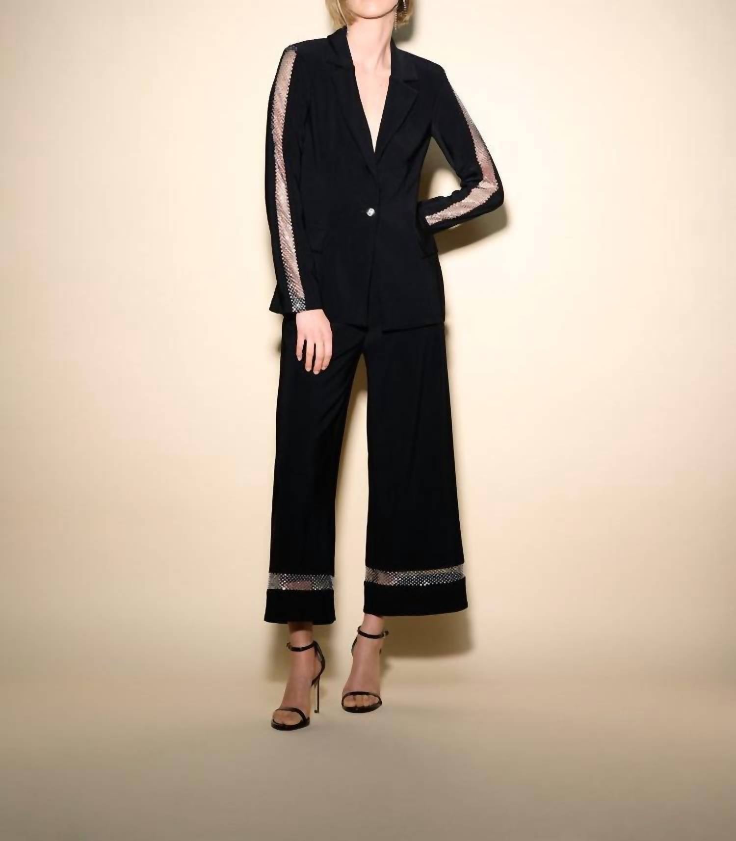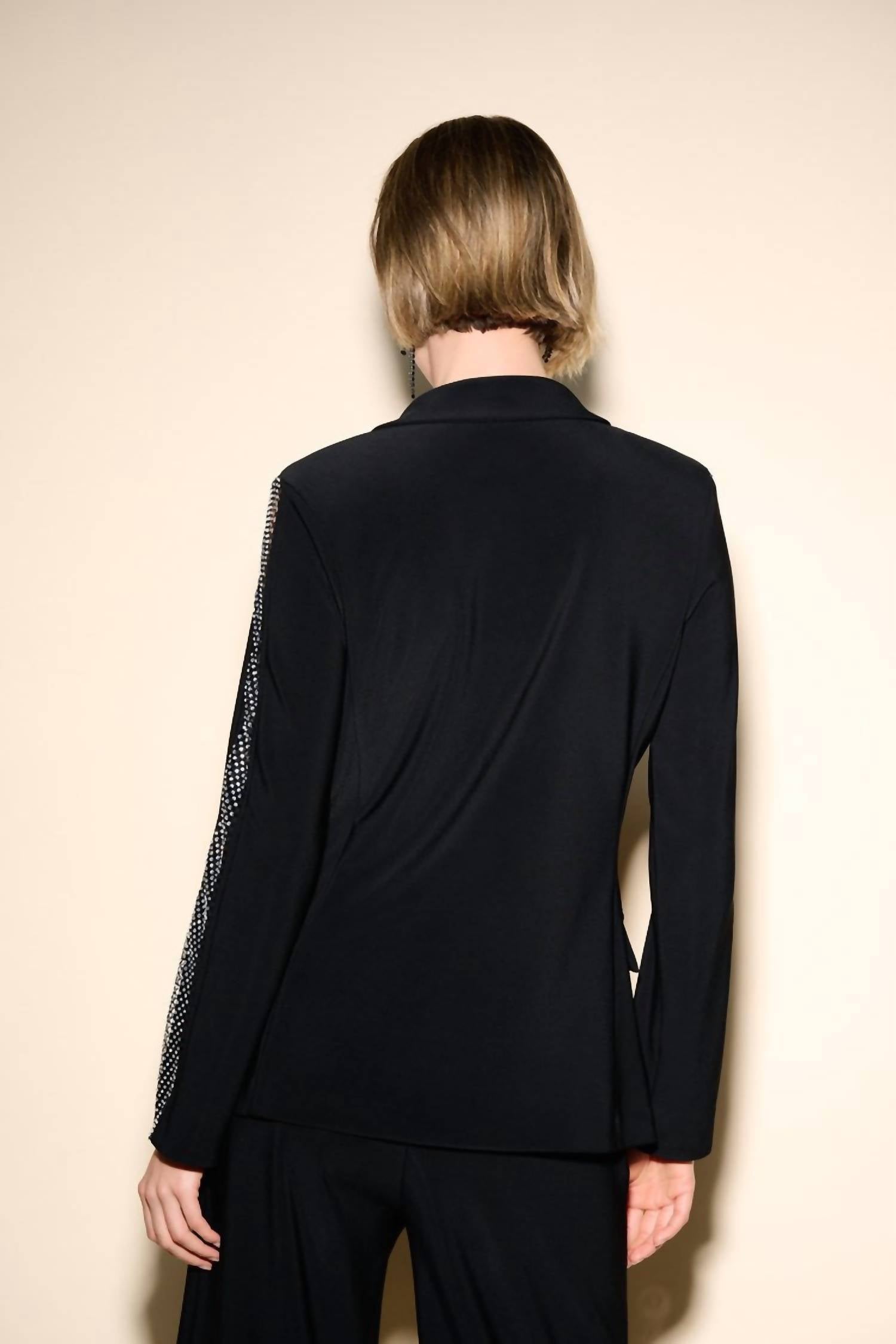 A blazer so versatile you can wear it to the office or pair it with jeans for a more casual look. Elevate your evening ensemble with the Women's Bonded Silky Knit Collar Blazer by Joseph Ribkoff, designed for both style and sophistication. Featuring long statement sleeves with a sheer net insert and shoulder pads for a structured silhouette, this blazer ensures a polished look. Composition includes 96% Polyester and 4% Spandex, with a pull-on closure and bonded silky knit fabric, adorned with a unique clear rhinestone trim and a single rhinestone button for subtle glamour. Care instructions are straightforward: hand wash in cold water with like colors, hang to dry in the shade, avoiding tumble drying, ironing, or dry cleaning.