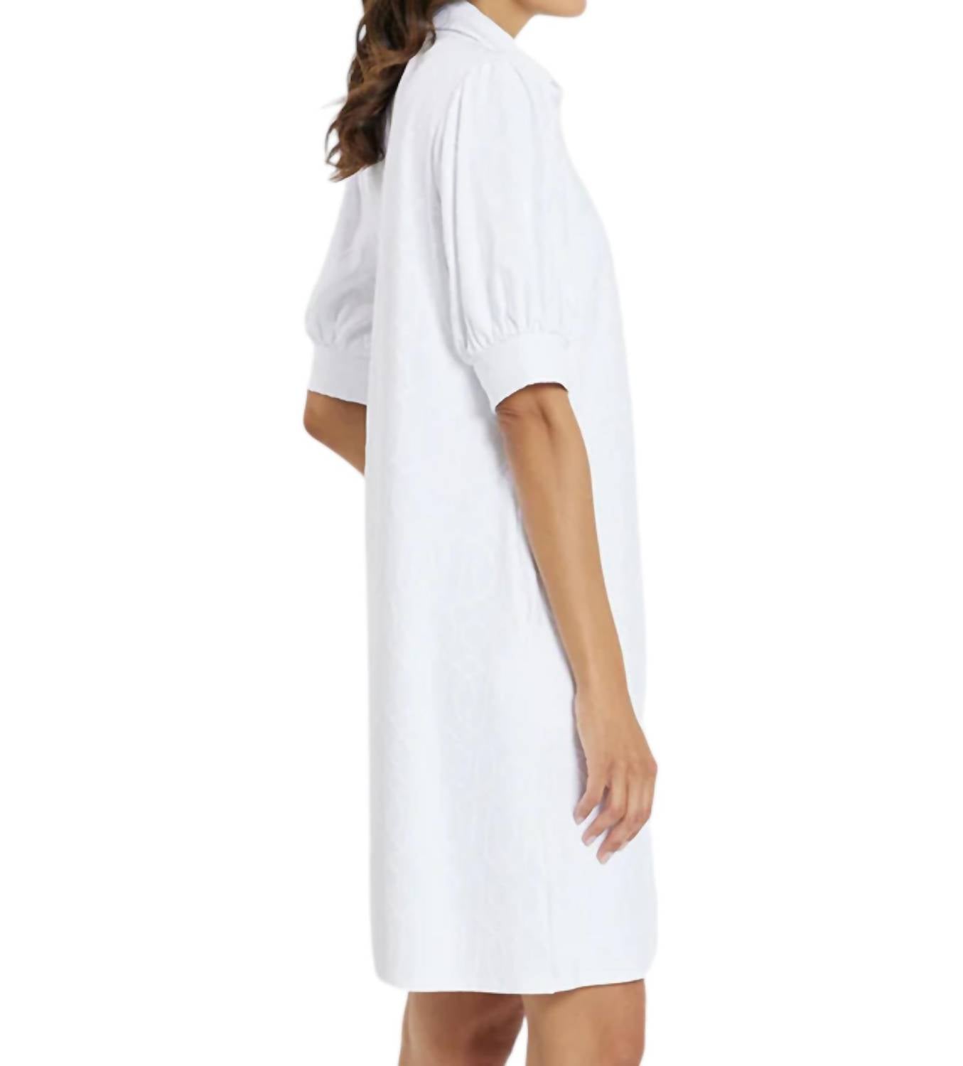 Designed to effortlessly elevate your style. Crafted from a luxurious Lightweight Jude Cloth. Mini dress offers both comfort and sophistication. Elegant collar neckline and chic elbow sleeves. Garden Gate White hue adds a fresh, modern touch. Slip into this pull-on dress for an effortless yet polished look. Embodies timeless elegance. Embrace its easy-care fabric. Made proudly in US. Enjoy the perfect blend of style and practicality.