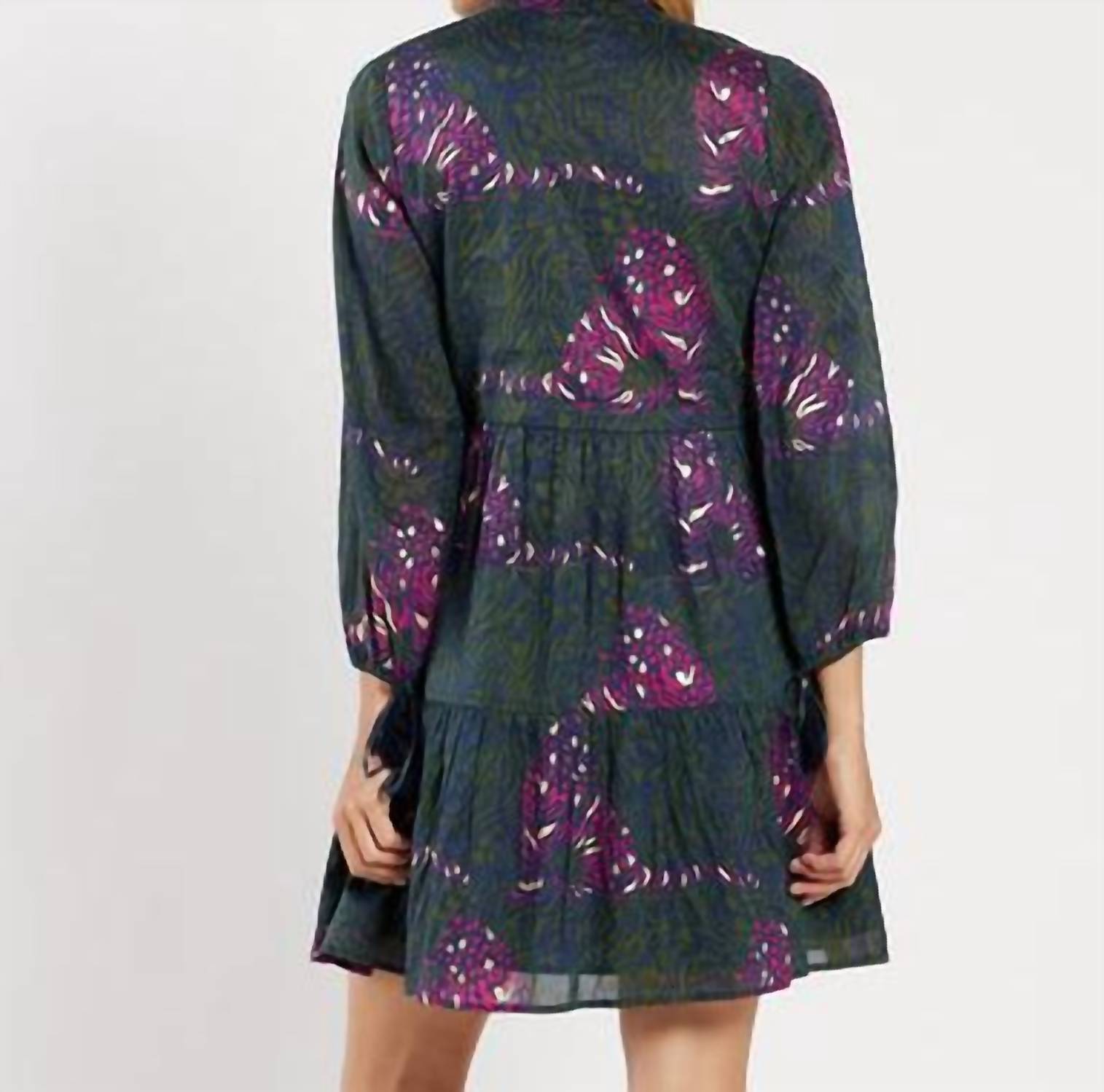 Just add slides or mules and you are good to go. Introducing the Monaco Midi Dress by Jude Connally, an elegant addition to your wardrobe in Grand Tiger Navy Gold. This midi-length dress features three-quarter sleeves with chic tassel details and a flattering V-neckline, crafted for effortless style and comfort. Made from cotton voile, its tiered A-line silhouette comes from skilled artisans in India, offering unique variations in print and color. Closure: Pull-on style.