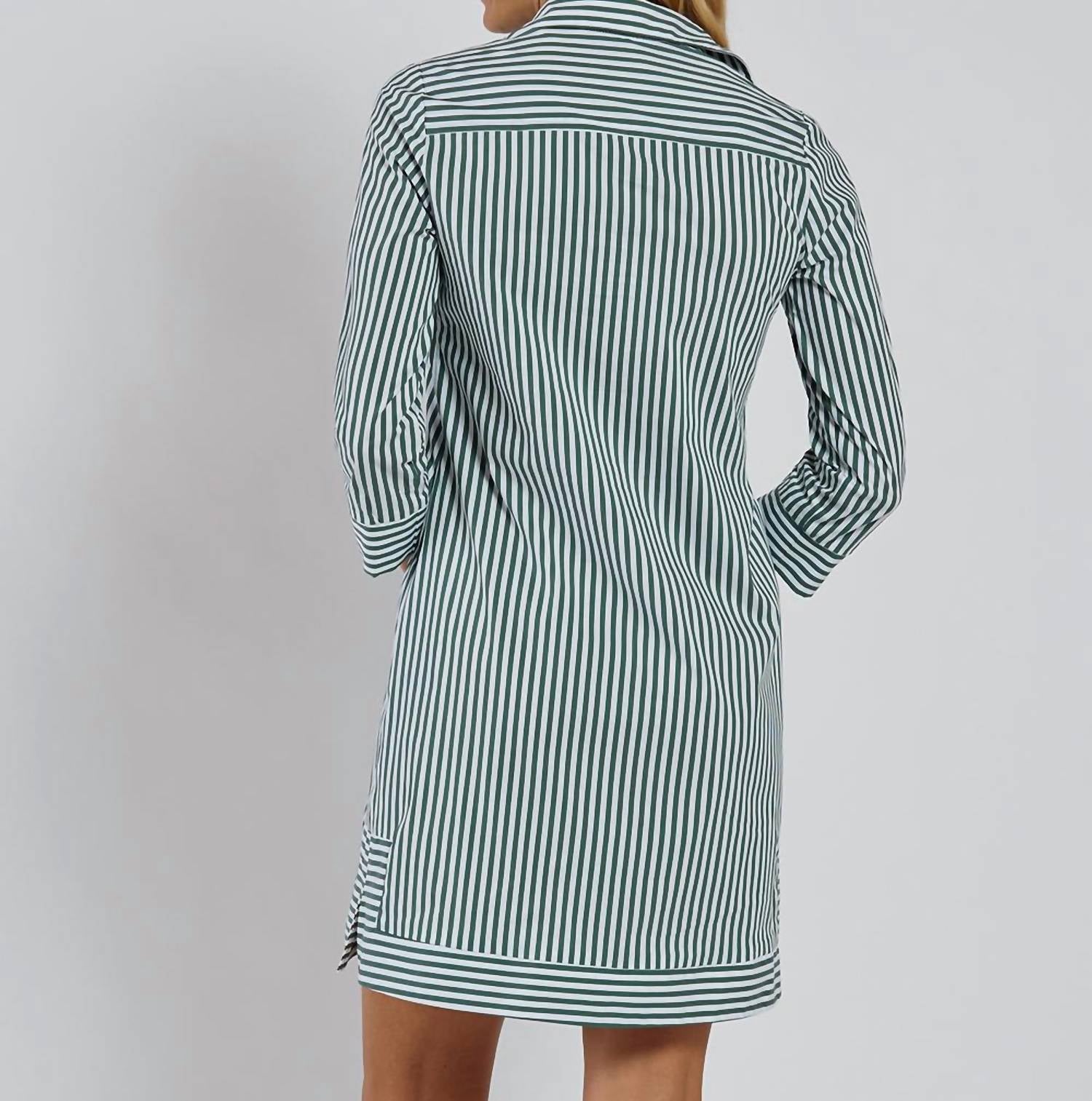 The perfect mini dress for those warmer months. Discover the timeless elegance of the Finley Mini Dress by JUDE CONNALLY, a preppy shift dress that combines modern chic with everyday versatility. This knee-length dress features three-quarter sleeves and a classic collared neckline, in the stylish Cotton Eden Green Stripe pattern. Crafted for easy wear, it offers a pull-on closure and is ideal for spring days. Care instructions: Machine wash.