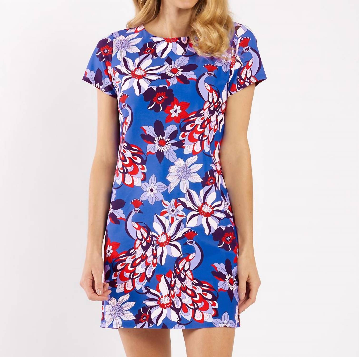 The kind of easy and flattering dress you'll be reaching for all season long. Introducing the JUDE CONNALLY Ella Mini Dress, a perfect shift dress designed for both work and play. This women's dress has short sleeves and a crewneck, crafted from a comfortable nylon/spandex blend, ensuring easy wear and a flattering fit. Made in the U.S.A, this patterned dress in the Twirling Peacock Cobalt color combines timeless charm with a modern touch. Its pull-on closure and minimalist care requirements, including machine washable fabric, make it ideal for vacation and any celebrations.