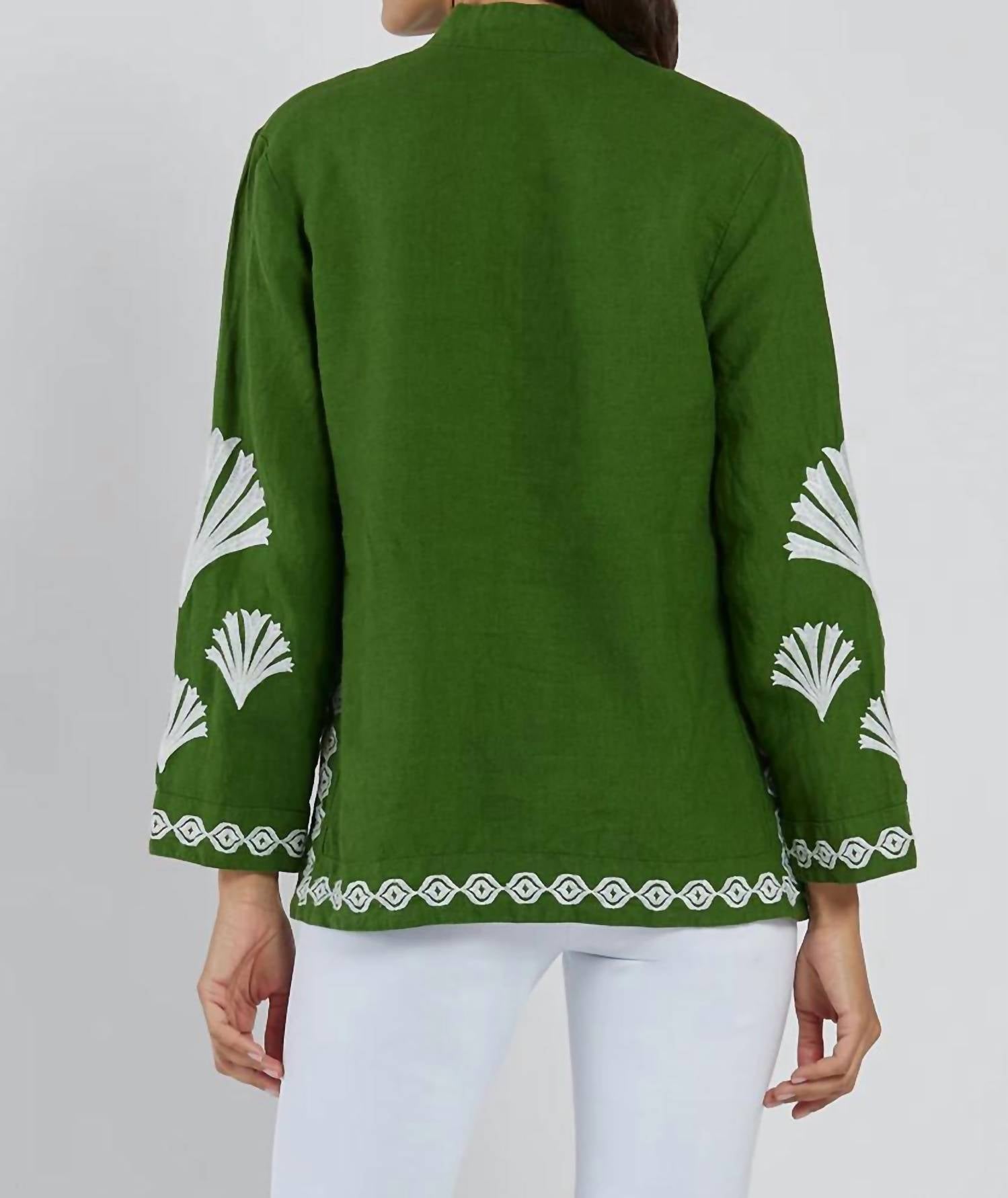 A versatile blouse that works from desk to dinner! Meet the Elyce Embroidered Linen Top by Jude Connally, a sophisticated piece in garden green and white designed to enhance your wardrobe. This blouse features a flattering V-neck and long sleeves, offering a touch of boho chic style perfect for anniversary occasions. Made from breathable linen and handcrafted by artisans, it is a stylish solution for comfort in the summer months. Closure: Pull on. Care: Machine wash, line dry.