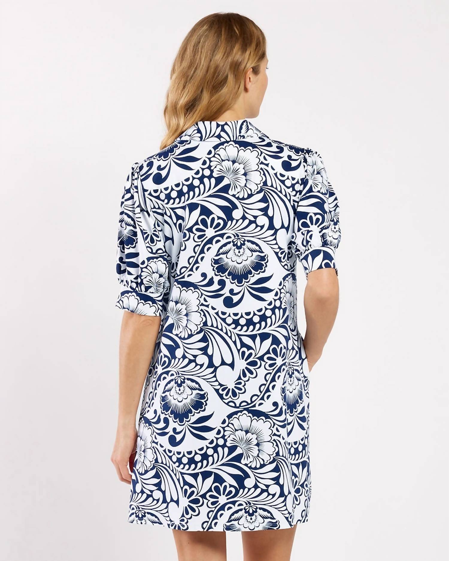 The kind of easy and flattering dress you'll be reaching for all season long. Emerson is a bestseller for a good reason! This modern style features a V-neckline, puff sleeves, and convenient pockets. A darling addition to your wardrobe, perfect for both dressing up or down.  For a closer, more flattering fit, we recommend sizing down. If you prefer additional length, explore our long option, providing an extra 3 inches. In our signature Jude Cloth fabric. EasyCare, EasyWear. Made in the U.S.A. Details & Fit: V-neck and puff sleeve detail. Regular Length- 35" from top of center back (Size S) Long Length- 38" from top of center back (Size S) Model is 5'9 and wearing a size Small.  Color - Navy and White.