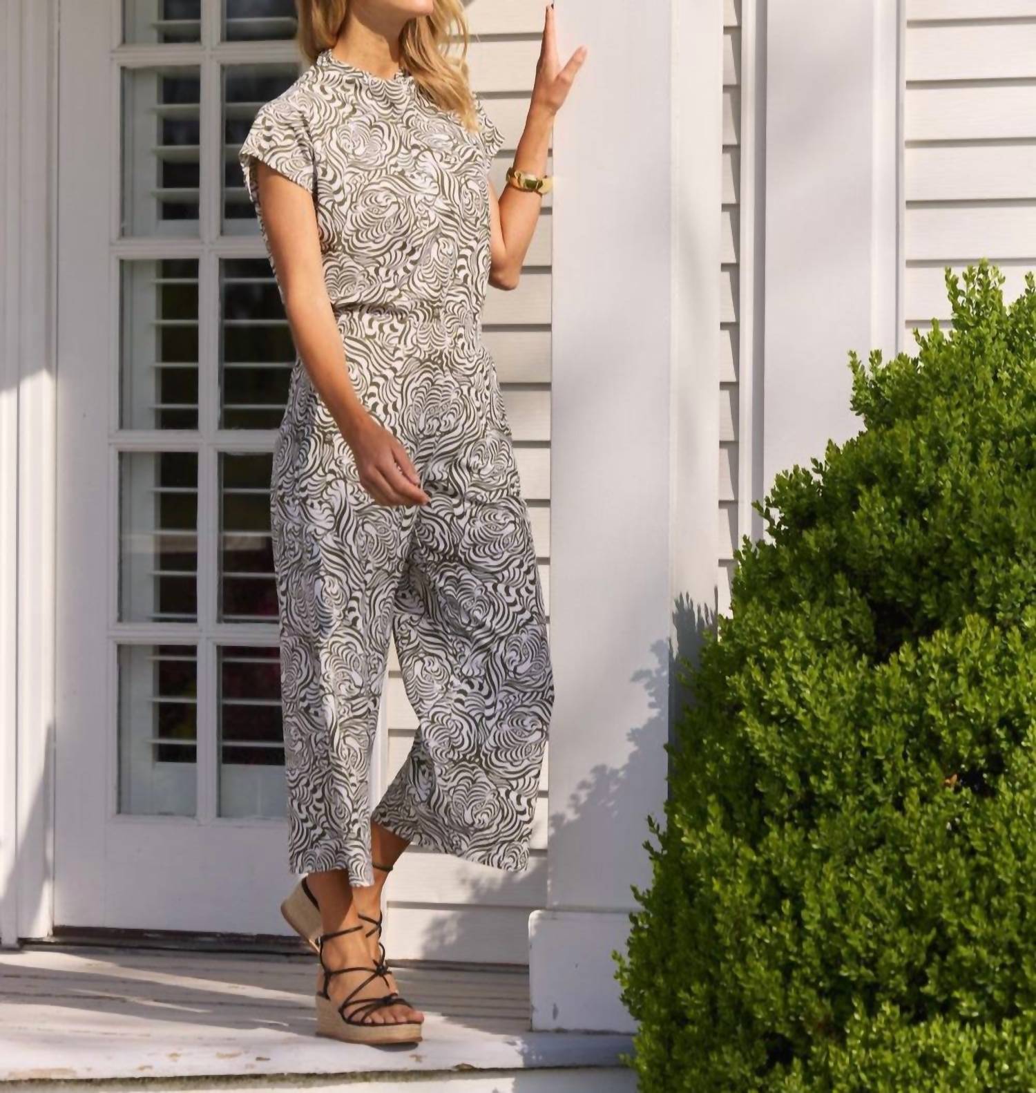 Upgrade your wardrobe with these cropped pants, designed to merge sophistication and wearability. The tailored fit ensures ultimate comfort during long days or nights out. Meet the Lolly Cropped Pants by Jude Connally, a seamless blend of comfort and style with a relaxed fit. Designed with a wide-leg, high-rise silhouette, these patterned pants in Hidden Tiger Cream offer the versatility of pull-on ease and convenient pockets. Crafted from a nylon/spandex blend, these pants feature a chic 24" inseam, perfect for warm summer vacations or everyday outings. Made in the USA for quality, they are machine washable and can be cool ironed if necessary.