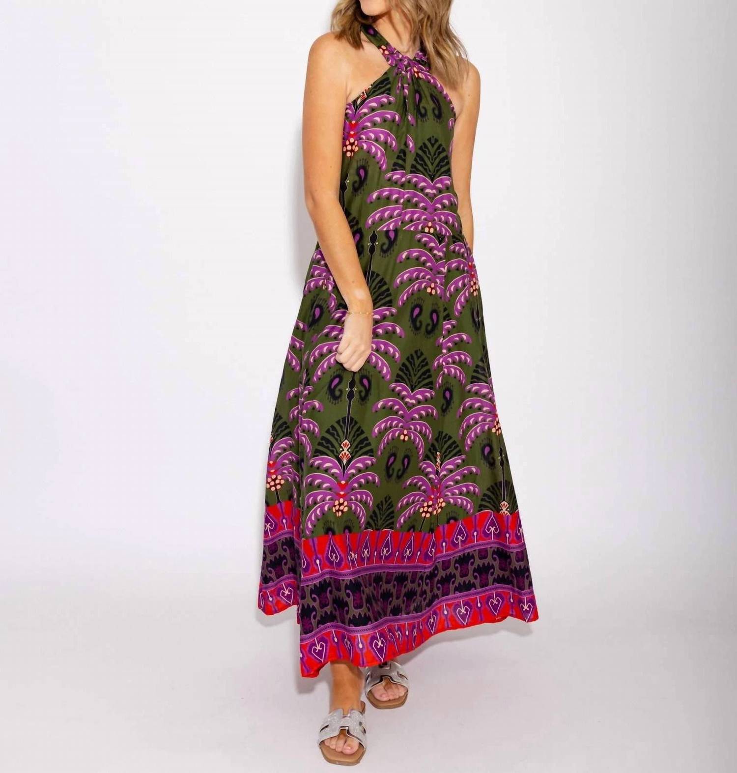 Style this maxi with your favorite statement necklace and sandals for the perfect look. Introducing the Miriam Dress by JUDE CONNALLY, a boho chic choice embodying summer elegance. This sleeveless A-line dress features a sophisticated halter neckline and a decorative floral frond paisley pattern. Designed with a flattering midi length, it offers ease of movement and a zip closure for convenience. Crafted in India, each garment boasts unique hand-printed color variations.