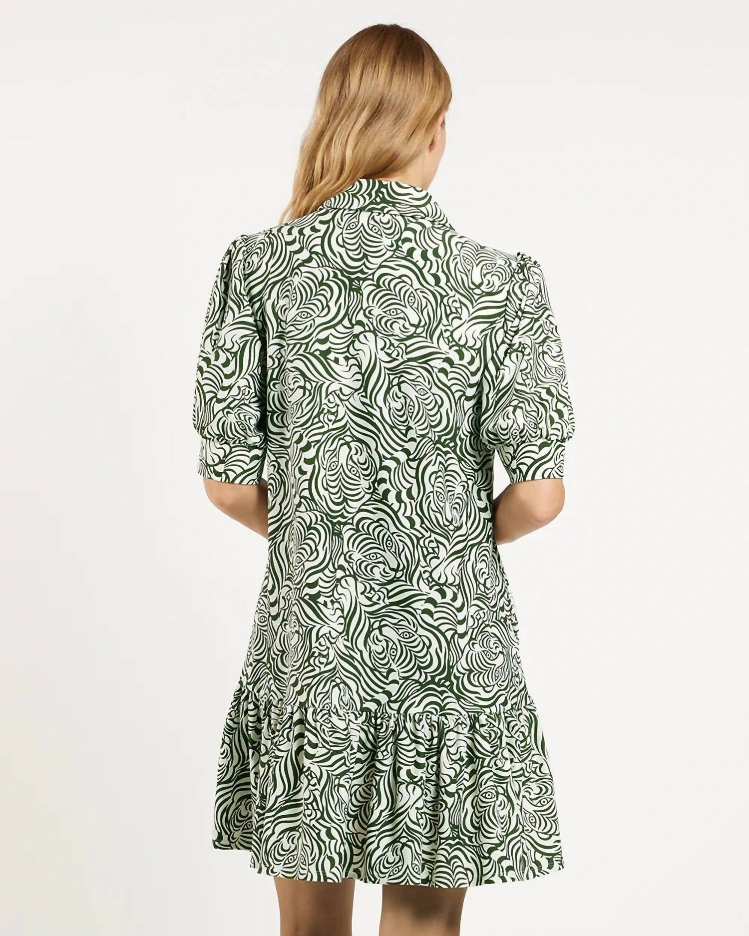 The perfect mini dress for those warmer months. The Tierney dress is a short-sleeve style with a point collar, V-neckline, puff sleeves, flounce detail, and pockets. It measures 35" from the top of the center back in size Small. Made from nylon and spandex Jude Cloth fabric, it is easy to care for. The dress is machine washable, should not be bleached, and can be cool ironed if needed. The model is 5'9" and wears size Small. Available in cream and green. Made in the USA.