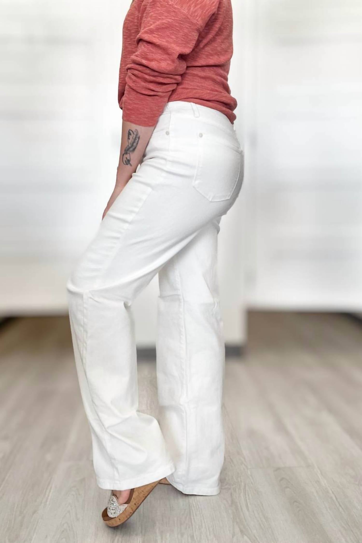 Just as cute as they are comfortable. Enhance your wardrobe with the Judy Blue High Waist Wide Leg Jeans in a crisp white hue. Designed for comfort and style, these jeans feature a high 11" rise and generous 33.5" inseam. Crafted from a premium cotton blend of 93% Cotton, 6% Polyester, and 1% Spandex, they offer excellent stretch for a comfortable fit. The braided detail around the waist adds a touch of sophistication to this wide leg design, perfect for elevating your spring style.