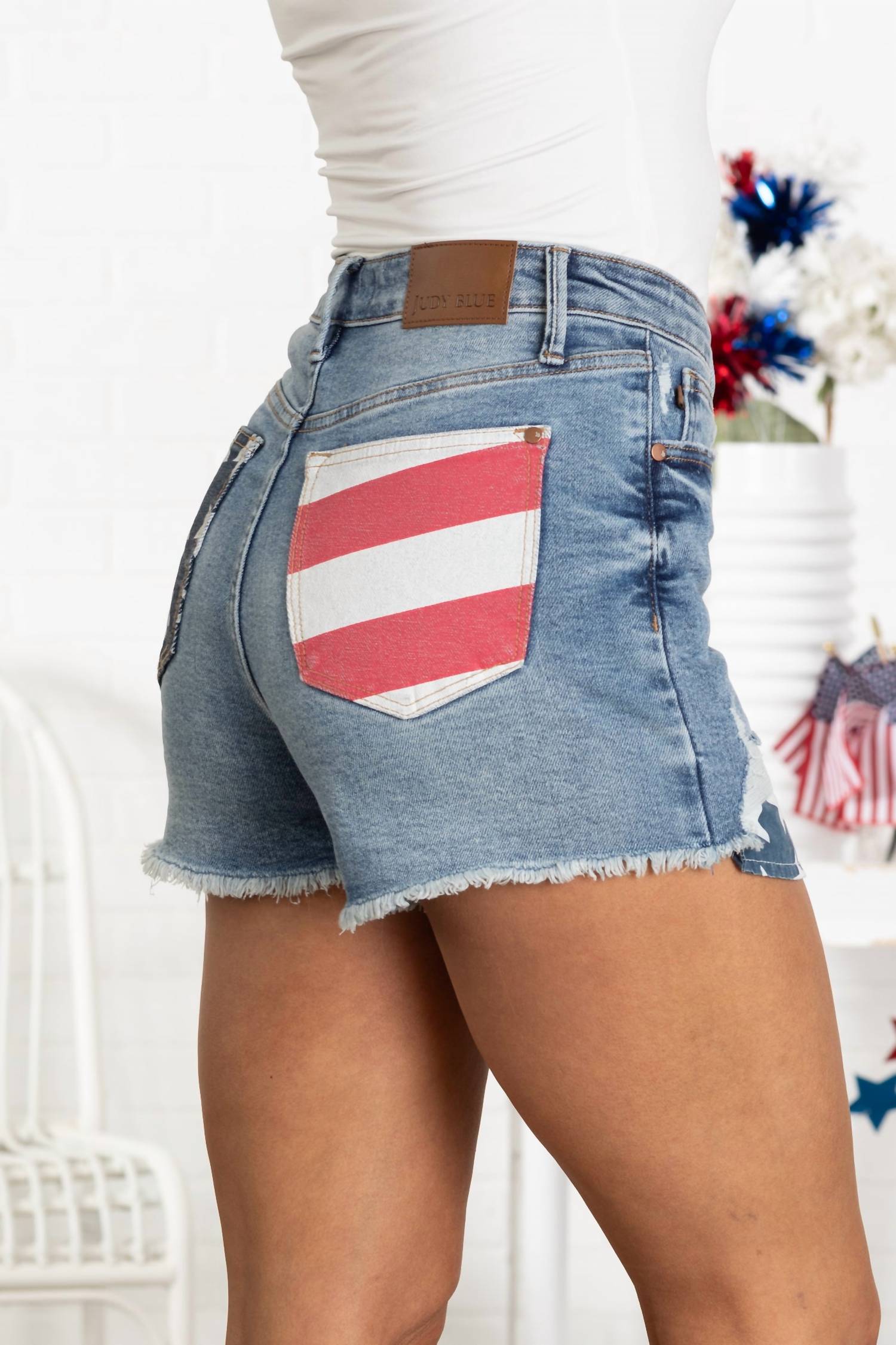 Tuck your favorite tee into these high-waist shorts for a more casual-cool feel. These medium wash denim shorts feature a high-rise fit for a flattering silhouette. Made from a soft and stretchy blend of 94% cotton, 5% polyester, and 1% spandex, they offer comfort and durability. Easy care with machine wash cold and line dry.