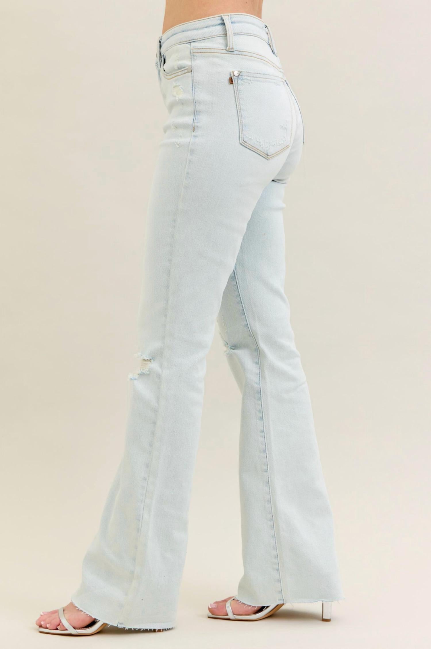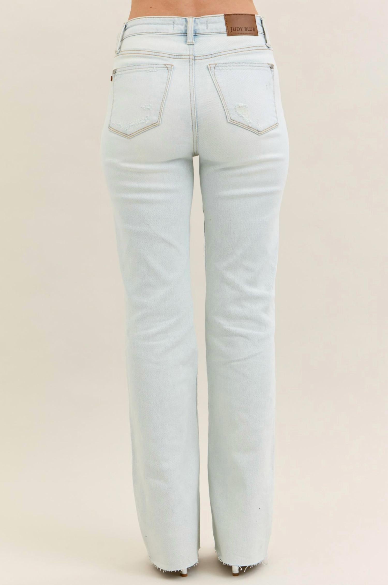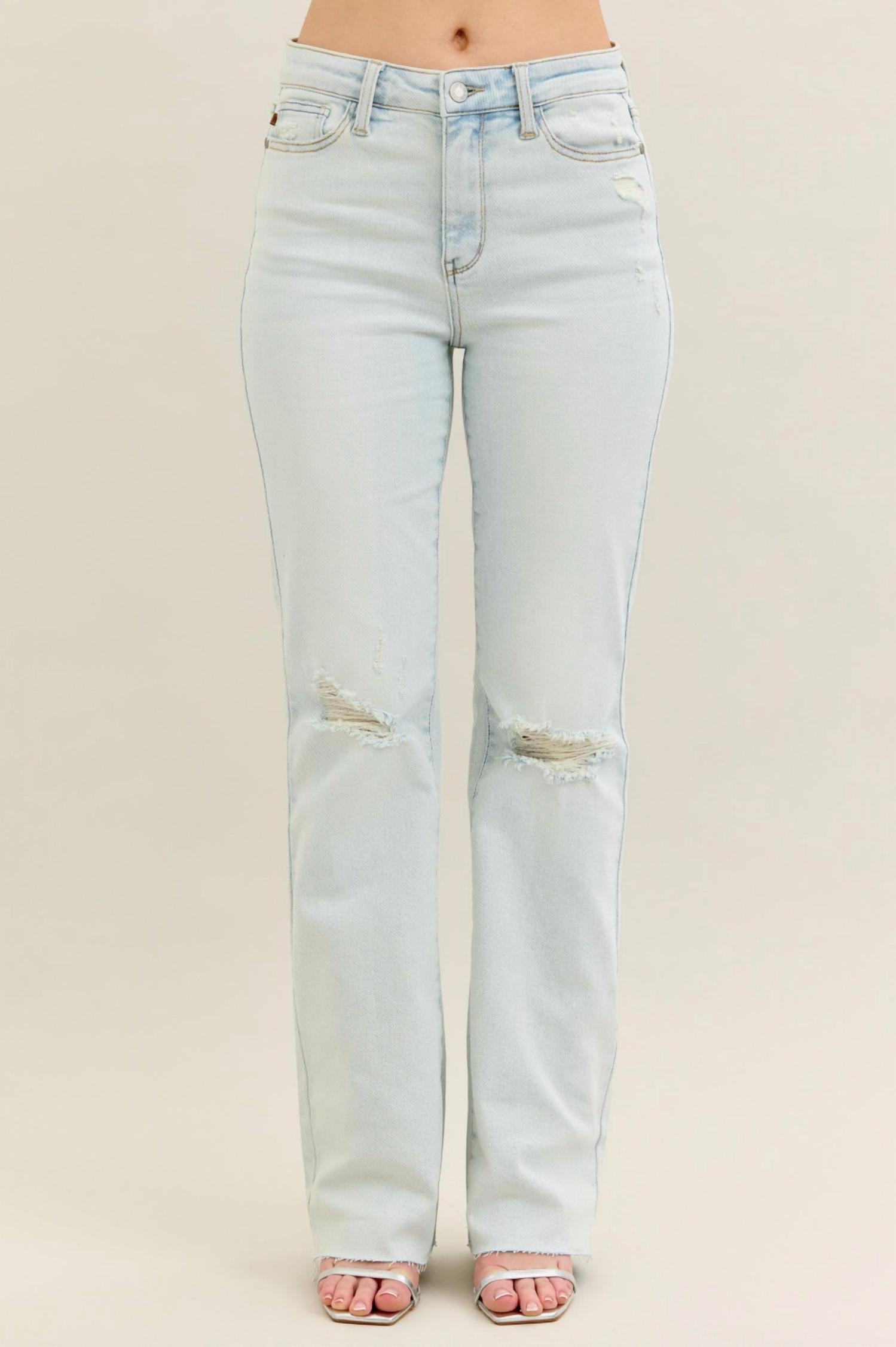 The trend report says boot-cut is in and that's exactly why we love this style. They are fit to perfection, flattering on any body type, and comfortable. They will be your go-to all season long. Elevate your summer wardrobe with the Mid Rise Destroyed Fray Hem Bootcut Jeans by Judy Blue, designed for relaxed vacation vibes. Crafted from a blend of 94% Cotton, 5% Polyester, and 1% Spandex, these jeans offer both comfort and a flattering regular fit. The stylish blue hue features a light wash and a solid pattern, with a distinctive destroyed fray hem for added edge. With a mid-rise waist of 10.75 inches, a 32-inch inseam, and a button closure, these jeans are practical and chic. Care: Machine wash and tumble dry.