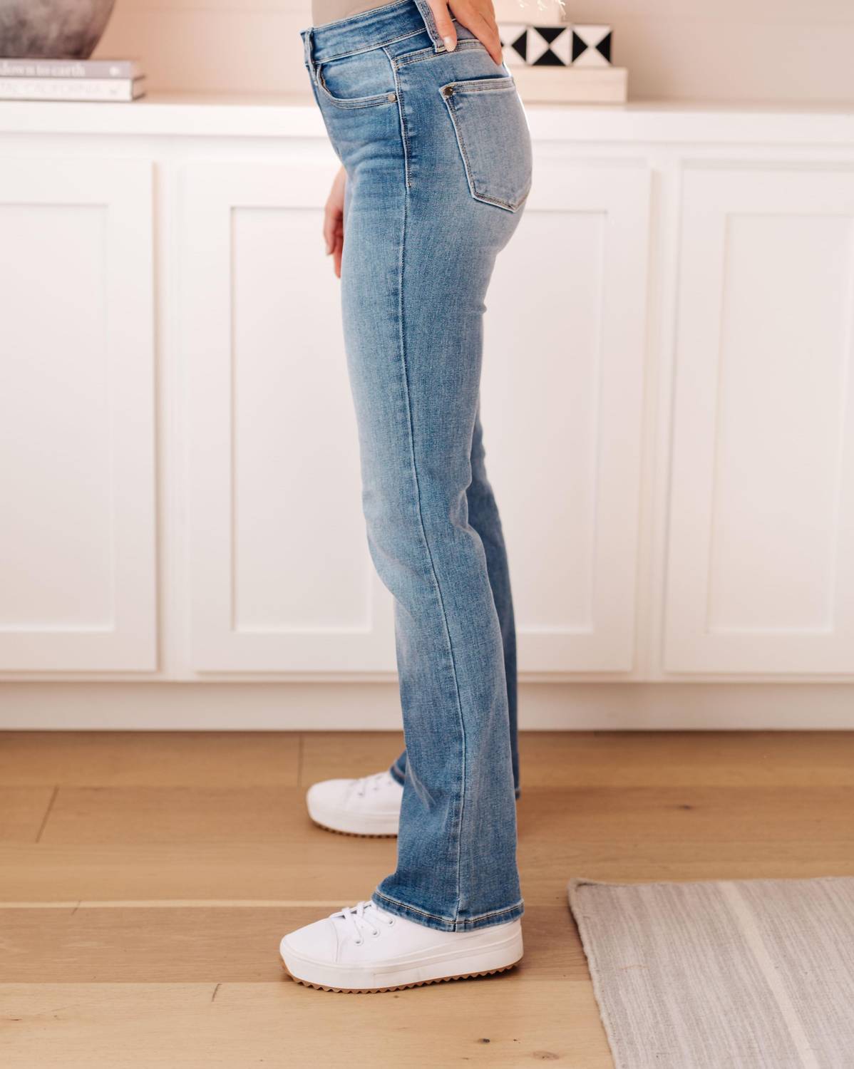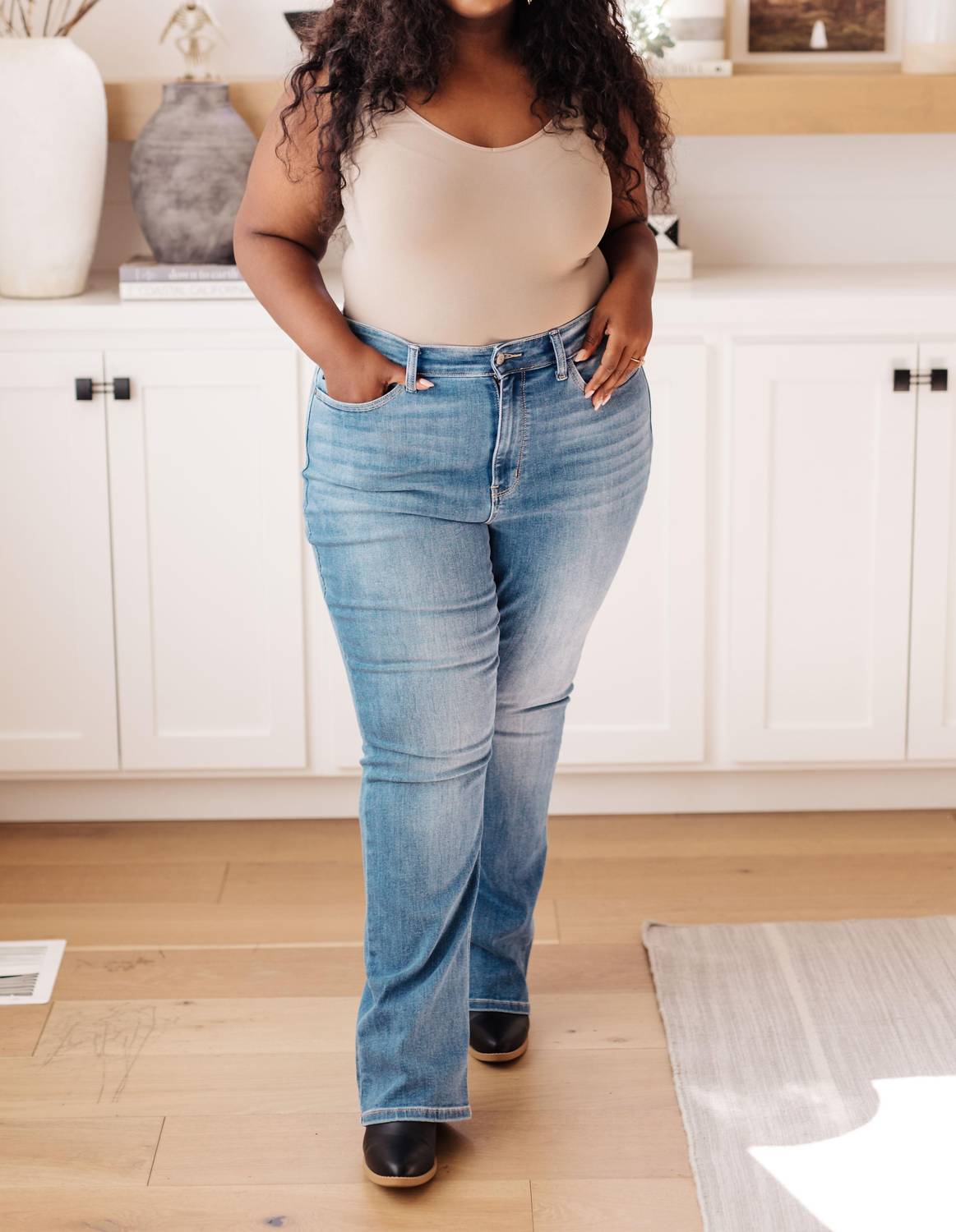 If you're looking for boot-cut, this is the jean for you. Discover the Monroe High Rise Classic Bootcut Jeans by Judy Blue, designed to offer a flattering silhouette with a high-rise fit and relaxed bootcut leg. Crafted from a stretchy denim blend of 69% Cotton, 16% Polyester, 9% Rayon, 5% Elasterell, and 1% Spandex, these jeans come in a solid medium wash for a timeless look. Closure is ensured with a reliable zip fly, and they're easy to care for with machine wash instructions. With a classic bootcut style, these jeans are perfect for a variety of occasions, from casual outings to dinner parties.