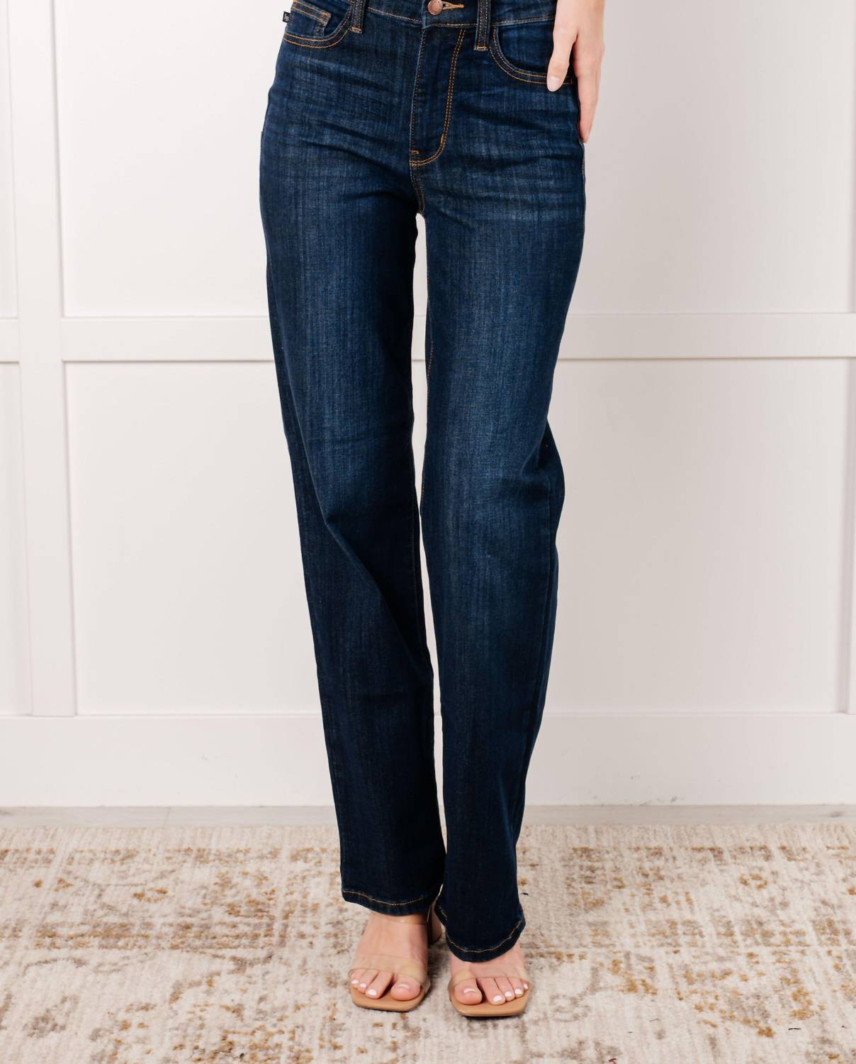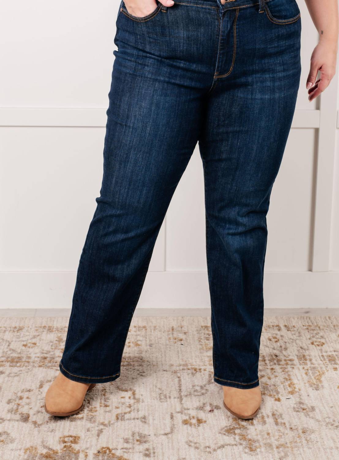 These must-have jeans are fit to perfection. Enhance your denim collection with the Alaina High Rise Classic Straight Jeans by Judy Blue in a dark wash finish. These jeans feature a high rise and button closure, offering a flattering classic fit with a straight leg style. The cotton blend (52% Cotton, 23% Polyester, 22% Rayon, 3% Spandex) ensures a comfortable wear, complete with a 4-way stretch for added flexibility. Dimensions range from a waist of 24" with a hip of 34" and rise of 10.5" to a waist of 40" with a hip of 55" and rise of 13.5", catering to your perfect fit. Model Casey is showcasing a size 0/24, highlighting the natural fit of these non-distressed jeans.