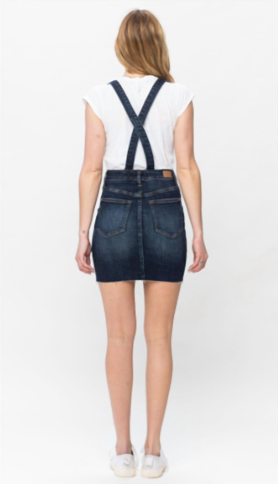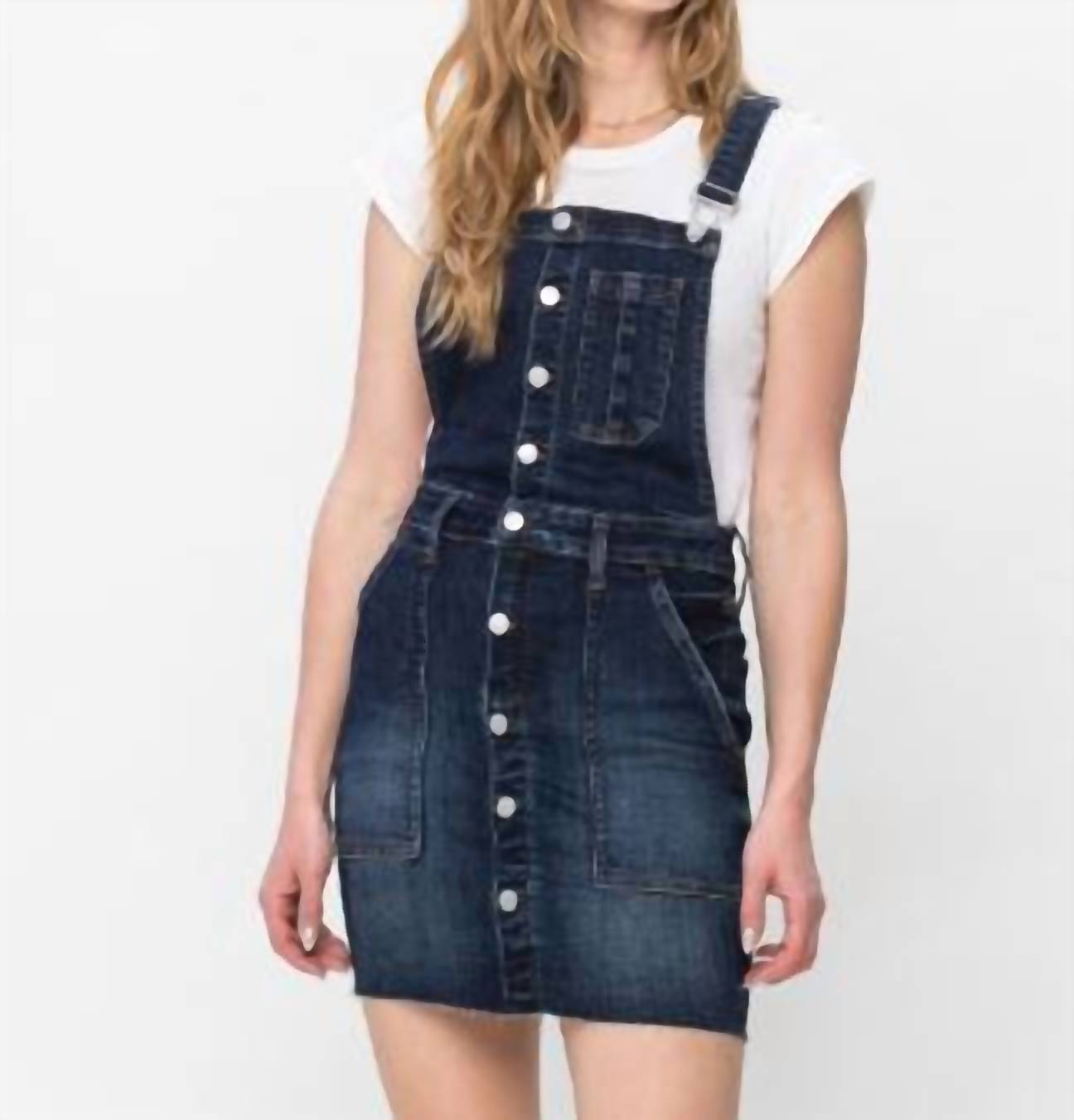 A short and breezy dress for those warmer days. The Judy Blue Overall Mini Dress in a solid blue tone merges 90s fashion vibes with practicality, ideal for summer music festivals. This sleeveless sheath dress features a square neckline and a high-waisted design, offering a flattering silhouette with its cotton blend fabric composed of 93% Cotton, 6% Poly, and 1% Spandex. It measures 17.25" in the front and 18.25" at the center back, complete with a button closure and functional pockets. Easy to care for, simply machine wash to retain its fresh dark wash appeal.