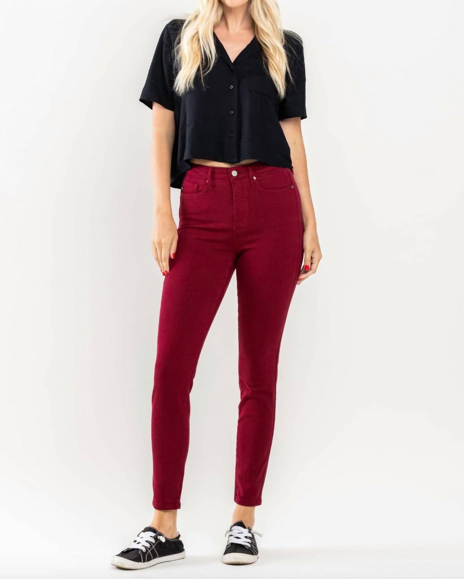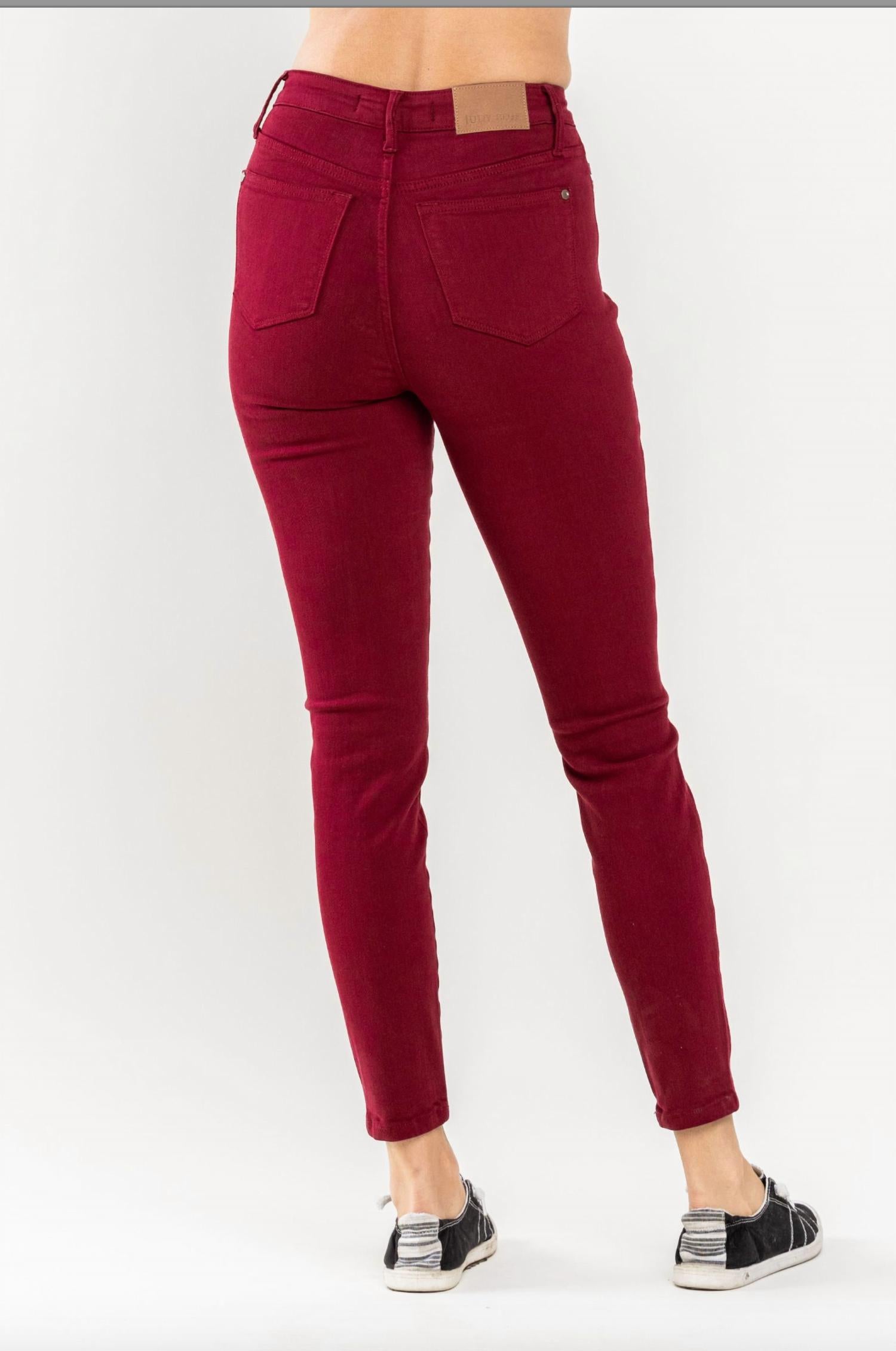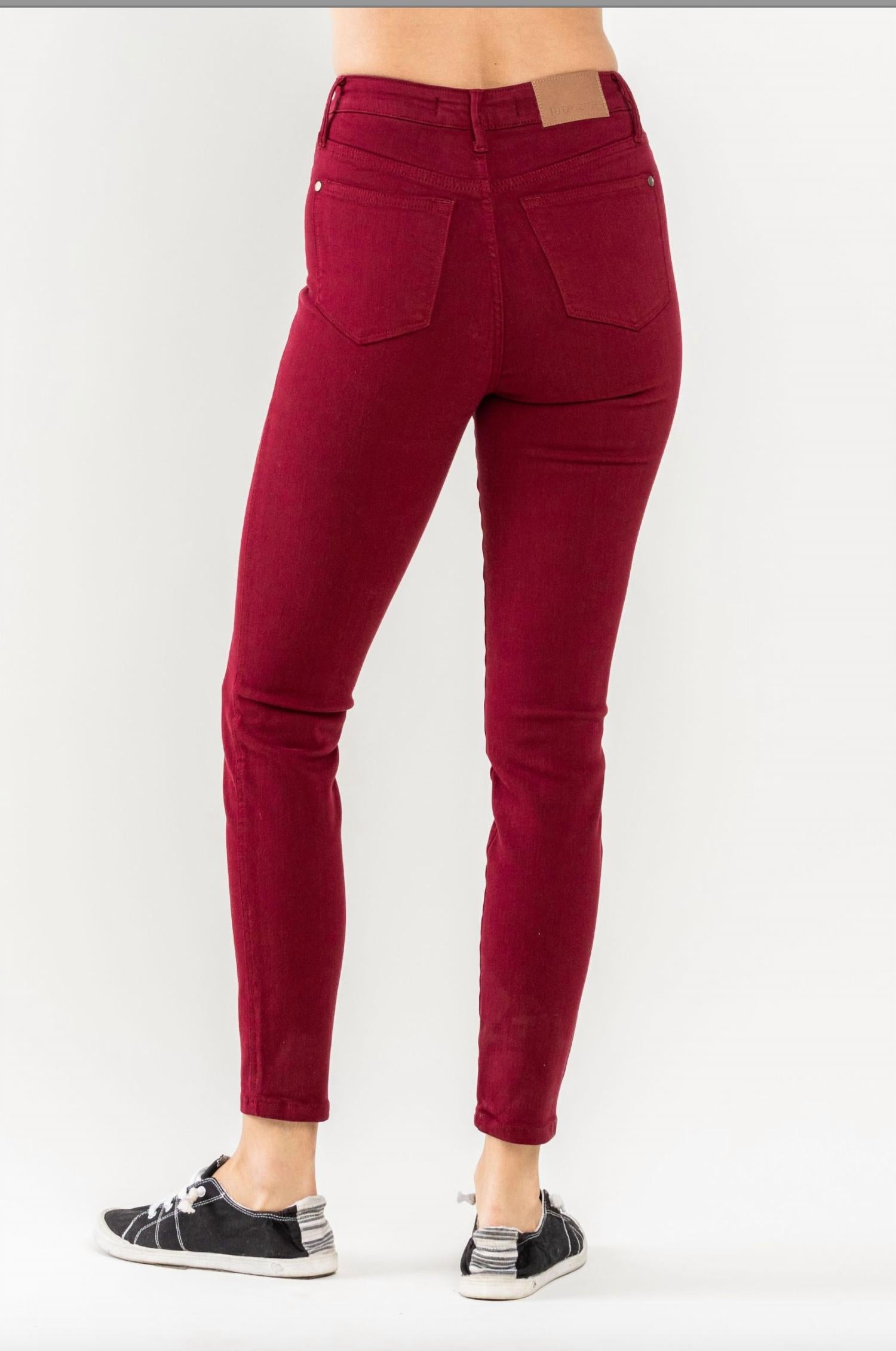 Everyone needs a good pair of skinny jeans and this is a style you'll keep reaching for no matter the season. Meet the Judy Blue Tummy Control Skinny Jeans in striking Scarlet, tailored for fashion-forward individuals. Boasting a high-rise fit with an 11-inch rise and a sleek skinny leg silhouette, these jeans feature a zip closure for a seamless look. Crafted from a comfortable cotton blend of 93% cotton, 6% polyester, and 1% spandex, they promise both style and stretch. Please note these jeans run slightly snug, so consider sizing up from your usual Judy Blue size for the best fit. Inseam measures 29".