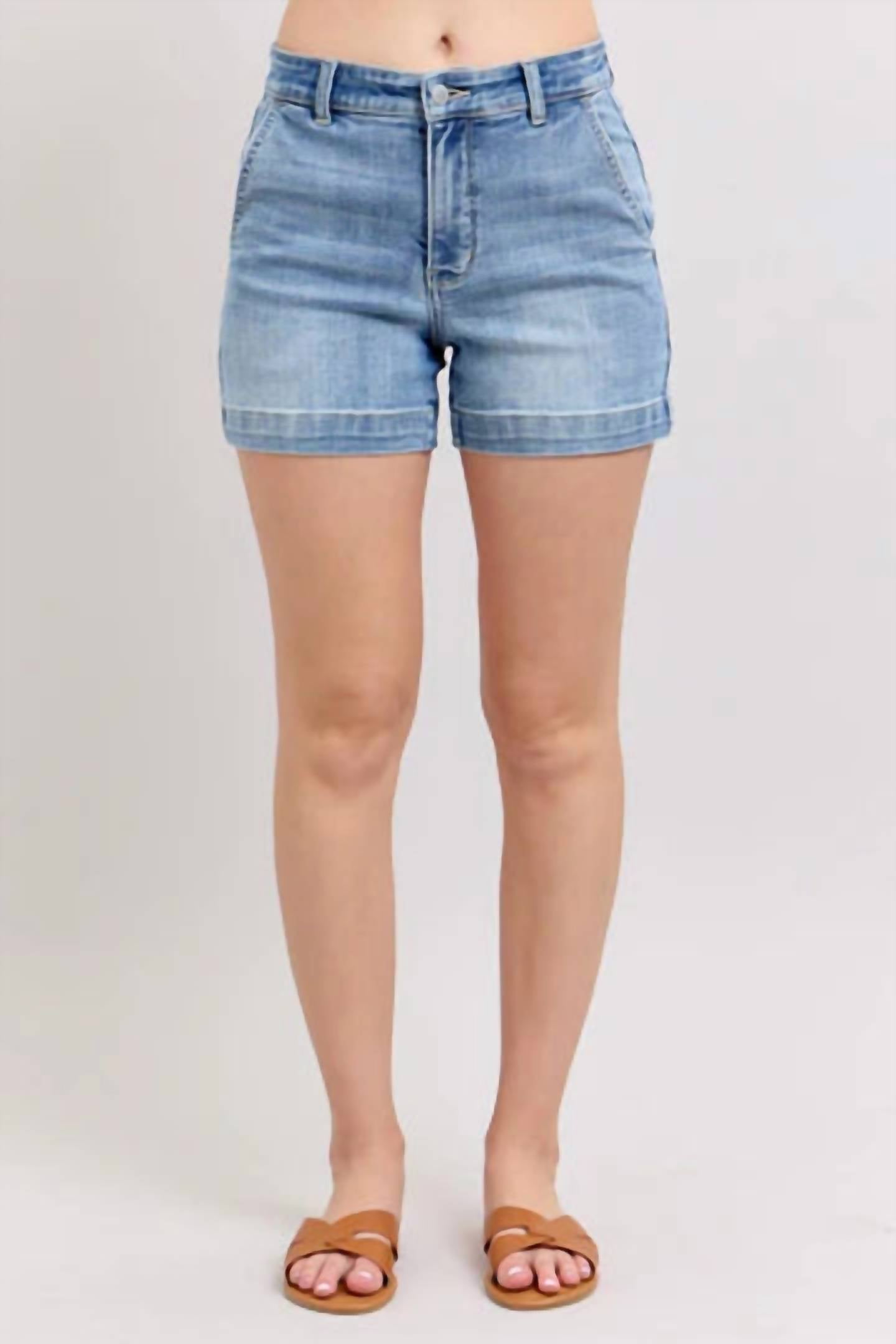 Not only cute but extremely comfortable. The jean shorts you will be reaching for all season long. Introducing the Judy Blue Trouser Pocket Shorts in a light wash, perfect for adding a polished touch to your summer wardrobe. These shorts feature a flattering mid-rise with deep, functional trouser pockets and a button closure for practicality. Crafted from a comfortable cotton blend composed of 93% Cotton, 6% Polyester, and 1% Spandex, they're designed to fit and flatter. Care for these versatile summer shorts by machine washing and laying them flat to dry, ensuring they remain a staple for your vacation and streetwear looks.