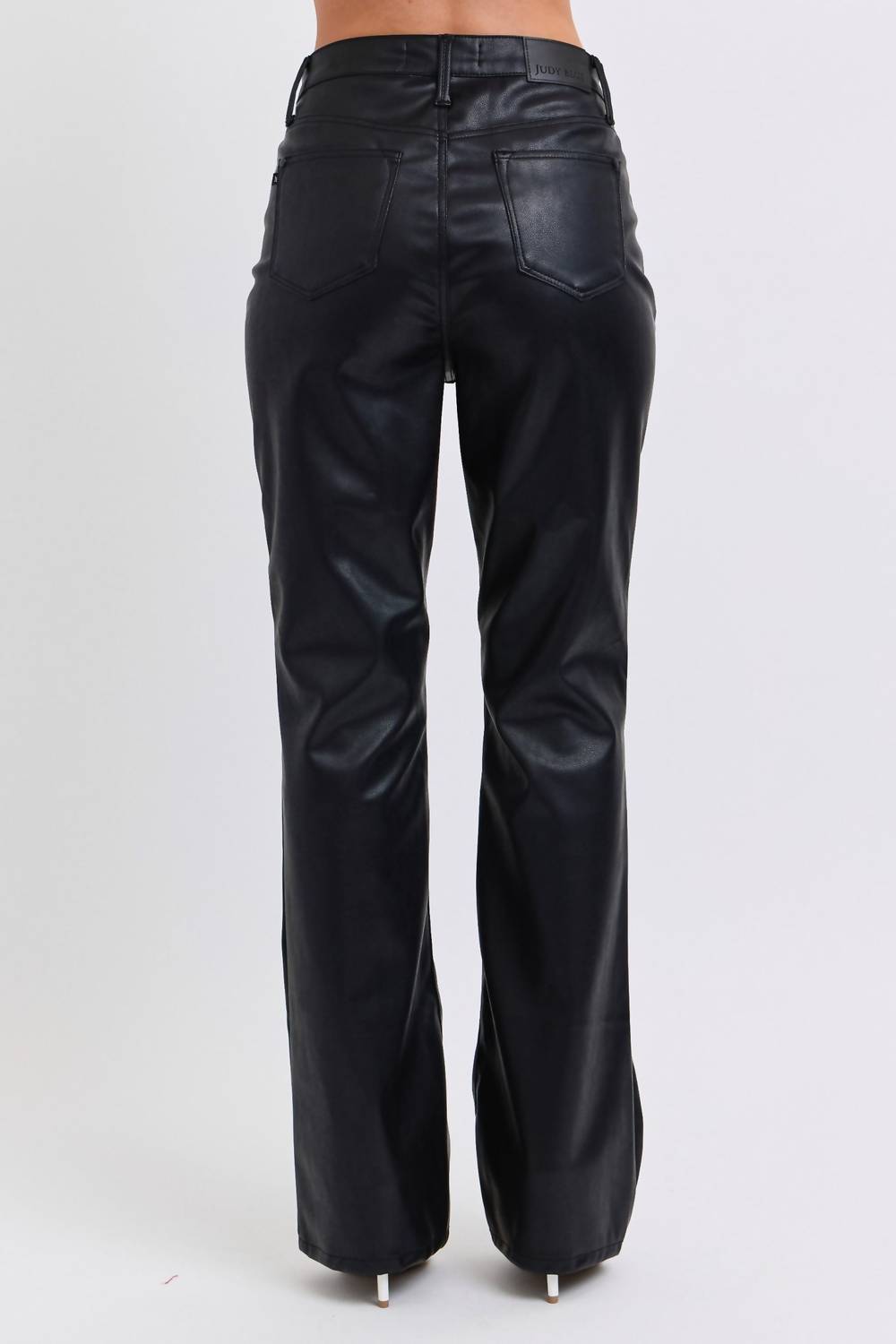 Just add boots! Elevate your wardrobe with the Judy Blue Faux Leather Bootcut Jeans, offering a chic high-waisted, tummy control fit in classic black. These jeans are crafted from 55% PU and 45% Polyester, providing a sleek, faux leather look with a bootcut leg style. Designed with a zip closure, these dark wash jeans feature a rise of 11.5" and an inseam of 32", perfect for spring engagements. Model wears size 1 (5'8" height, 25" waist, 36" hips), showcasing the elegant silhouette these jeans provide.