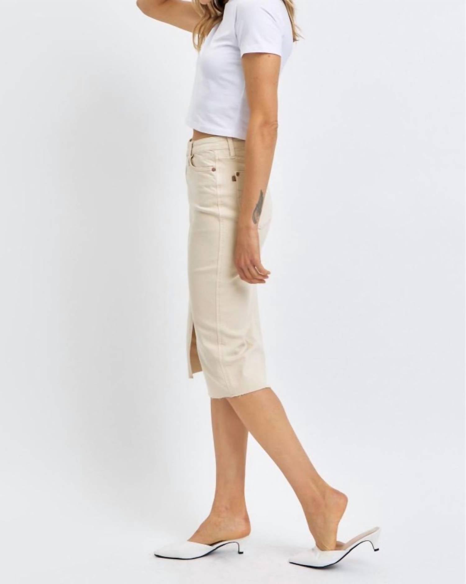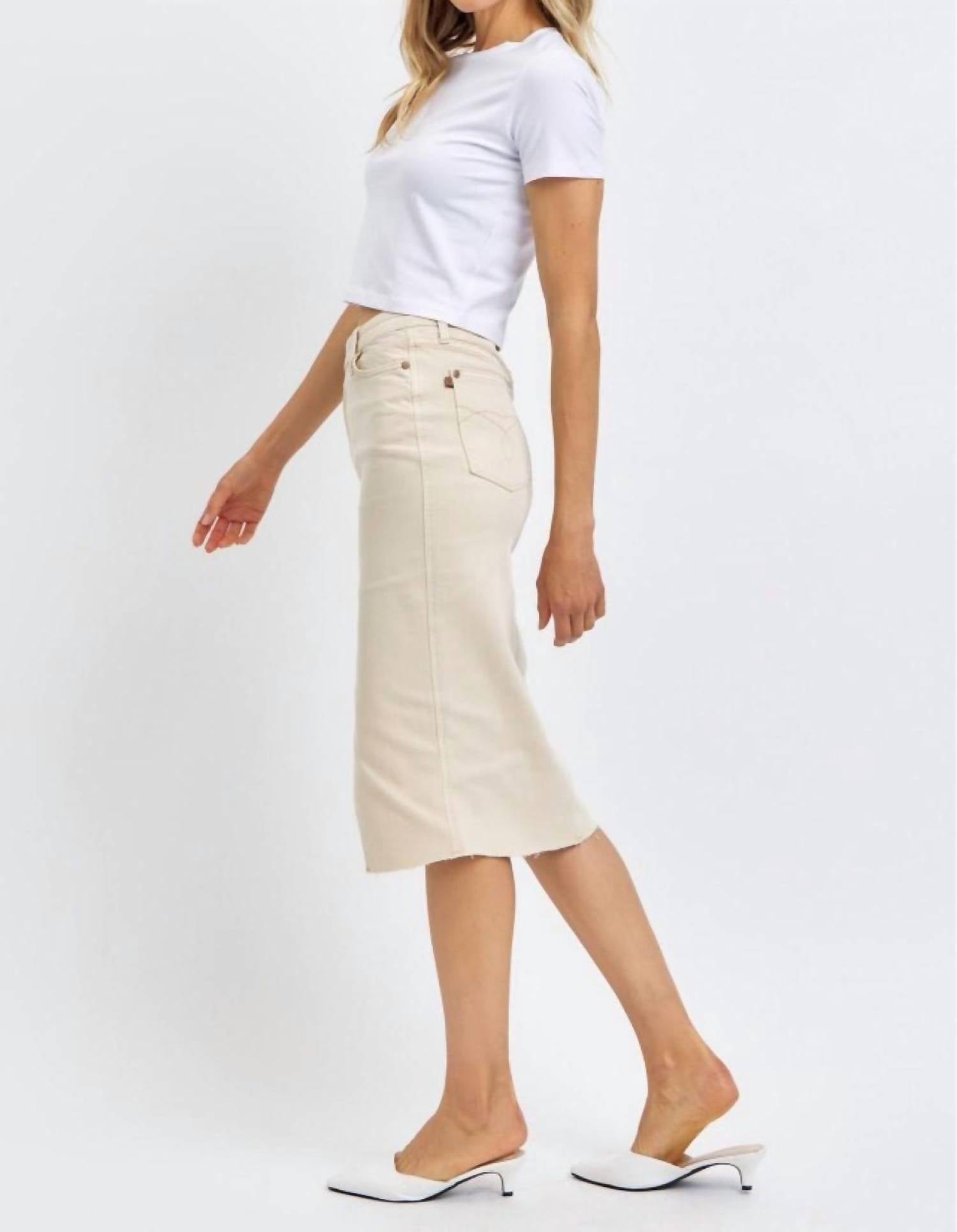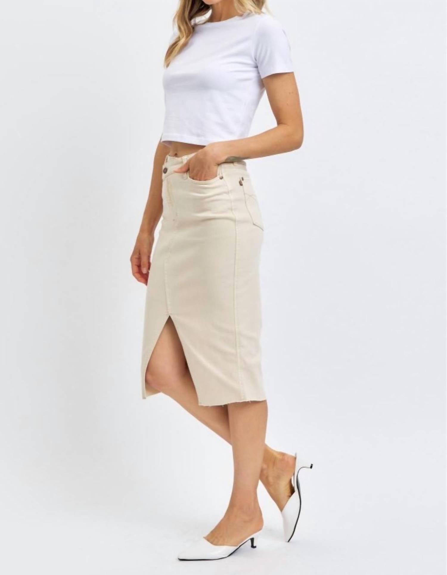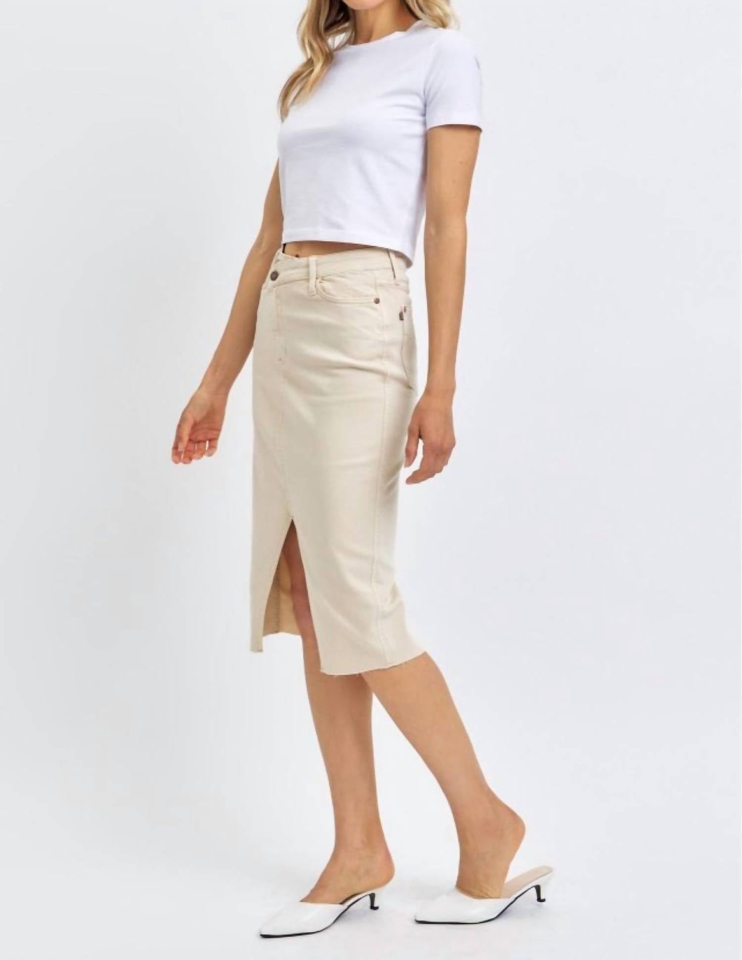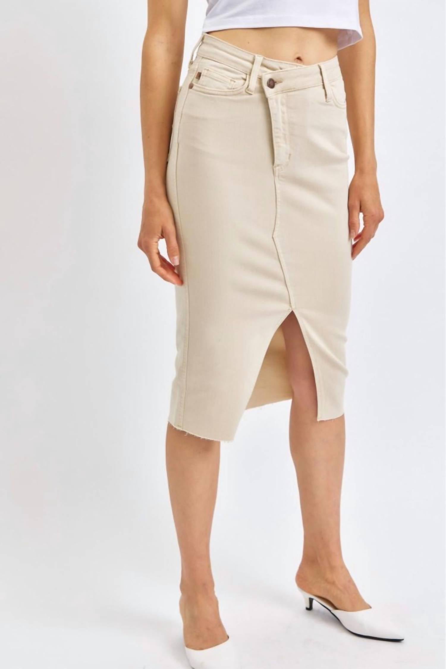 The midi length skirt is here to stay and we especially love this style. Elevate your style with the Judy Blue High Waist Front Slit Denim Skirt in chic beige. This skirt, crafted from a comfortable cotton blend composed of 93% Cotton, 6% Polyester, and 1% Spandex, features a stylish criss-cross front design with a zip closure, offering a high-rise fit that's both flattering and functional. Its midi length and front slit provide ease of movement, perfect for versatile day-to-night transitions. Care instructions recommend machine washing and line drying for lasting quality. Ensures a true-to-size fit for every wardrobe.