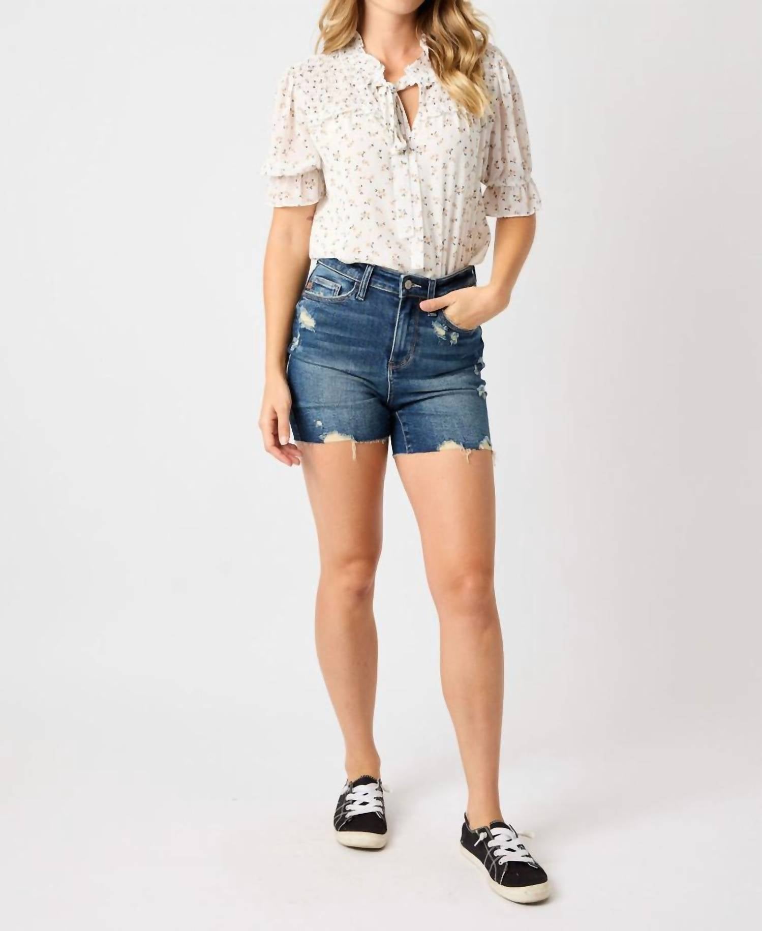 Not only cute but extremely comfortable. The jean shorts you will be reaching for all season long. Experience vintage chic with the Mid Length Cut Off Shorts by Judy Blue, expertly crafted for a timeless appeal. These mid-length shorts feature a high waist with a zip closure and mild distressed detailing. Made in 94% cotton, 5% polyester, and 1% spandex denim, they promise comfort and flexibility in dark blue. Care for them with a simple machine wash to keep them looking fresh season after season.