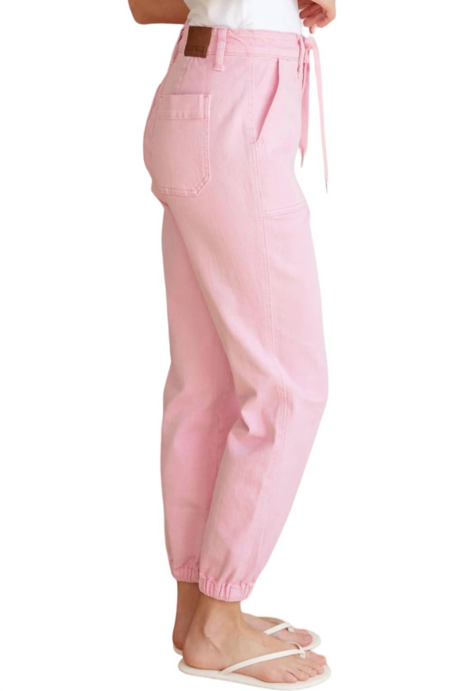 Quirky and playful. High rise garment dyed. Features slant pockets. Drawstring waistband. Button closure. Zip fly. Jogger silhouette. Cased elastic hem. 93% Cotton. 6% Polyester. 1% Spandex.