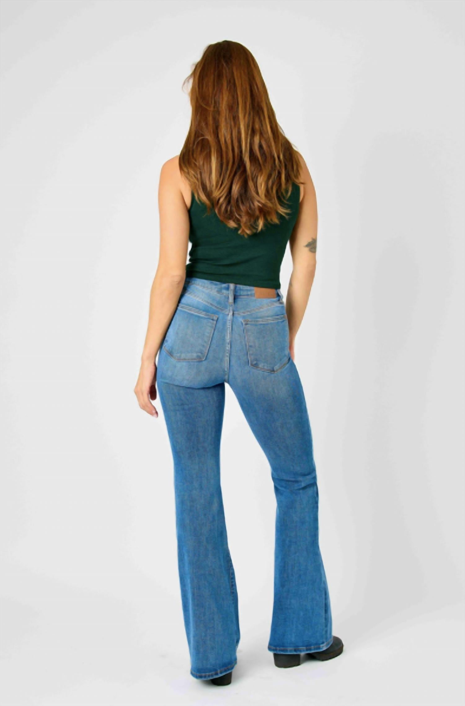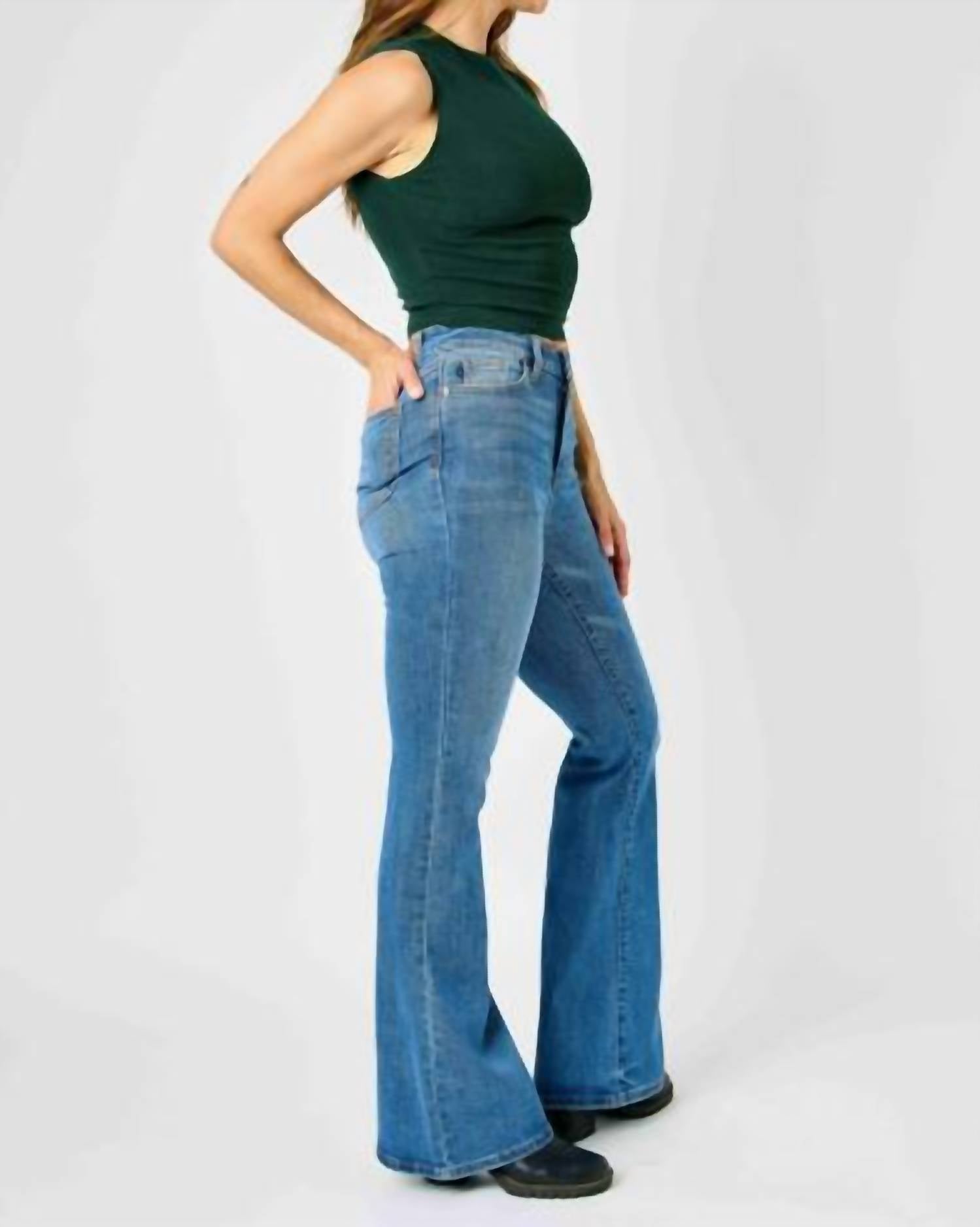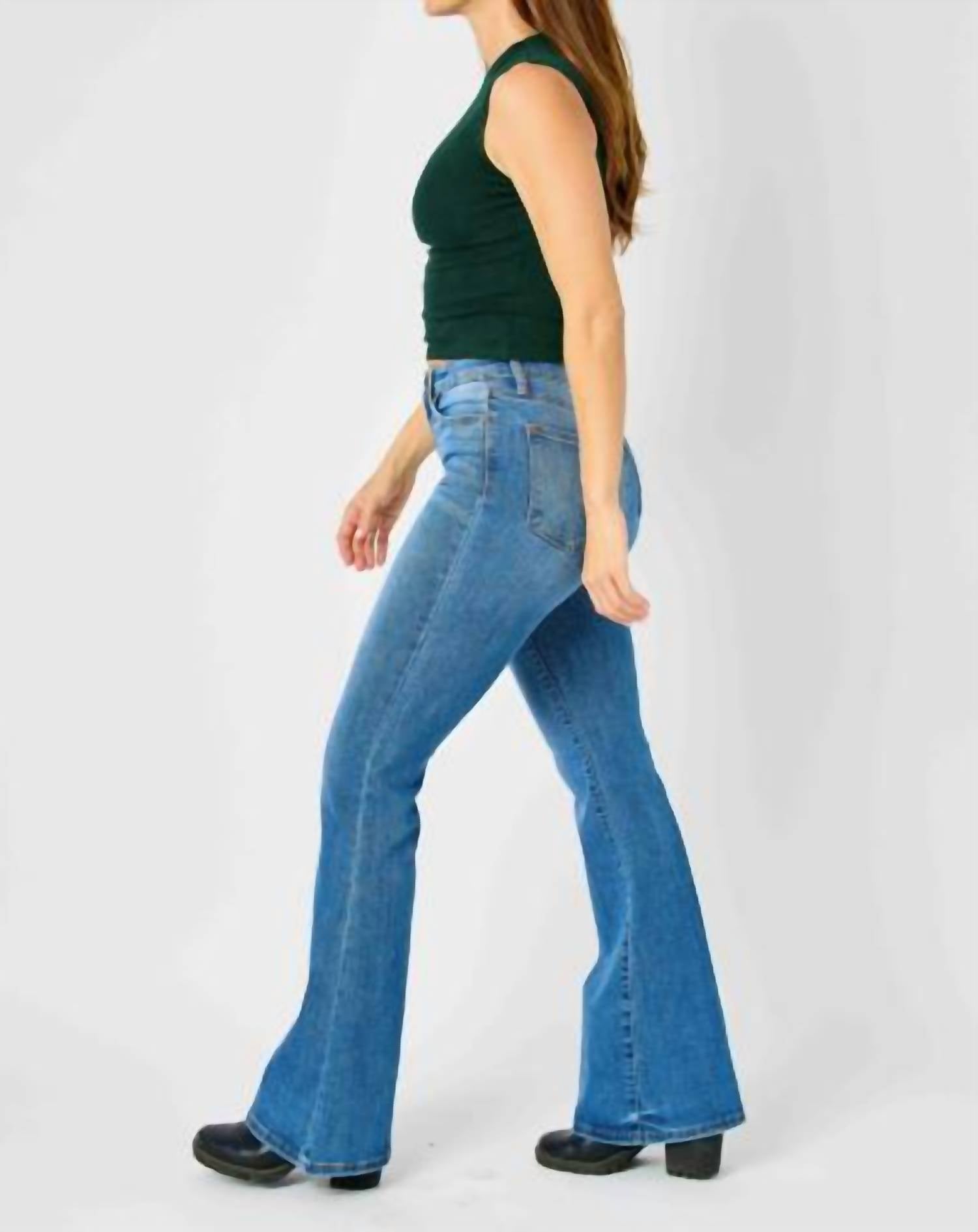 A flattering silhouette that's suprisingly versatile. Elevate your style with the Judy Blue High Waist Classic Flare Jeans, crafted for comfort and a flattering silhouette. These women’s jeans feature a high rise with a 10.75" front rise and a 33.5" inseam, quintessential for a chic yet relaxed look. Made from a cotton blend (66% Cotton, 21% Polyester, 11% Rayon, 2% Spandex), they boast a zip closure and practical pockets, perfect for streetwear or a concert. With a regular fit and flared leg style, these medium wash jeans are easily cared for with machine wash and tumble dry instructions.