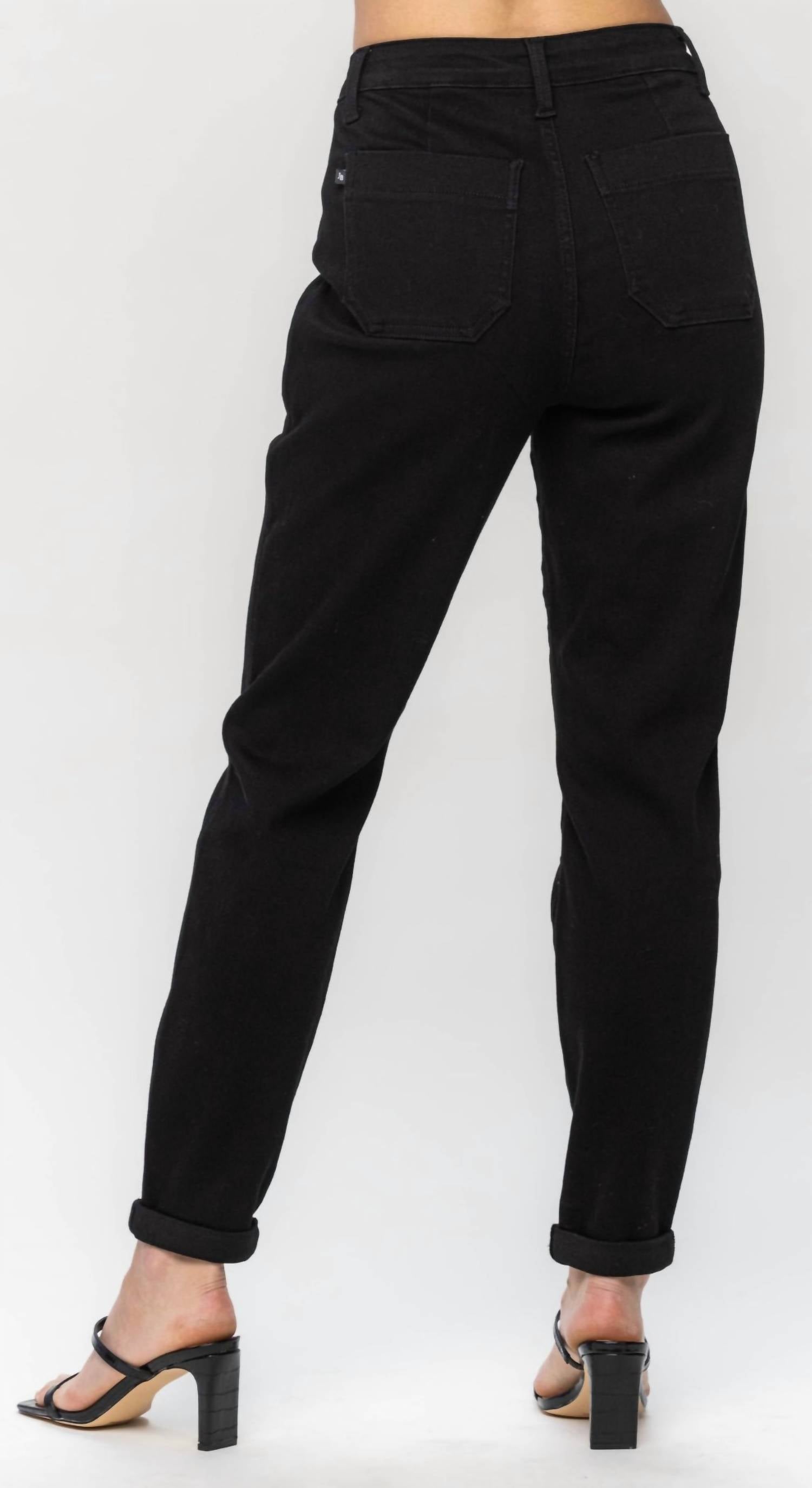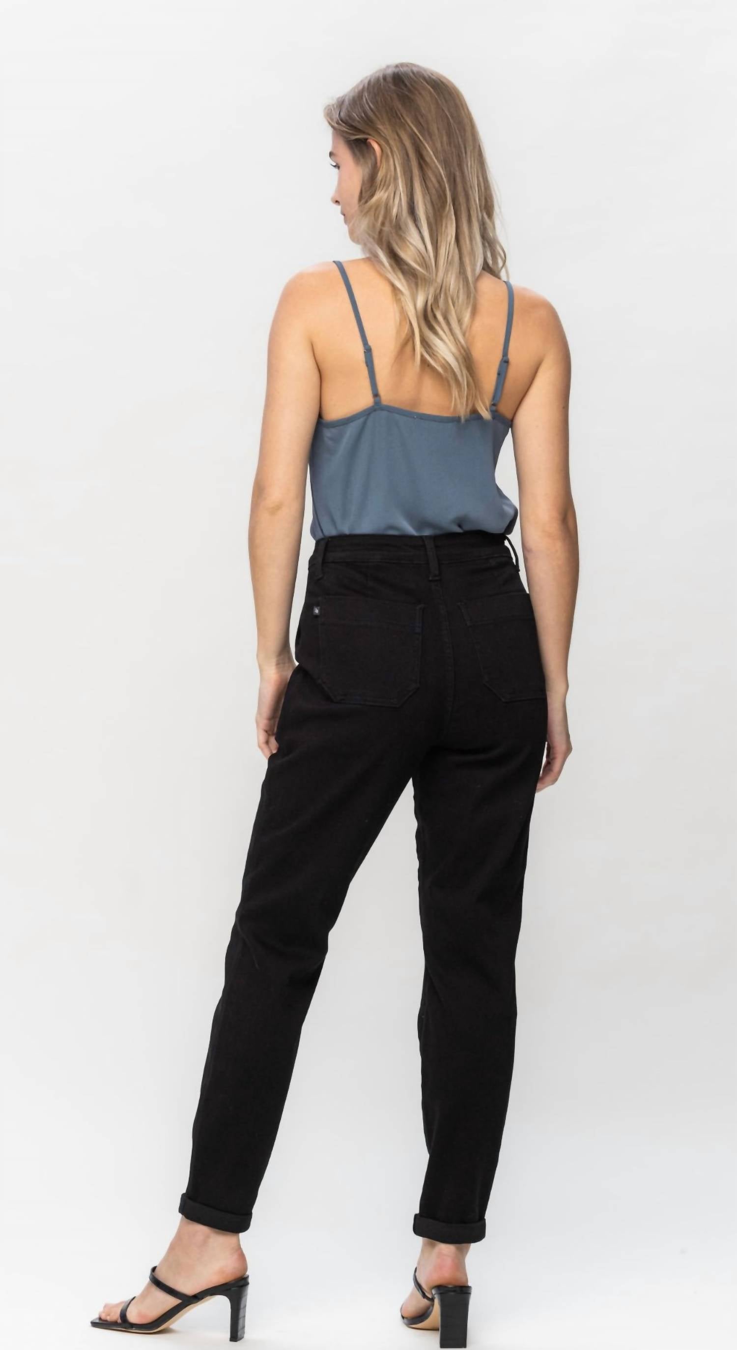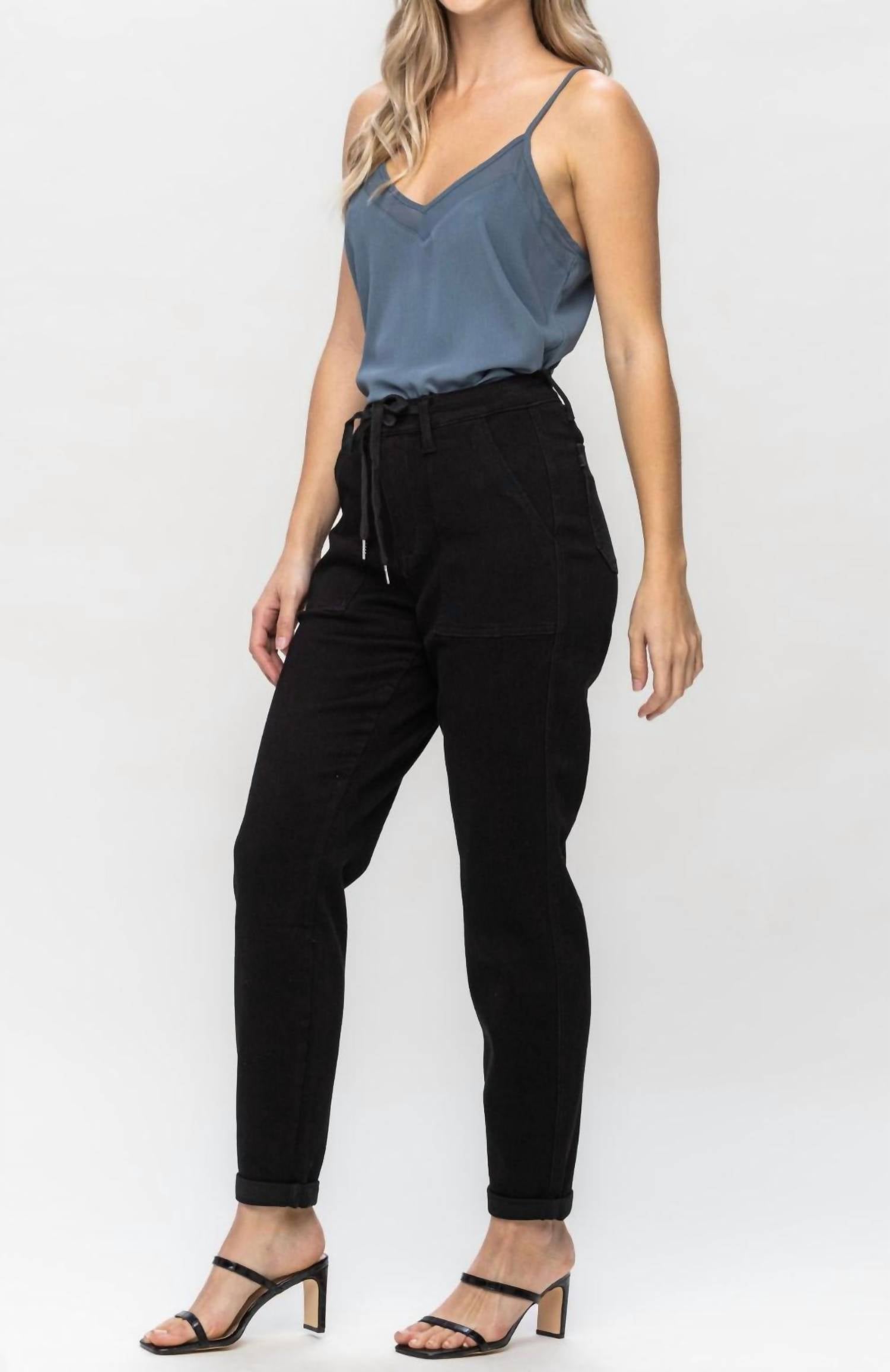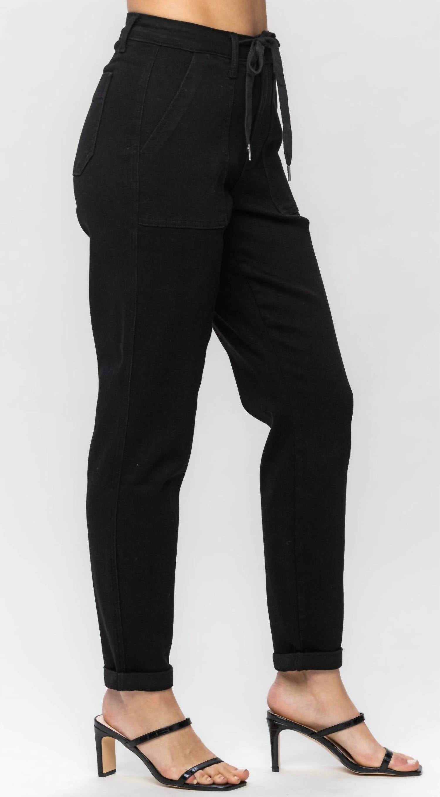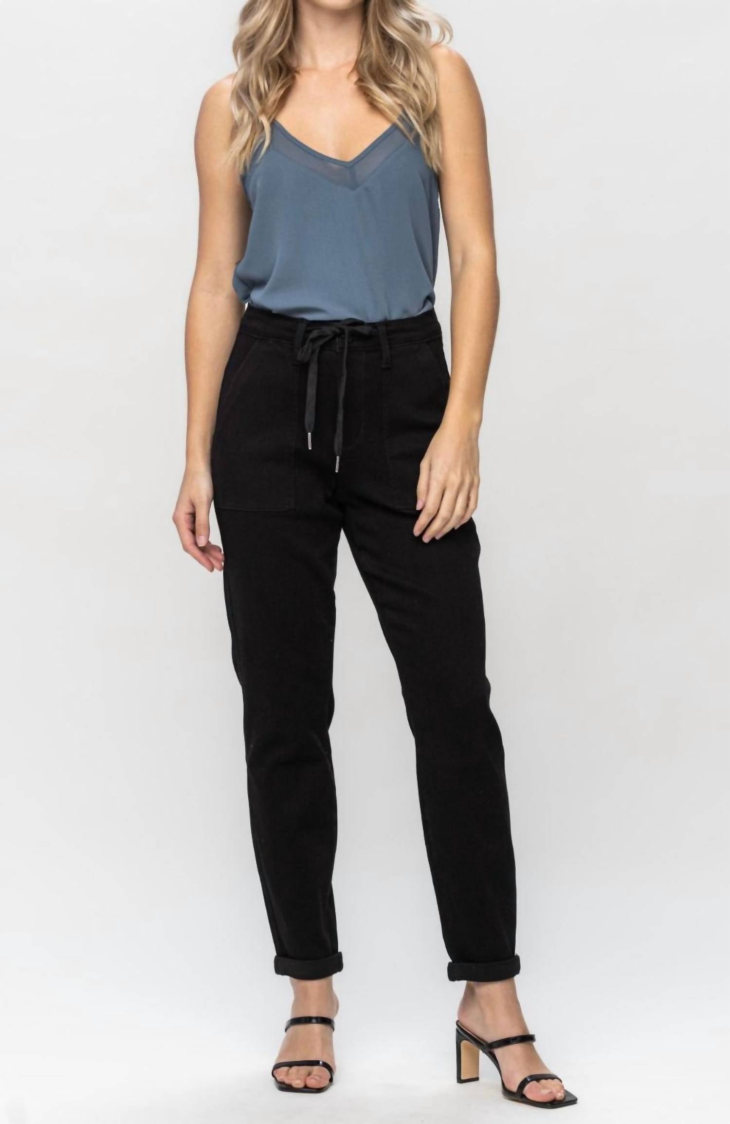 The perfect pant for running around town and looking cool while doing it. Enhance your casual wardrobe with Judy Blue's High Waist Double Roll Cuff Jogger, designed in a chic Jet Black hue. Crafted from a cotton blend of 69% Cotton, 23% Poly, 7% Rayon, and 1% Spandex, these joggers offer both comfort and a fashionable edge. They feature a high rise with an 11" front rise and a tapered leg with a double roll cuff, perfect for a regular fit. Closure is a convenient pull-on style, while the joggers offer practicality with included pockets. The inseam measures 29" when cuffed and 31" uncuffed, making these pants ideal for modern casual wear.