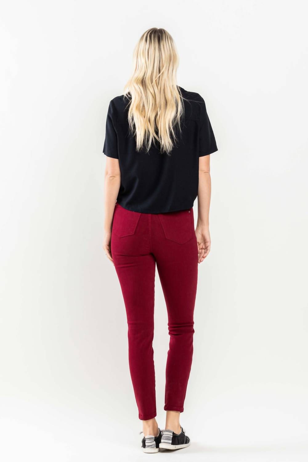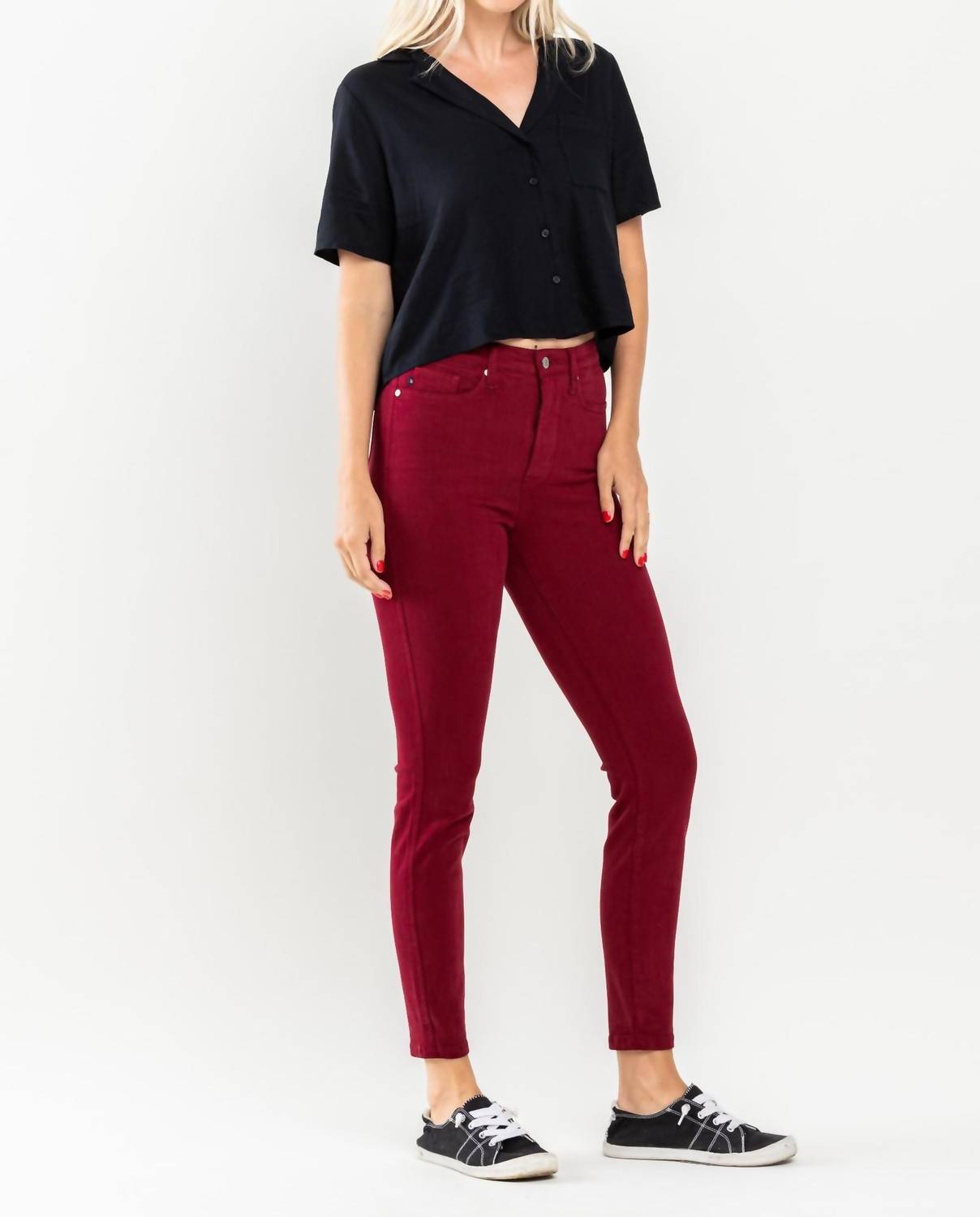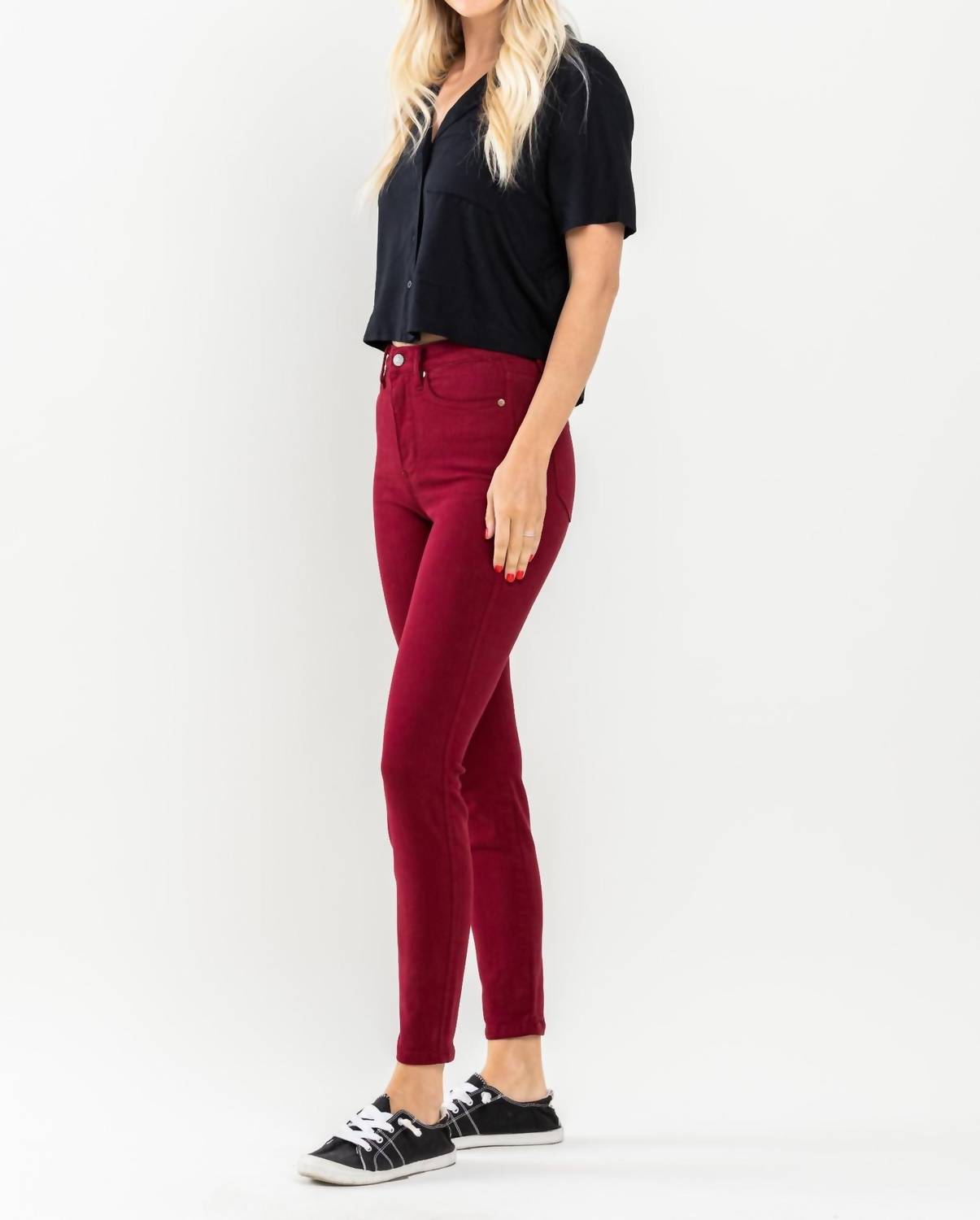 Everyone needs a good pair of skinny jeans and this is a style you'll keep reaching for no matter the season. Introducing the Judy Blue High Waist Tummy Control Skinny Denim Jeans, a must-have for any wardrobe in vibrant scarlet. These jeans feature a slim fit from thigh to ankle, with a high-rise waist for added tummy control. Composition: 93% Cotton, 6% Polyester, 1% Spandex. Closure: Button closure. Front rise measures 11" with a 29" inseam. Care: Turn inside out and wash in cold water, do not mix light and dark washes, air dry or tumble on low. Model wears size 1, standing at 5'10" with a 24" waist and 34" hips.