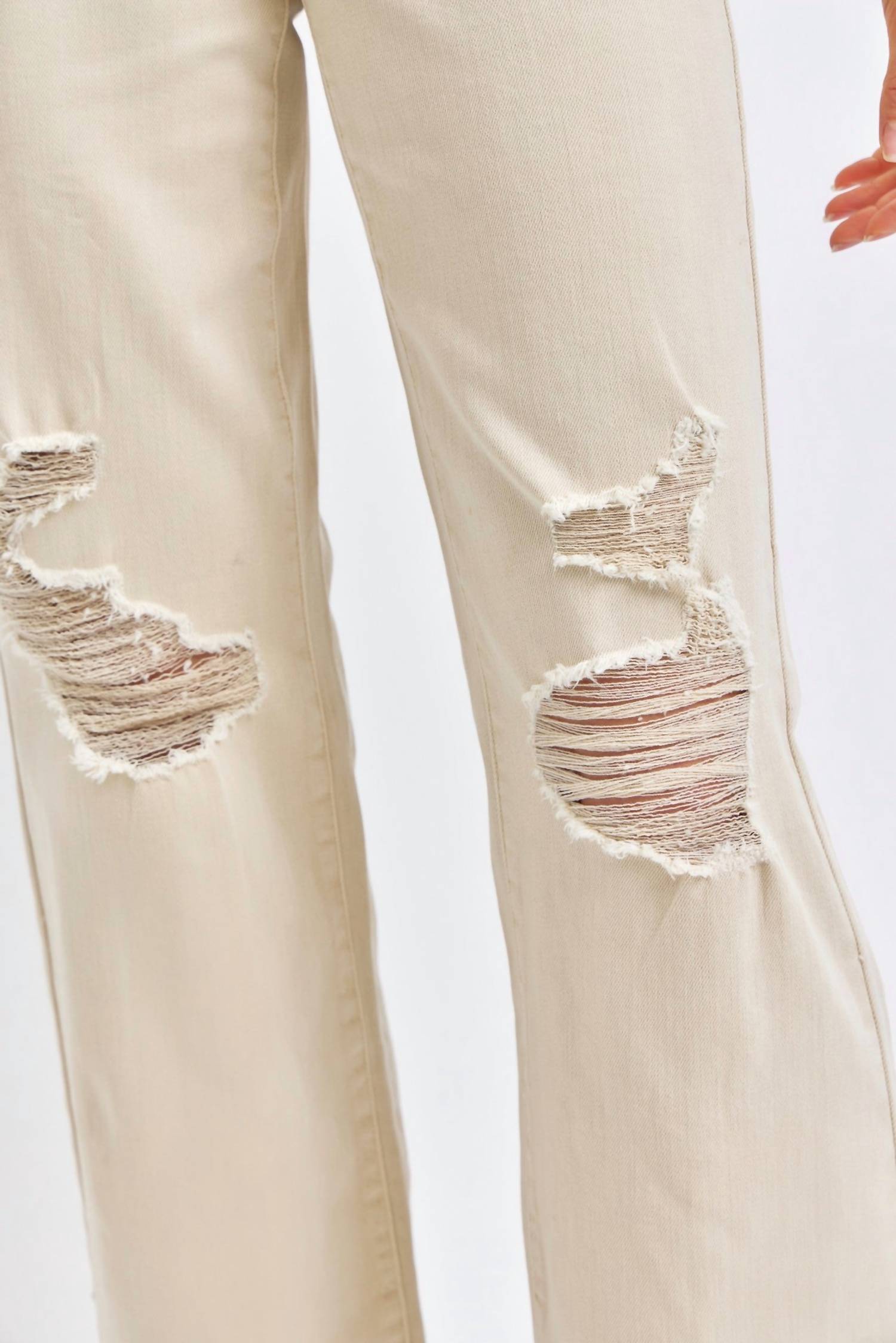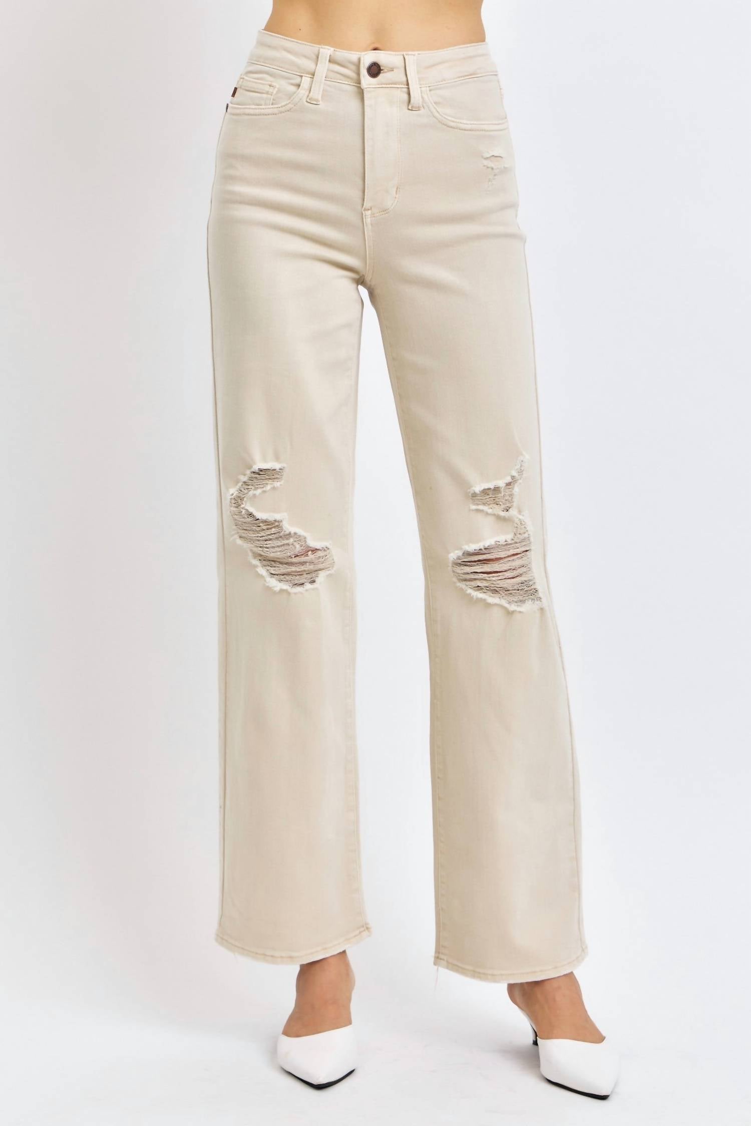 Pair these straight leg jeans with flats, sandals or even heels! You can't go wrong. Discover the Judy Blue High Waist Garment Dyed 90's Straight Denim Jeans in a distinctive bone hue. Made from a cotton blend, these jeans offer a relaxed fit with a straight leg style, ideal for spring fashion. Designed with a high-rise waist, button closure, and practical pockets, they merge comfort with everyday practicality. Care for these textured jeans by turning them inside out, washing in cold water, and airing dry or using a low tumble setting. Available in sizes ranging from 0(24) to 15(32) and inclusive plus sizes from 14W to 24W, with a front rise of 11" or 12.25" and an inseam of 32".