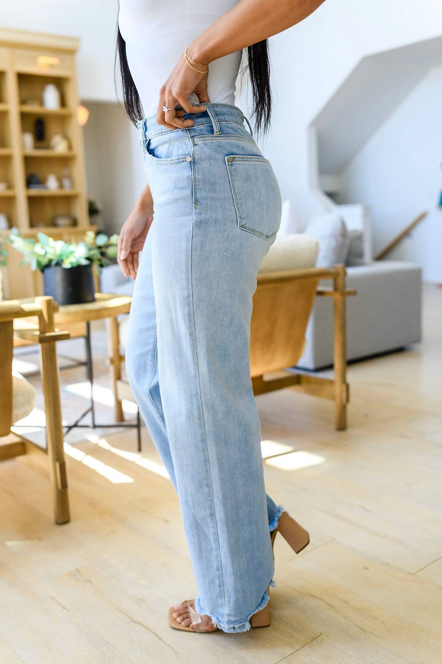 These must-have jeans are fit to perfection. Discover the Tate High Rise Straight Jeans by Judy Blue, designed to combine comfort and vintage appeal. Featuring a high rib cage rise and a straight silhouette, these jeans boast a distressed raw hem and a light denim wash to enhance your look. Crafted with a 4-way stretch fabric blend, they're composed of 66% Cotton, 21% Polyester, 11% Rayon, and 2% Spandex for effortless movement. Closure type: Zip closure. Available in various sizes, these jeans promise a true-to-size fit, making them the perfect addition to your fall wardrobe for any occasion, from workwear to vacation.