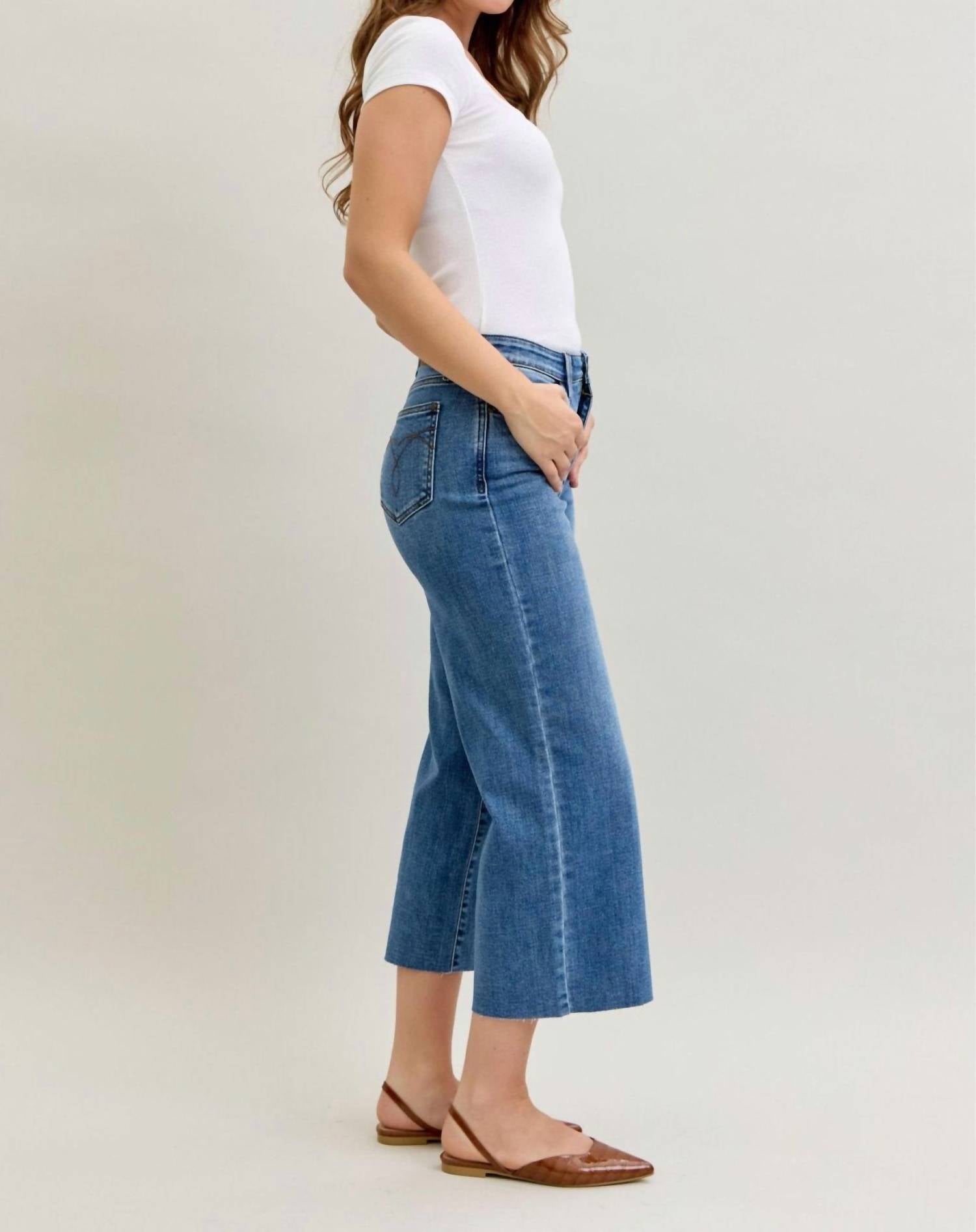 The perfect cropped jean for those transitional seasons. Discover the High Waist Wide Crop Classic Raw Hem Jeans by Judy Blue, an essential addition to any wardrobe for a blend of comfort and style. These women's pants feature a classic high-rise waist and a flattering wide leg style in a medium wash. Crafted from a soft cotton blend comprising 93% cotton, 6% polyester, and 1% spandex, they offer flexibility and all-day wearability. Closure: Zip closure. The cropped length perfectly showcases your favorite footwear, while the solid blue color adds to their versatility.