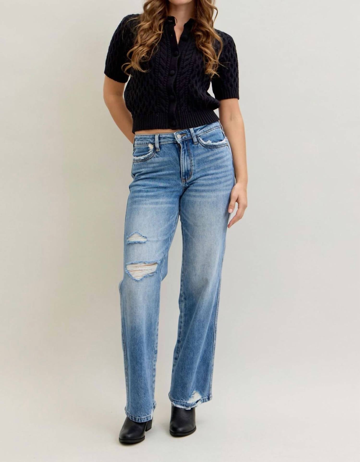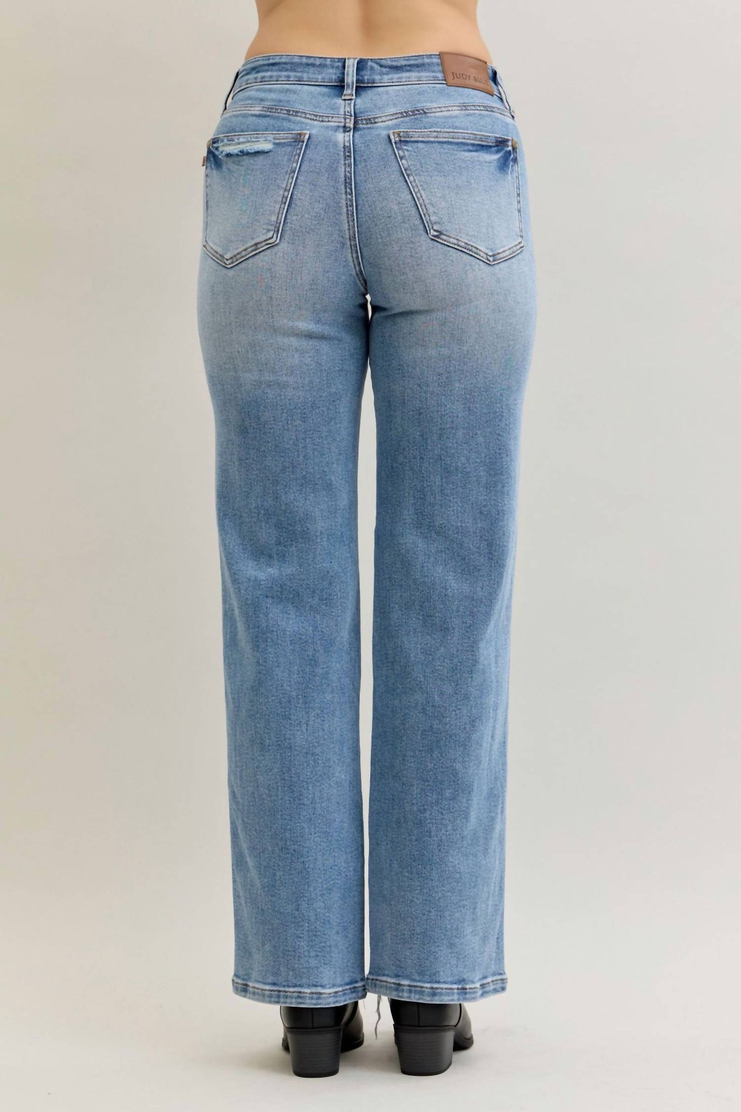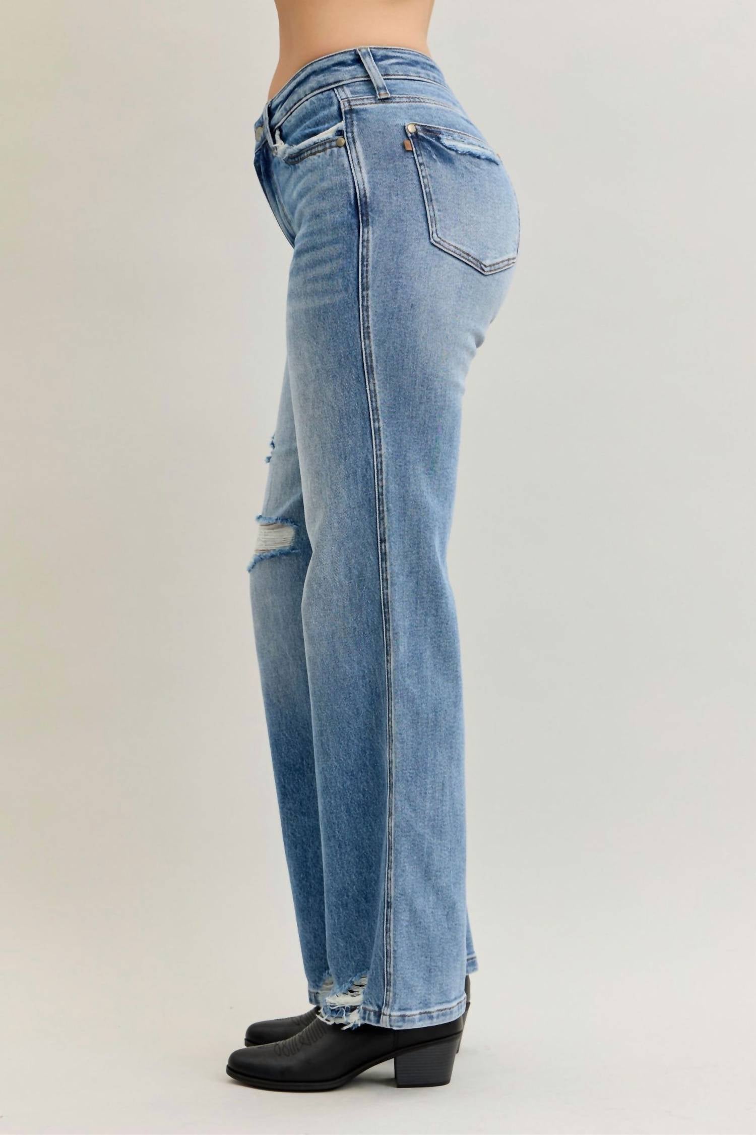 Pair these straight leg jeans with flats, sandals or even heels! You can't go wrong. Experience the timeless charm of the 90's Destroy Denim by Judy Blue, an essential addition to any wardrobe. Crafted for women with a mid-rise and straight leg style, these jeans feature a unique textured pattern in a medium wash. The front panel is 100% cotton, while the back provides comfort with 94% cotton, 5% polyester, and 1% spandex. With a button closure, a relaxed fit, and practical pockets, these jeans boast a front rise of 10 inches and an inseam of 32 inches. Care: Machine wash. Perfect for streetwear, travel, and fall occasions like Thanksgiving.