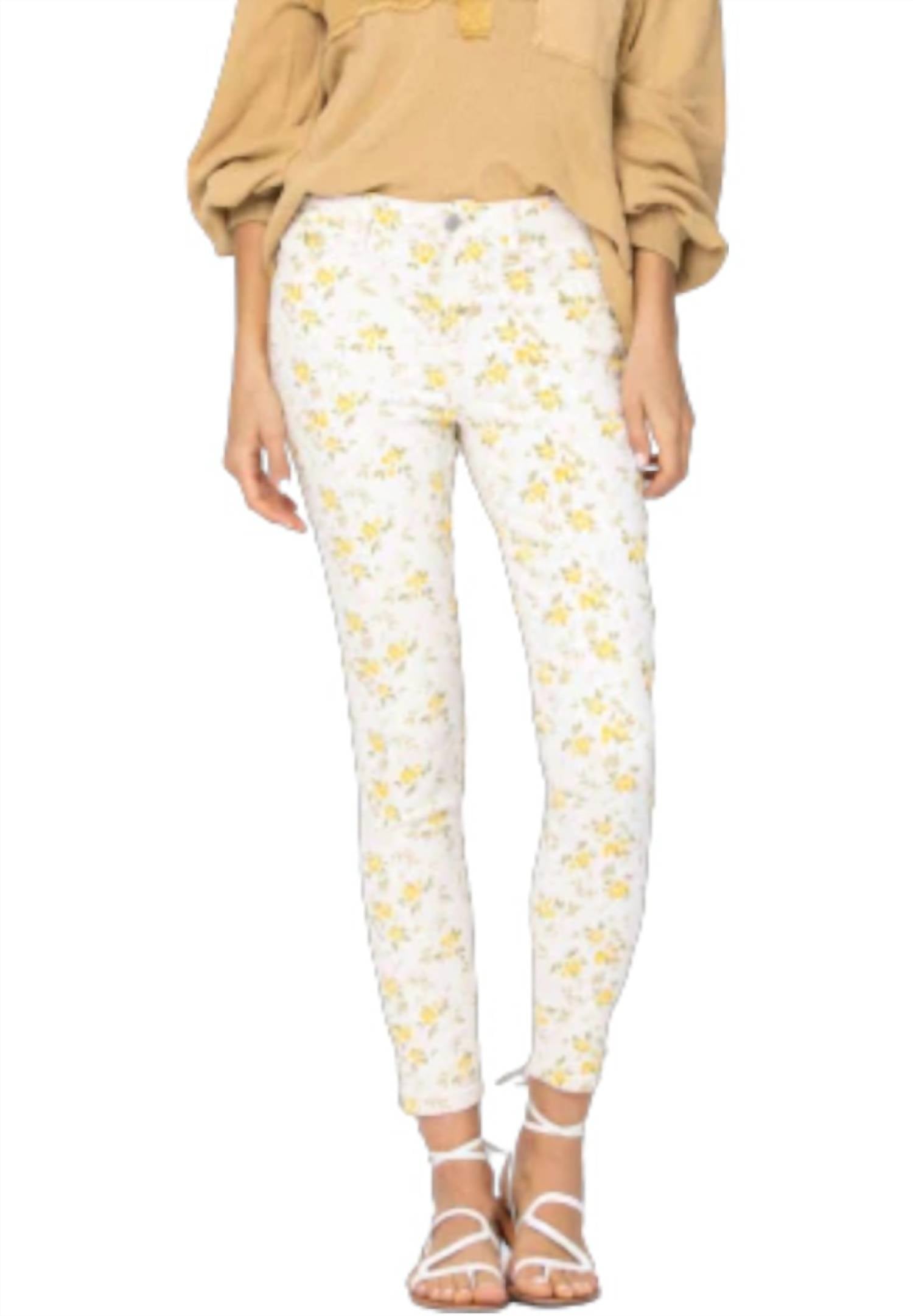 The perfect skinny jeans to wear with your favorite boots this season! Introducing the Floral Print Midrise Skinny Jeans by Judy Blue, your perfect fusion of comfort and fashion. These Yellow floral jeans are crafted from a Cotton blend, ensuring a flattering fit with a flexible 2% Spandex addition. The pair features a slim fit with a mid rise and a skinny leg style, completed with a convenient zip closure and pockets for practicality. Care for these stylish jeans is simple with machine wash and tumble dry instructions. Enjoy a rise of 9.75" and an inseam of 27".