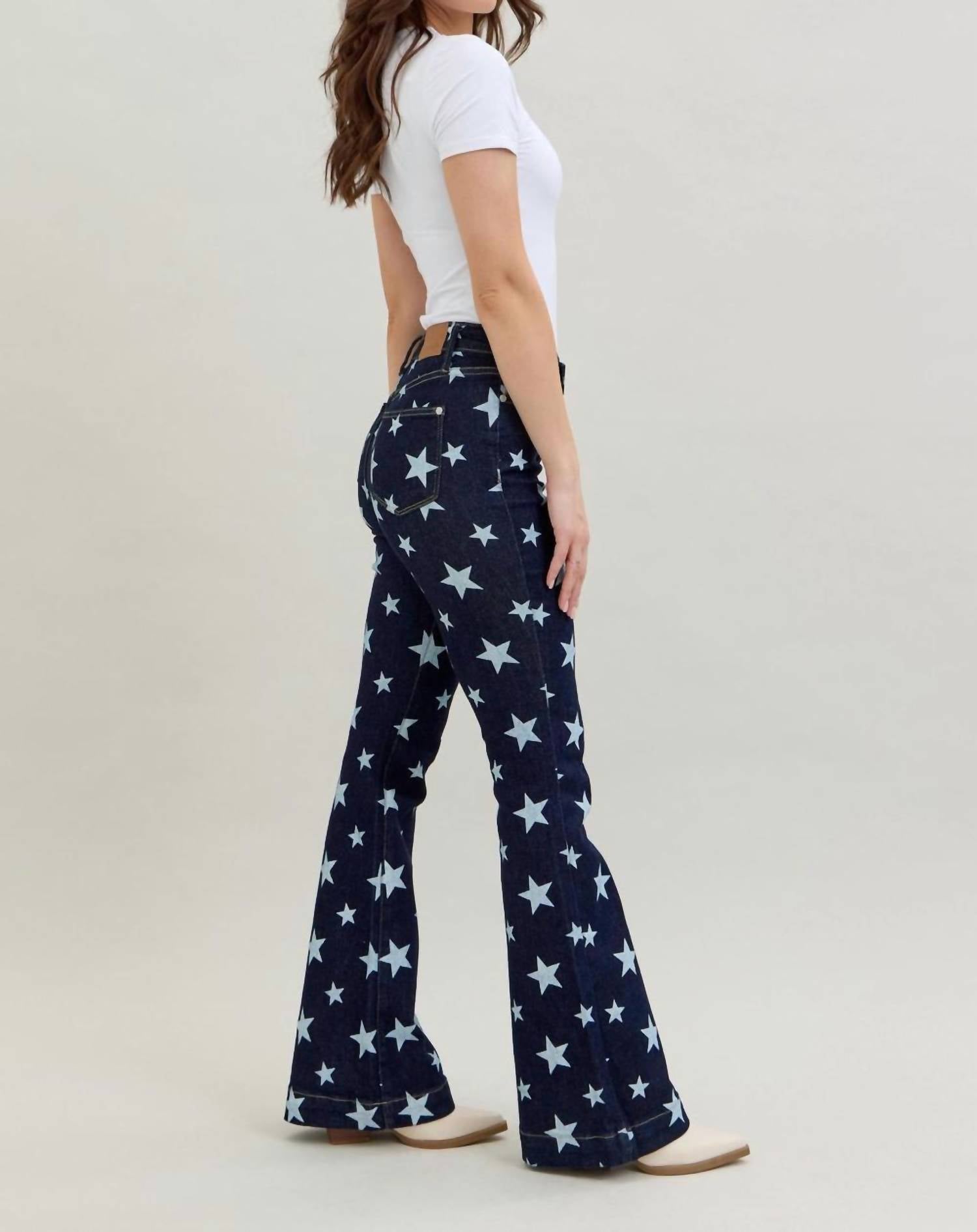 A flattering silhouette that's suprisingly versatile. Unveil your bold side with the Judy Blue High Waist All Over Star Print Flare Jeans, perfect for making a stylish statement. These jeans offer a relaxed fit with a high rise and feature a flared leg for an elongated silhouette. Crafted from a comfortable cotton blend, they boast an eye-catching star print and rinse wash. Closure: Button closure. Care: Machine wash cold on gentle, tumble dry low. With a front rise of 11" and inseam of 33", they are ideal for adding personality to your wardrobe effortlessly. Model Info: Wearing size 1 (5'9" height, 24" waist, 36" hips).