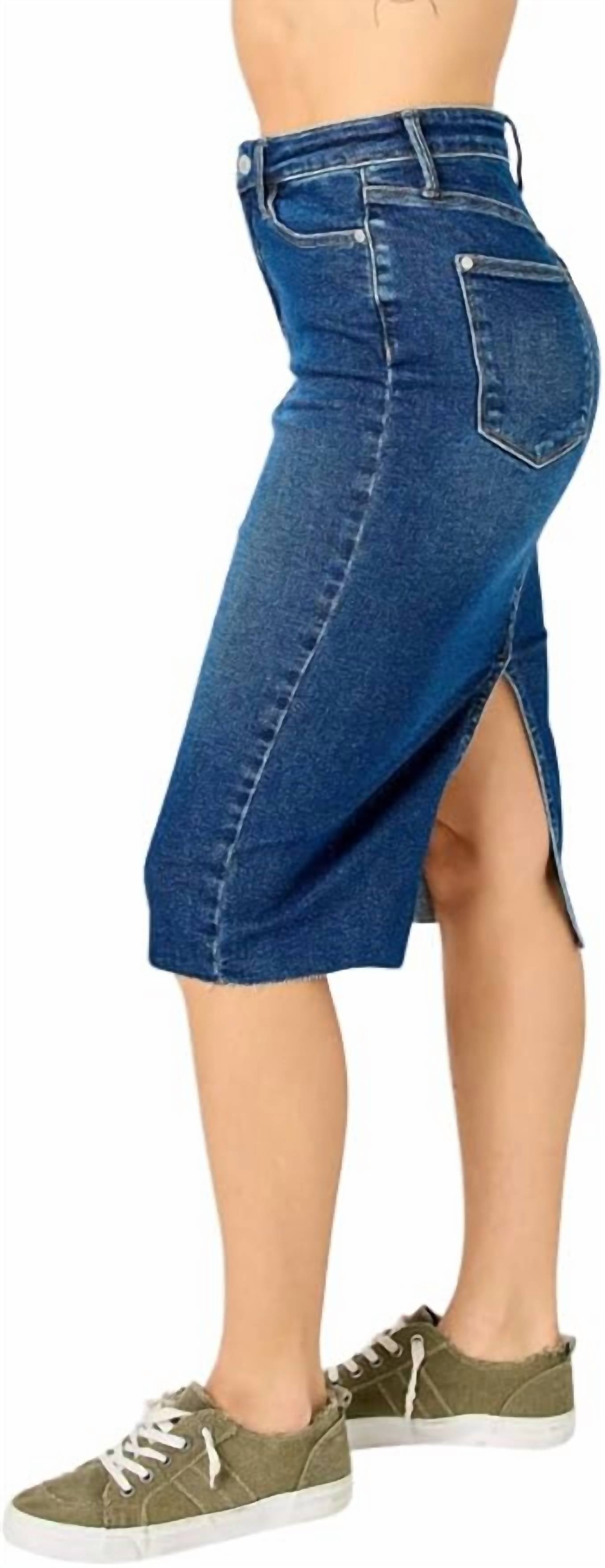 Tuck your favorite tee into this midi length skirt for an effortlessly cool look. Embrace a timeless aesthetic with the Judy Blue High Waist Back Slit Midi Denim Skirt, a perfect blend of style and comfort. This women's skirt in dark wash features a solid pattern with a flattering high waist and back slit, adding a touch of flirtatious charm to your look. Crafted from a cotton blend of 94% Cotton, 5% Polyester, and 1% Spandex, it offers a comfortable stretch for all-day wear, secured with a button closure. Dimensions: Front length 27.25", center back length 28.75". Ideal for a music festival or any seasonal outings, simply machine wash to maintain its fresh look.