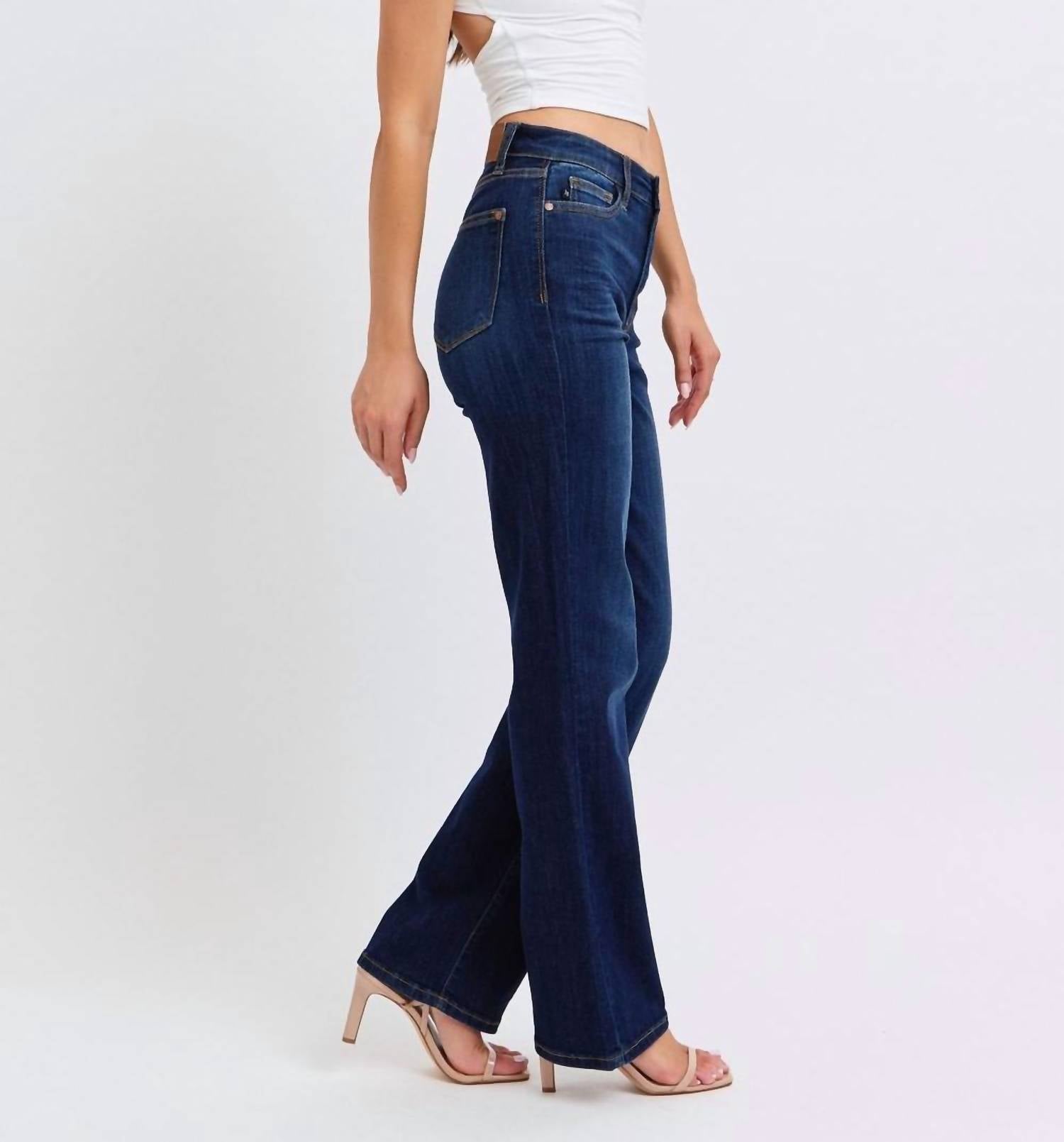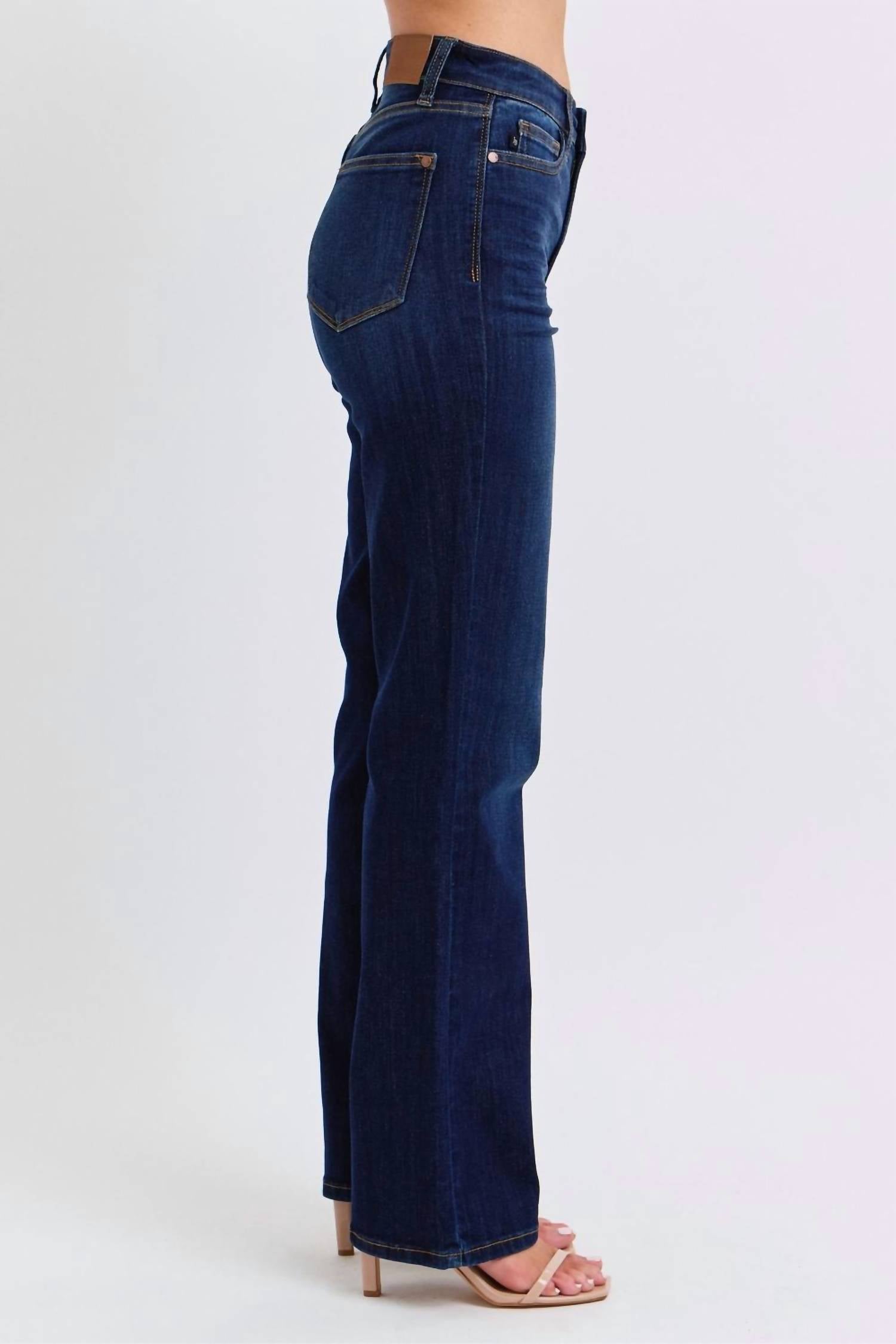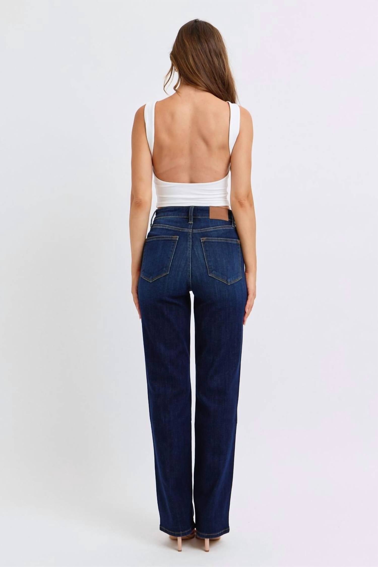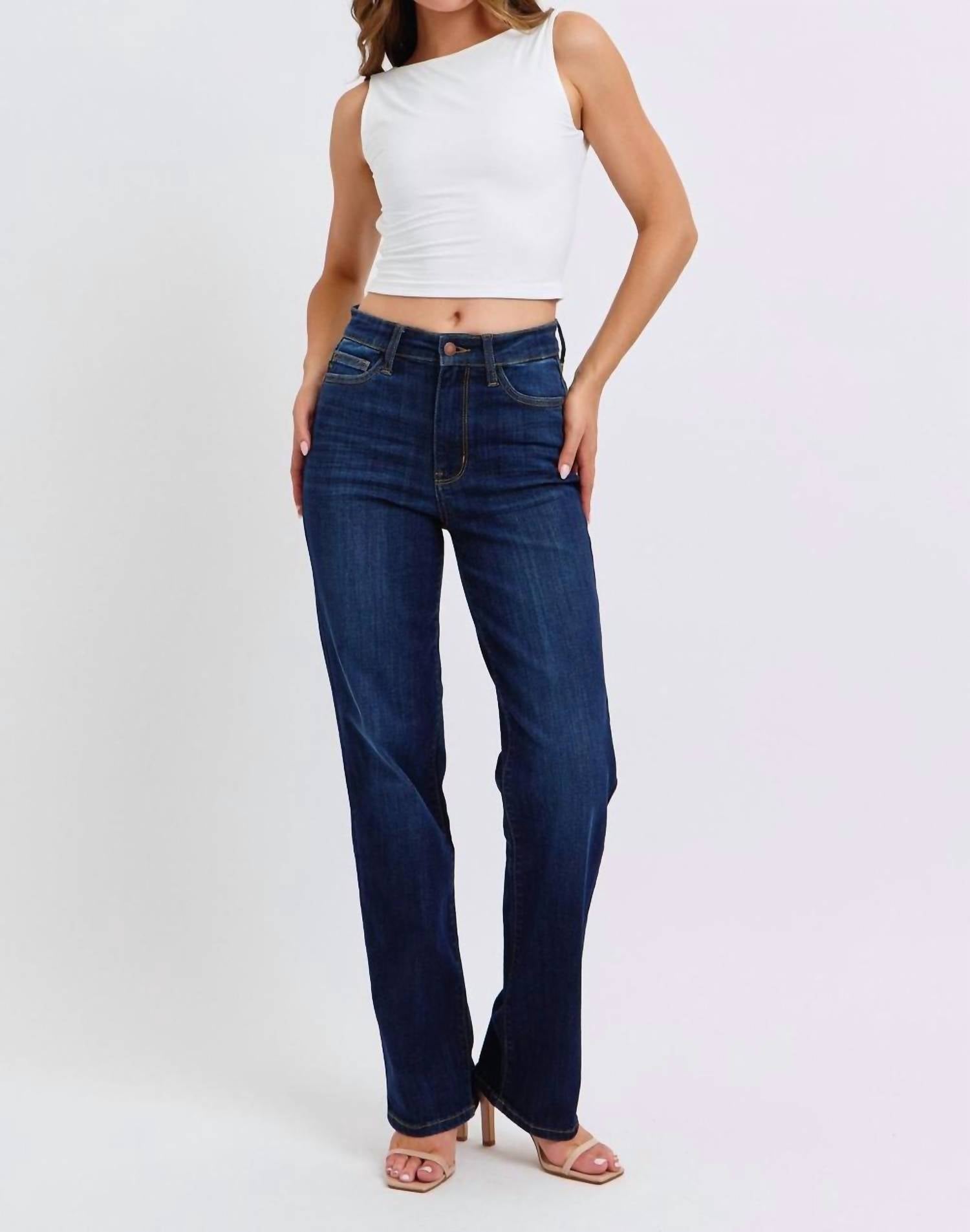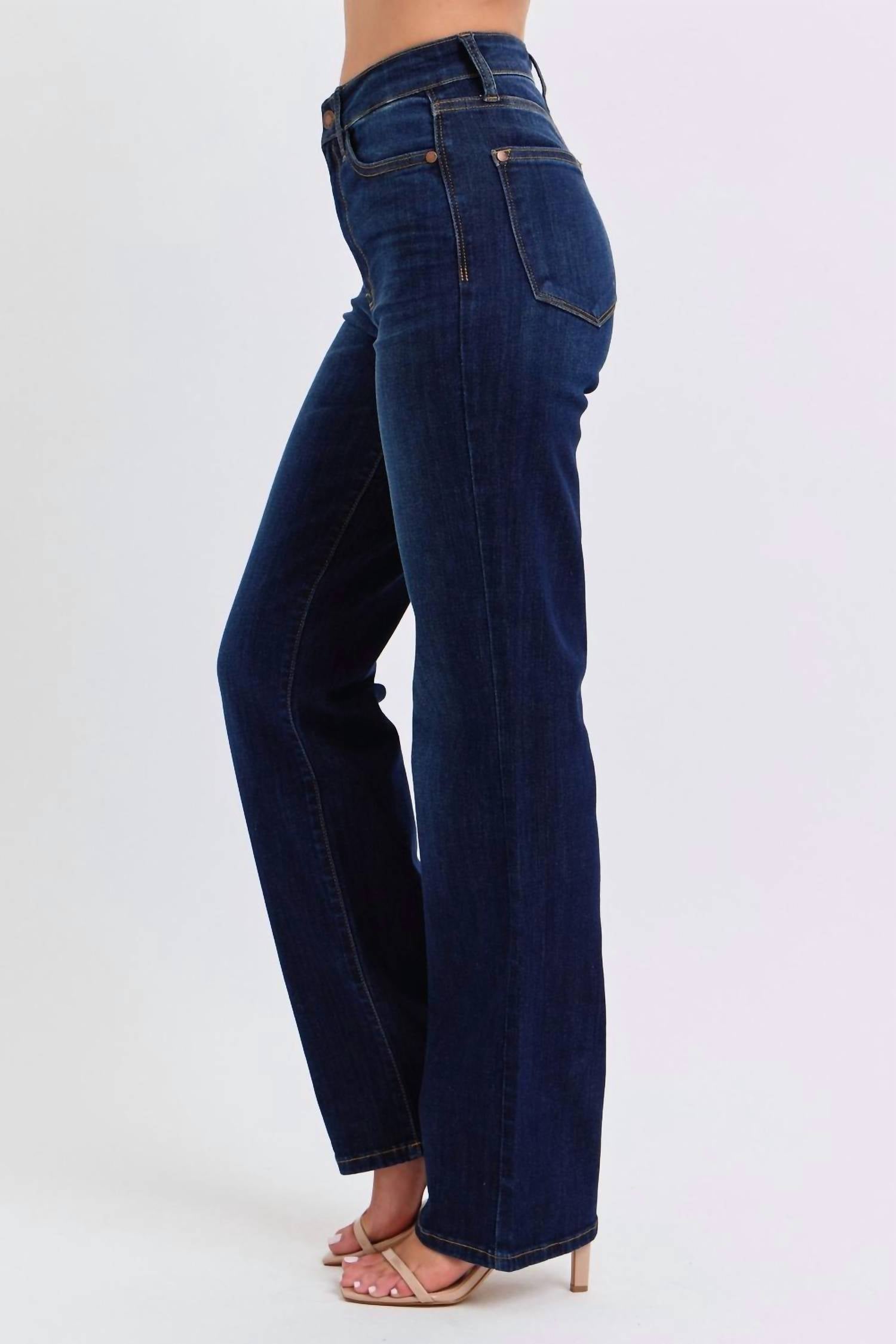 Discover the Judy Blue High Waist Straight Denim Jeans in a sleek dark wash, designed to complement any wardrobe with its refined, non-distressed hemmed finish. Crafted from a soft and flexible cotton blend of 52% Cotton, 23% Polyester, 22% Rayon, and 3% Spandex, these jeans provide a high-rise and straight-leg silhouette that flatters the figure. Closure: Zip closure. Dimensions for Plus Size: Front Rise 12", Inseam 32". Care instructions: Machine wash cold, tumble dry. Perfect for stylish versatility, these jeans effortlessly transition from office wear to weekend casual.