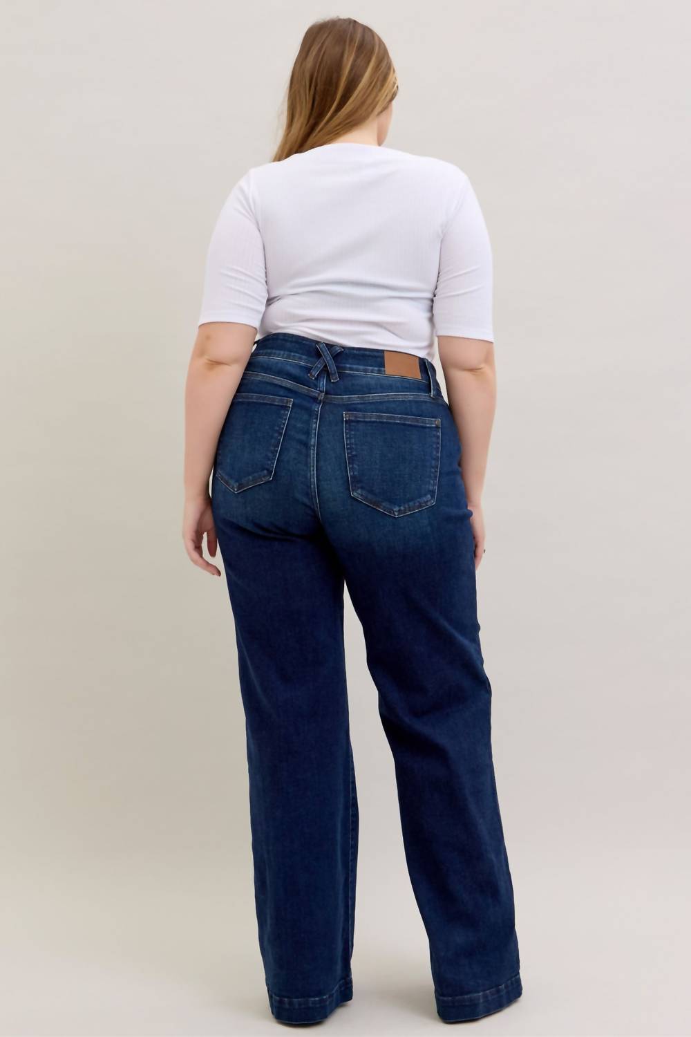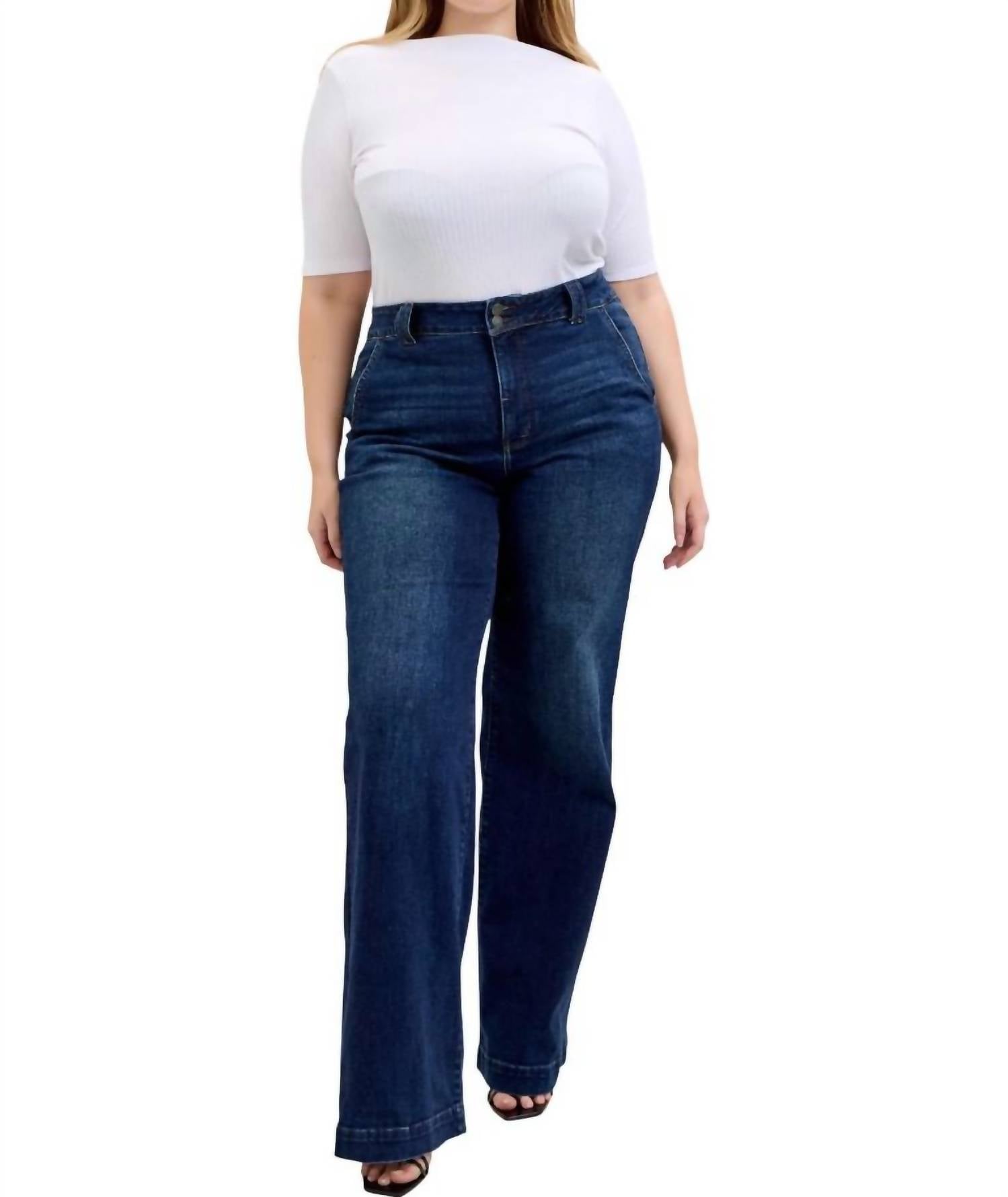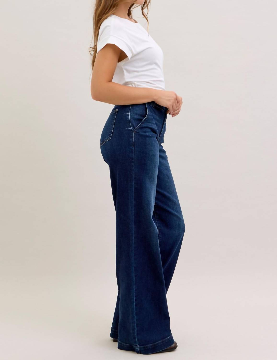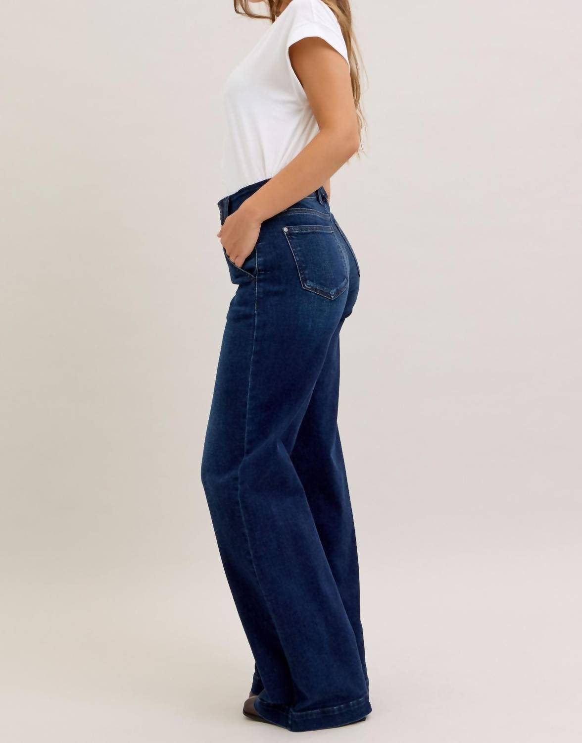 Fit to perfection, we love these high-waist jeans and you will too. Experience effortless style and comfort with the Judy Blue High Waist Trouser Wide Leg Jeans, perfect for any occasion. Crafted from a cotton blend composed of 93% Cotton, 6% Polyester, and 1% Spandex, these jeans feature a flattering high-rise fit and classic wide leg cut. The long 35" inseam and dark wash complete the look, making them versatile for casual and dressier settings. Closure is achieved through a button closure, and for maintenance, simply machine wash and line dry.