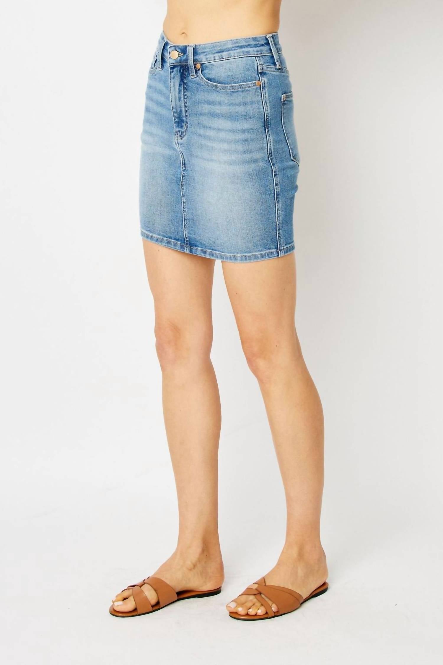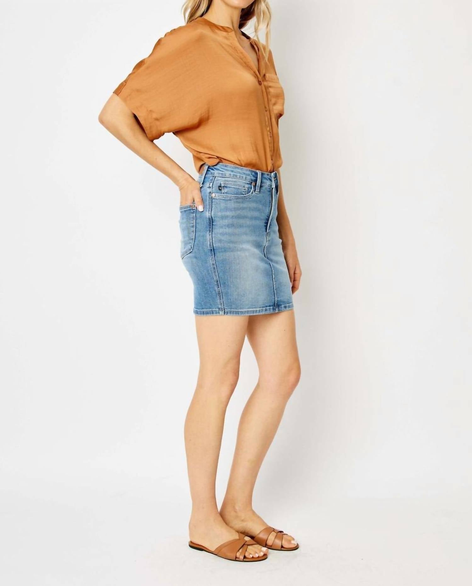 Show just the right amount of leg in this fit flattering mini. Step into style with the Judy Blue High Waist Tummy Control Denim Skirt, a must-have for any wardrobe. This mini skirt in classic denim features a flattering high waist and a tummy control panel for added support. It's composed of 94% Cotton, 5% Polyester, and 1% Spandex, offering a soft, stretchy feel. Closure: Button closure. Care: Turn inside out before washing, machine wash cold, tumble dry low, or hang to dry. Available in a stripe pattern and complete with pockets, this skirt is perfect for effortless minimalist style on your next vacation. Front Rise: Sizes S–XL are 16.5" | Sizes 1XL–3XL are 18.5". Center Back: 20".