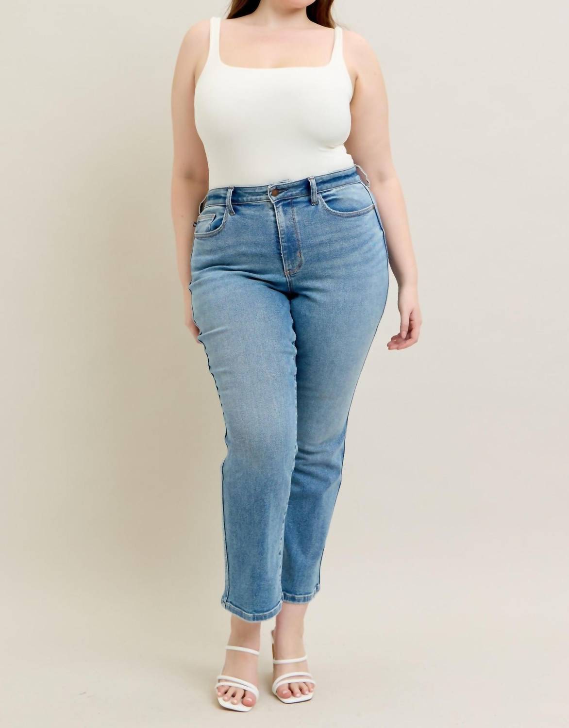 These must-have jeans are fit to perfection. Discover the Judy Blue High Waist Vintage Straight Jeans, a perfect blend of timeless charm and modern comfort. Crafted from a durable cotton blend comprised of 65% Cotton, 20% Polyester, 9% Rayon, 4% T400, and 2% Spandex, these jeans offer a flattering high-rise fit with a medium wash and clean straight leg styling. The jeans feature a consistent 30.5" inseam across all sizes and a button closure for easy wear. To maintain their stylish look, machine wash and lay flat to dry. Whether you're heading to a dinner party or enjoying a casual outing, these jeans are designed to suit your minimalist style. Model Info Regular: Size 1, 5'8" height, 25" waist, 36" hips. Model Info Plus: Size 14W, 5'10" height, 36" waist, 50" hips.