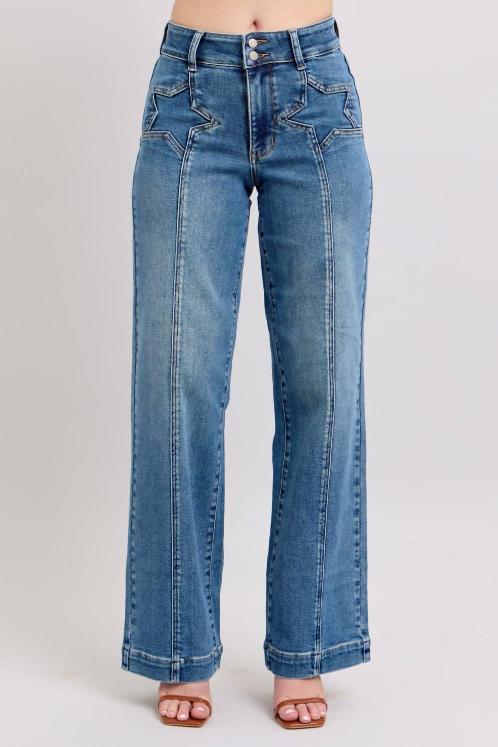 Just as cute as they are comfortable. 94% Cotton, 5% Polyester, 1% Spandex HW Star & Front Seam Detail Wide Rise: 11" Inseam: 33"