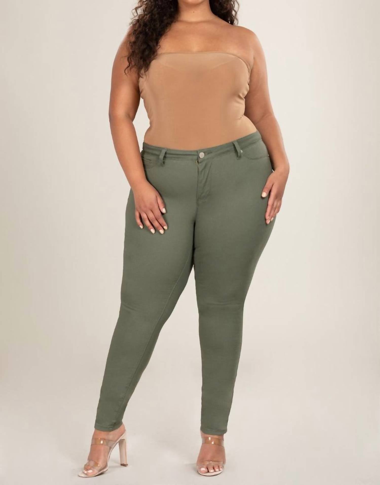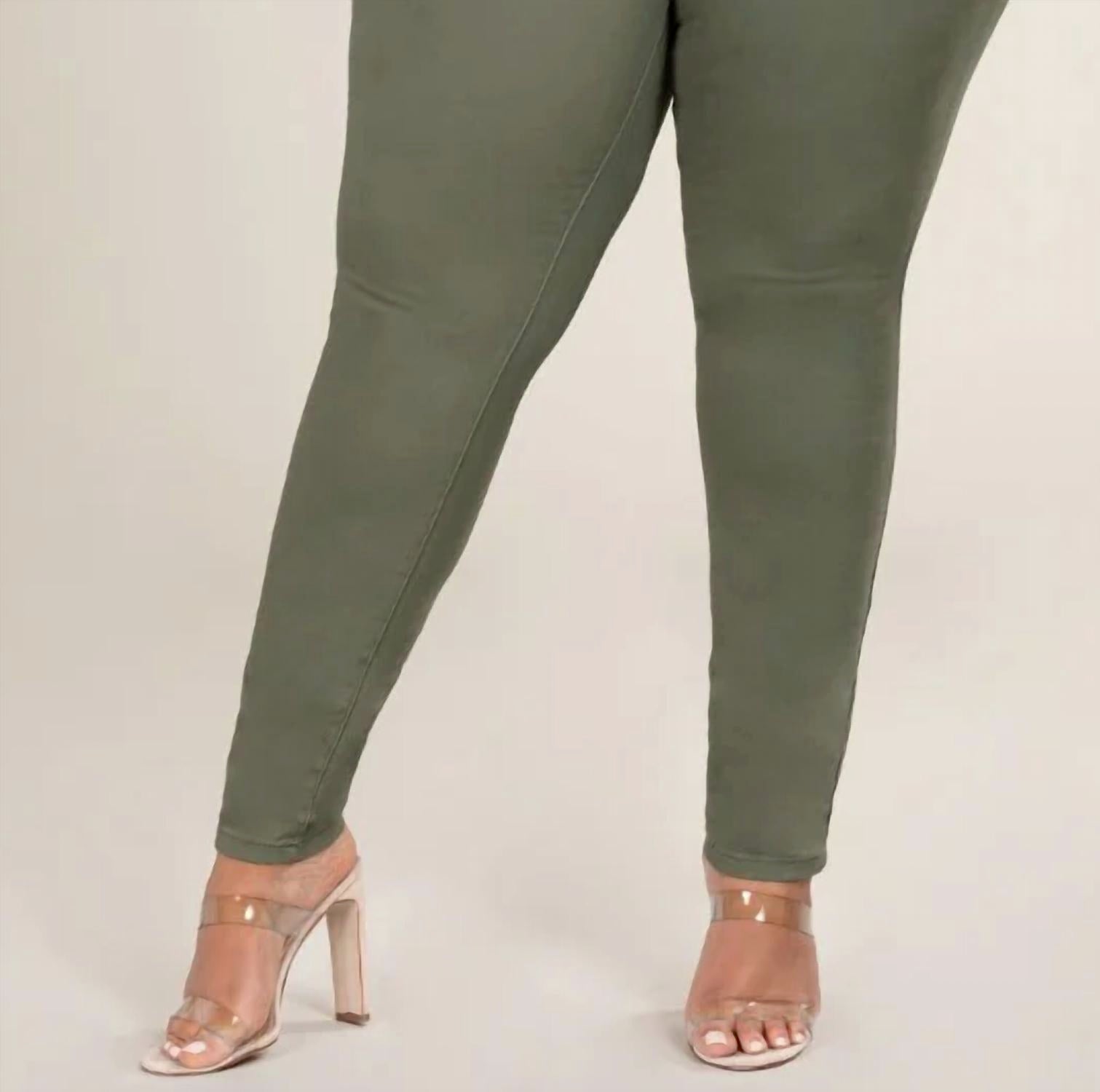 A skinny jean that is both flatering and comfortable. We love this style because it works great with boots, or without! Introducing the High Waisted Skinny Jeans Plus by Judy Blue, designed to offer stylish comfort in a perfect olive hue. With a solid pattern and slim fit, these jeans feature a classic skinny leg and high rise, enhanced by a convenient button closure. Crafted from a blend of 98% cotton and 2% spandex, they provide all-day comfort for women seeking minimalist fashion. Ideal for holiday parties or spring outings, they effortlessly complement any wardrobe.