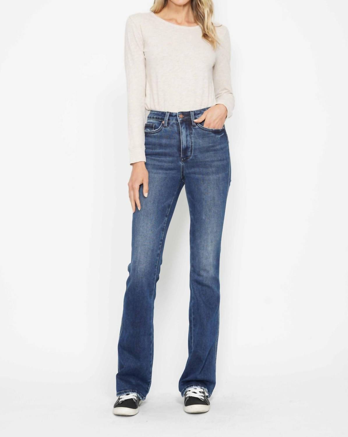 A boot-cut jean that not only looks good on, you'll be comfortable in them all day. Introducing the high-waisted Tummy Control Jeans by Judy Blue, perfect for versatile Spring streetwear or dinner party occasions. These blue, medium wash jeans feature a bootcut leg style and solid pattern with a button closure for a secure fit. Made from a comfortable cotton blend of 76.2% cotton, 22.5% polyester, and 1.3% spandex, they boast an 11" high rise and 32" inseam, complete with pockets and an embroidered back pocket detail. Care instructions: machine wash and lay flat to dry. Model is wearing a Judy Blue size 1 (5'9" height, 24" waist, 34" hips).