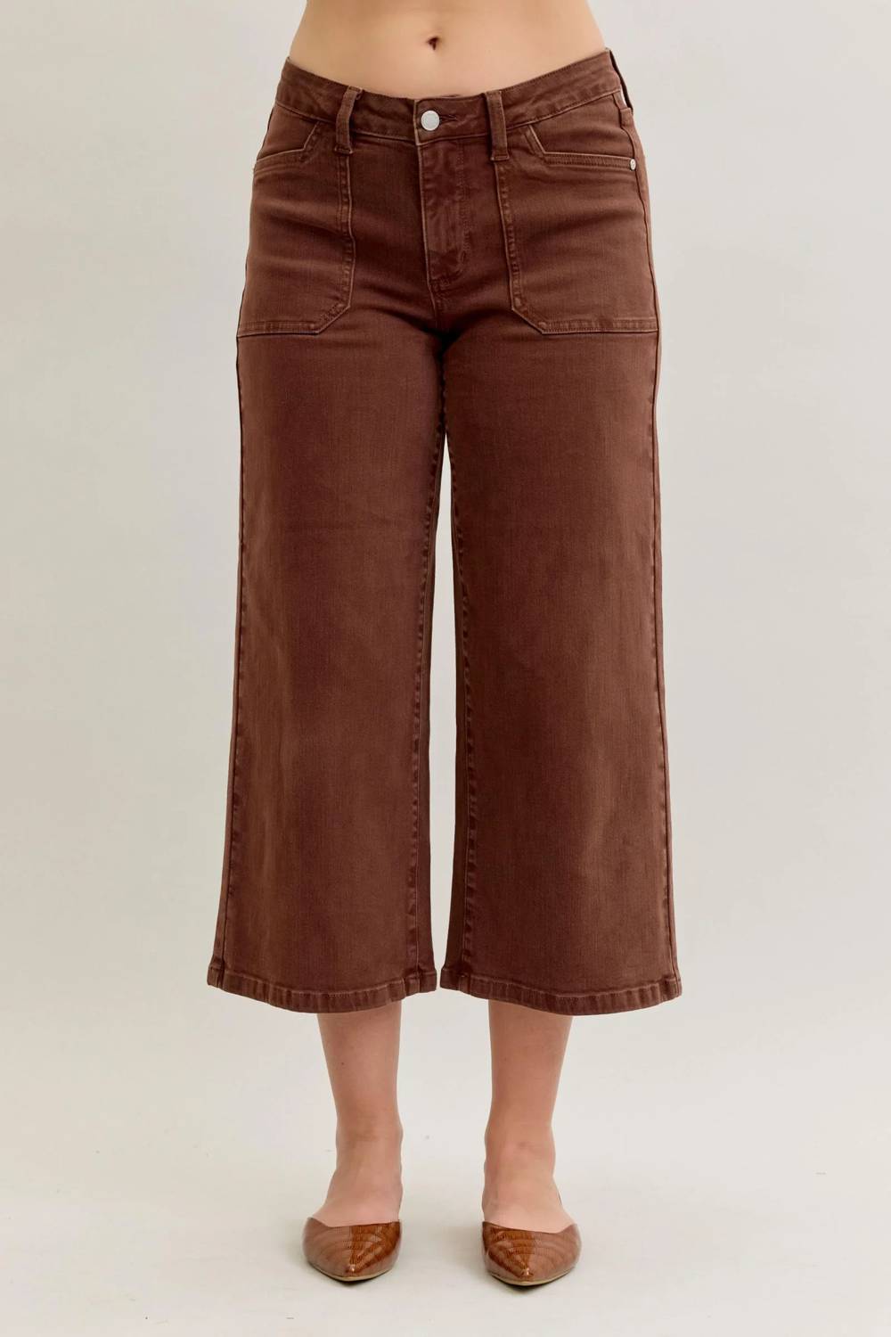 The perfect cropped jean for those transitional seasons. These jeans are cocoa brown in color and have a mid-rise waistband measuring 9 3/4 inches. The inseam is 24 1/2 inches with a wide cropped leg style. They feature utility front pockets and are garment dyed. The fabric composition is 93% cotton, 6% polyester, and 1% spandex.