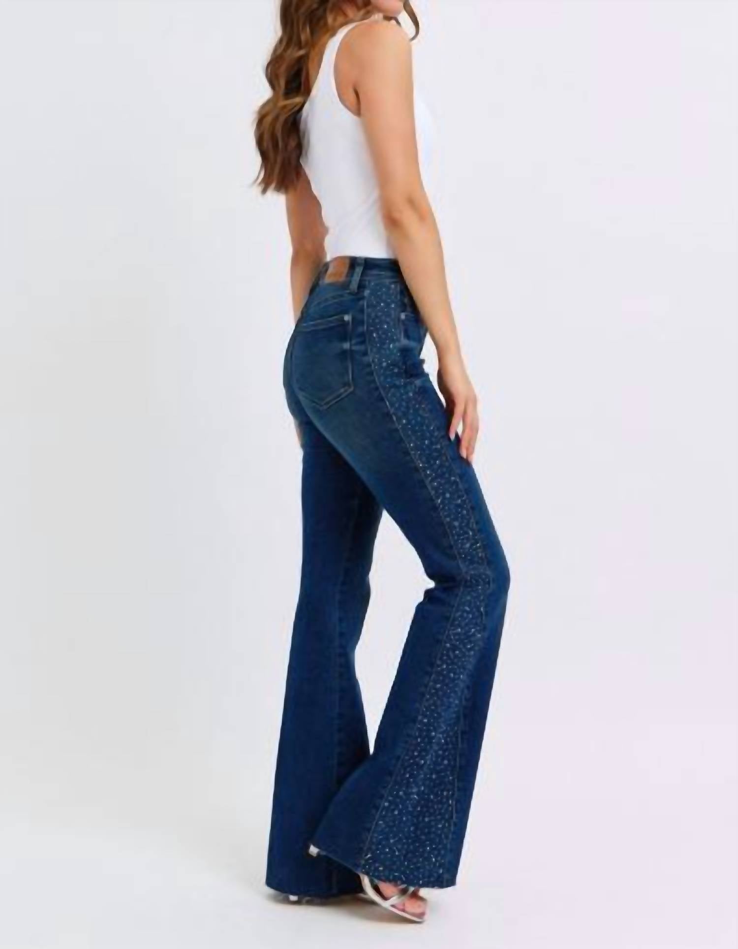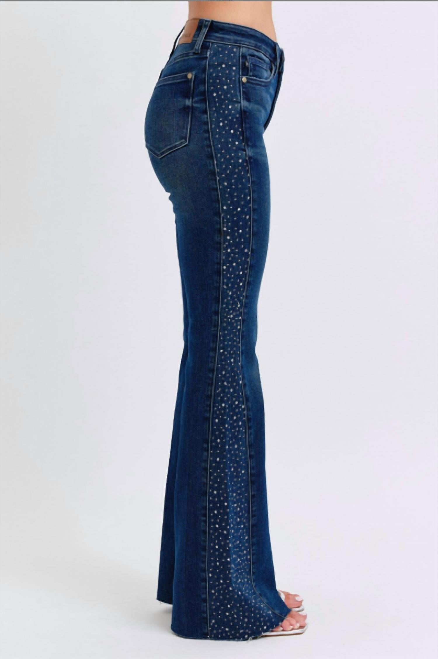 Experience the stylish comfort of Judy Blue's Mid Rise Dark Rhinestone Side Panel Detail Flare Jeans, perfect for adding a touch of glamour to your casual wear. With a composition of 76.2% Cotton, 22.5% Polyester, and 1.3% Spandex, these jeans ensure a regular fit with a flattering flared leg and a mid-rise waist. Boasting a practical zip closure, they feature a rise of 10" and an inseam of 33.5", designed for the modern woman who loves a versatile wardrobe staple. Care for these jeans is made easy with machine wash and tumble dry instructions, making them ideal for your summer travel needs. Model is wearing a Judy Blue size 1, standing at 5'8" with a 25" waist and 36" hips.